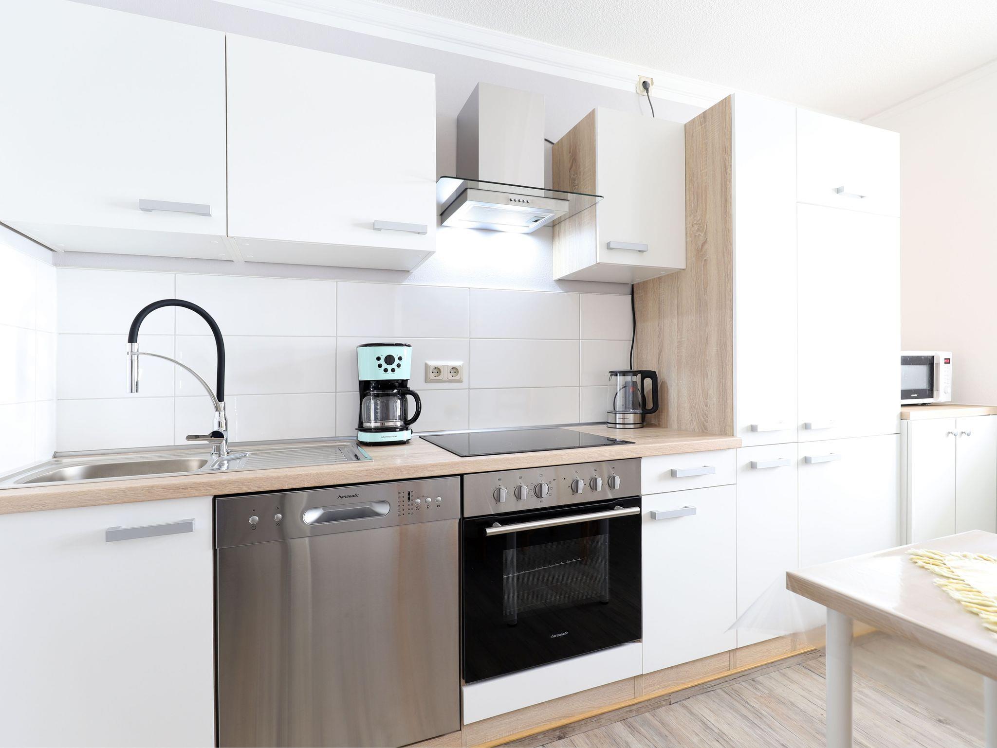 Die Ferienwohnung hat eine separate und voll ausgestattete Küche mit Ceranherd, Spülmaschine, Kühlschrank mit Gefrierfach. Alles an Geschirr, Töpfen und Pfannen sowie Besteck, Microwelle, Kaffeemaschine, Babystuhl, viele verschiedene Gläser, Tisch mit Stühlen und einiges mehr sind vorhanden.