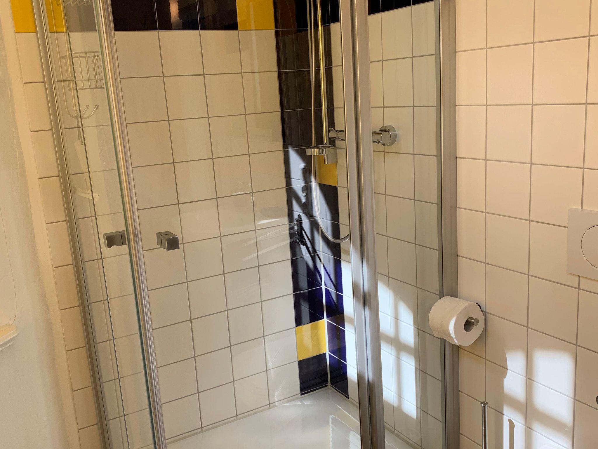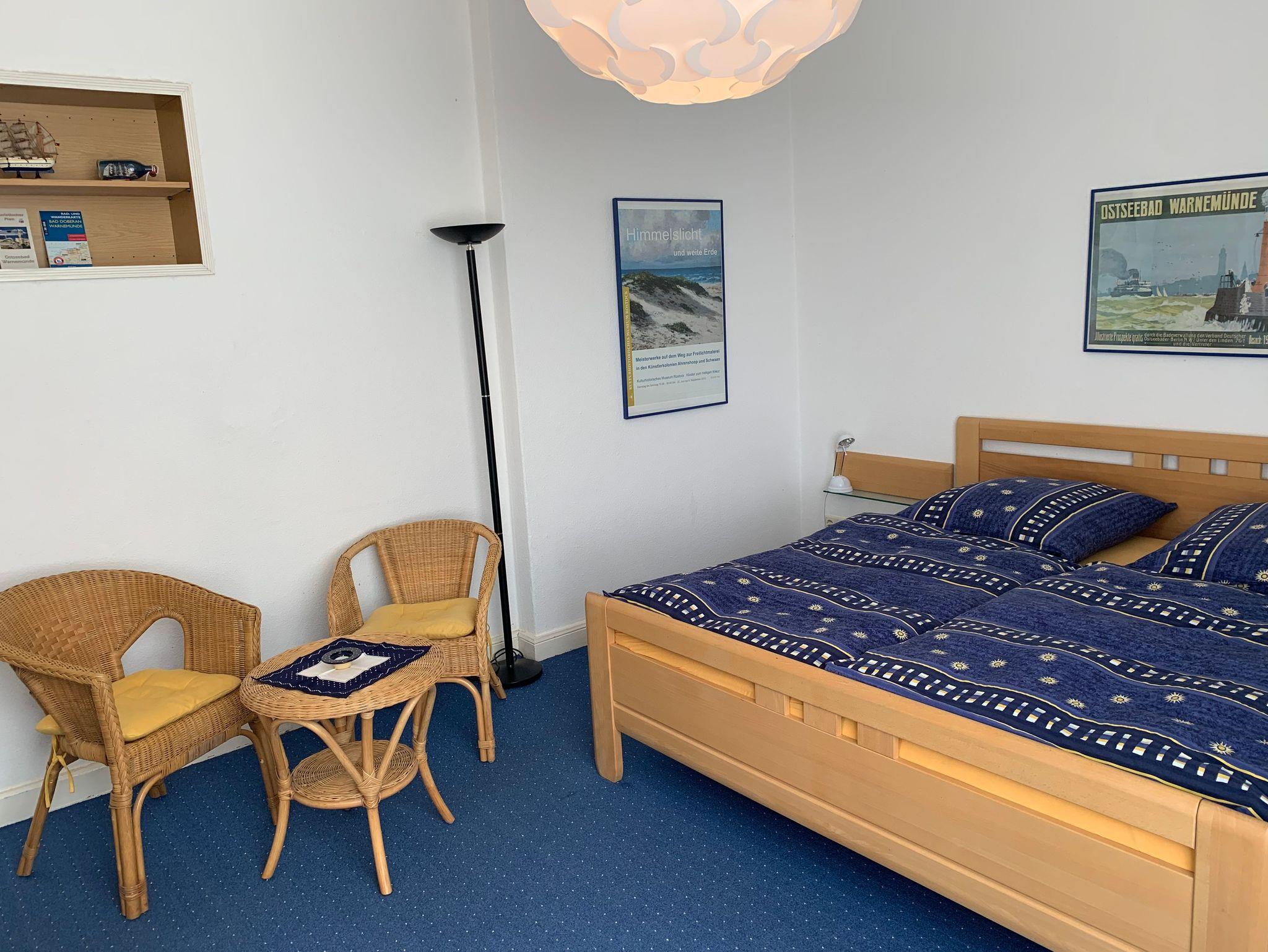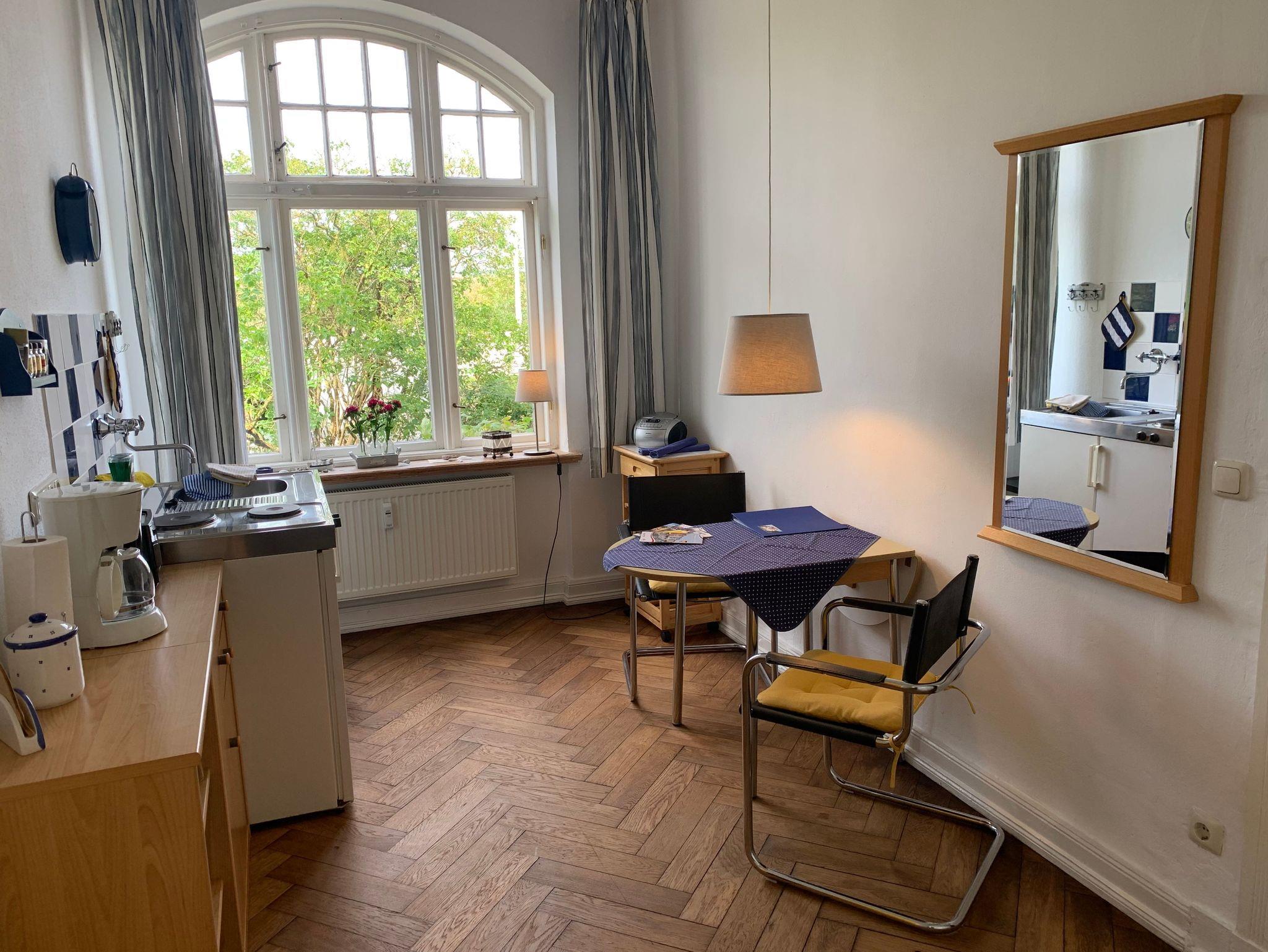 Die Wohnung im EG besitzt einen großzügigen kombinierten Wohn- Schlafraum mit Stuckdecken, maritim in Blautönen gehalten. Doppelbett und Kleiderschrank sind aus allergikerfreundlichem Buchenholz, weiter eine Wohnküche, sowie ein Tageslichtbad. Zur Wohnung gehört ein Sitzbereich im Garten.