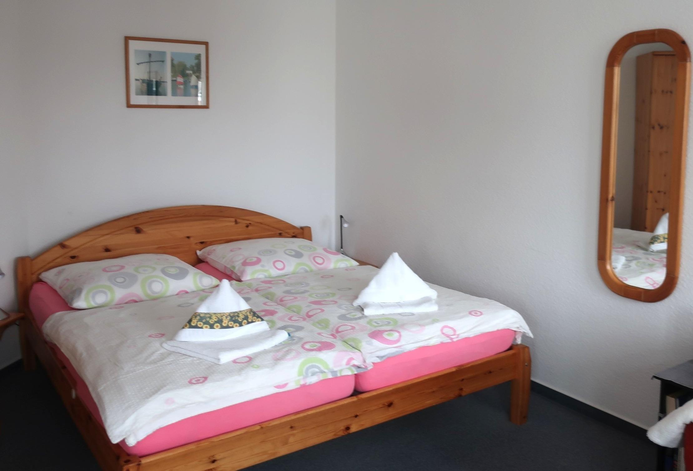 Das Doppelbett (180 cm x 200cm) und ein Kleiderschrank stehen separat im Zimmer. Das Bad ist mit einem Waschbecken, Toilette und Dusche ausgestattet. Seife und ein Fön sind vorhanden.