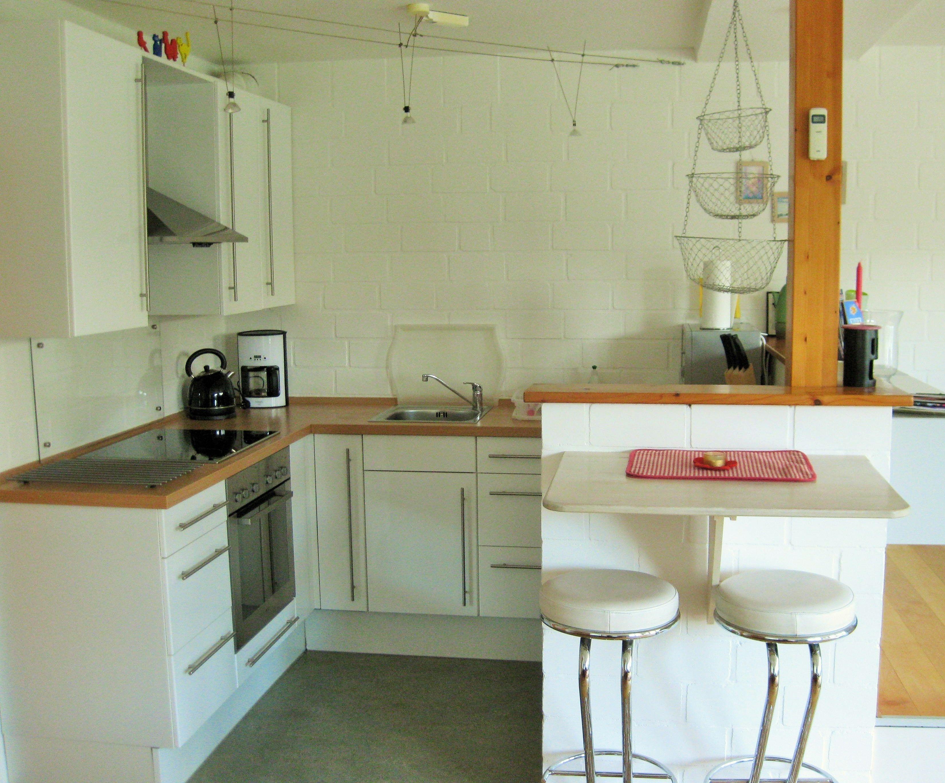 Die Küche ist eine U-förmige Einbauküche mit Kühlschrank, Herd, Mikrowelle, Kaffeemaschine, Wasserkocher, Toaster, sowie Besteck und Geschirr für mindestens 4 Personen.