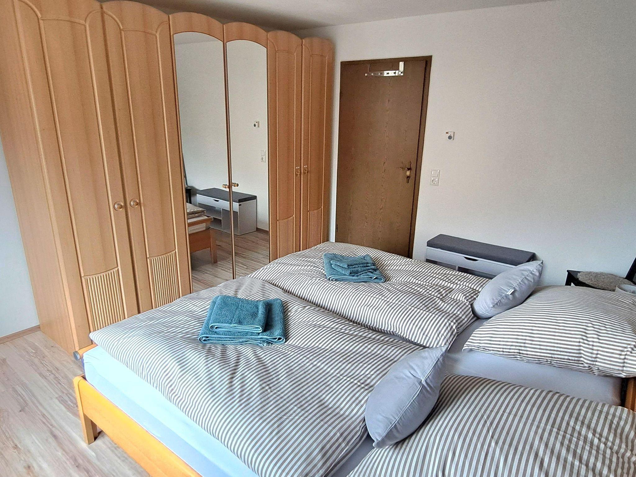 Das Schlafzimmer ist mit einem Doppelbett sowie einem großen Kleiderschrank ausgestattet und direkt am Badezimmer gelegen.