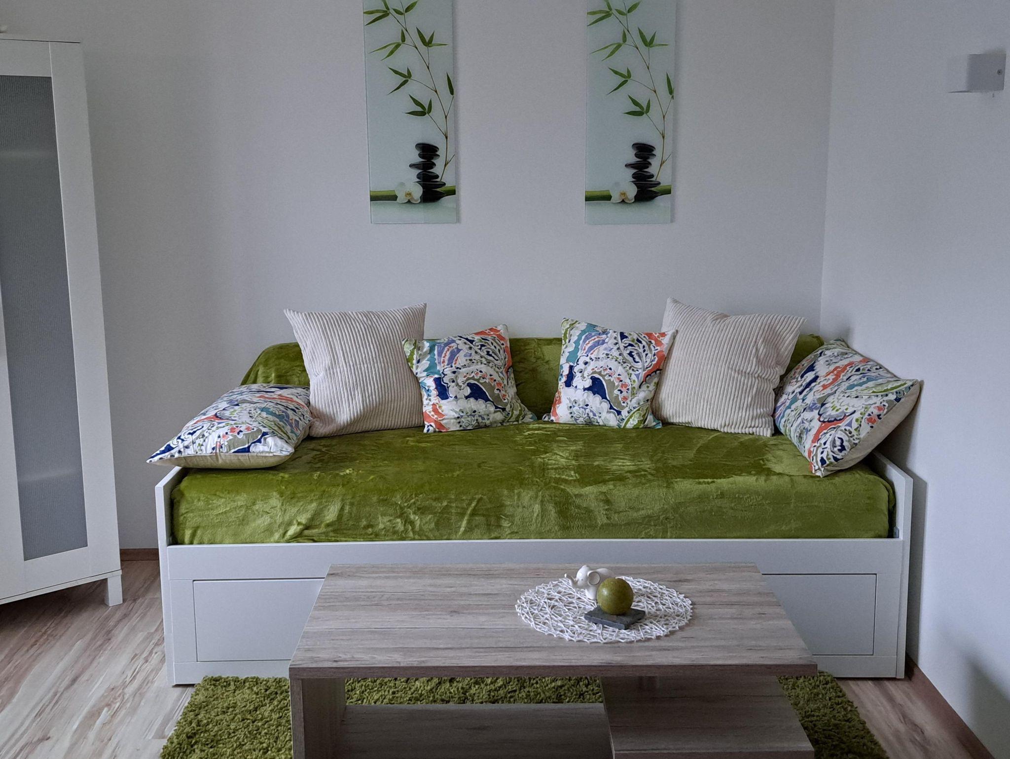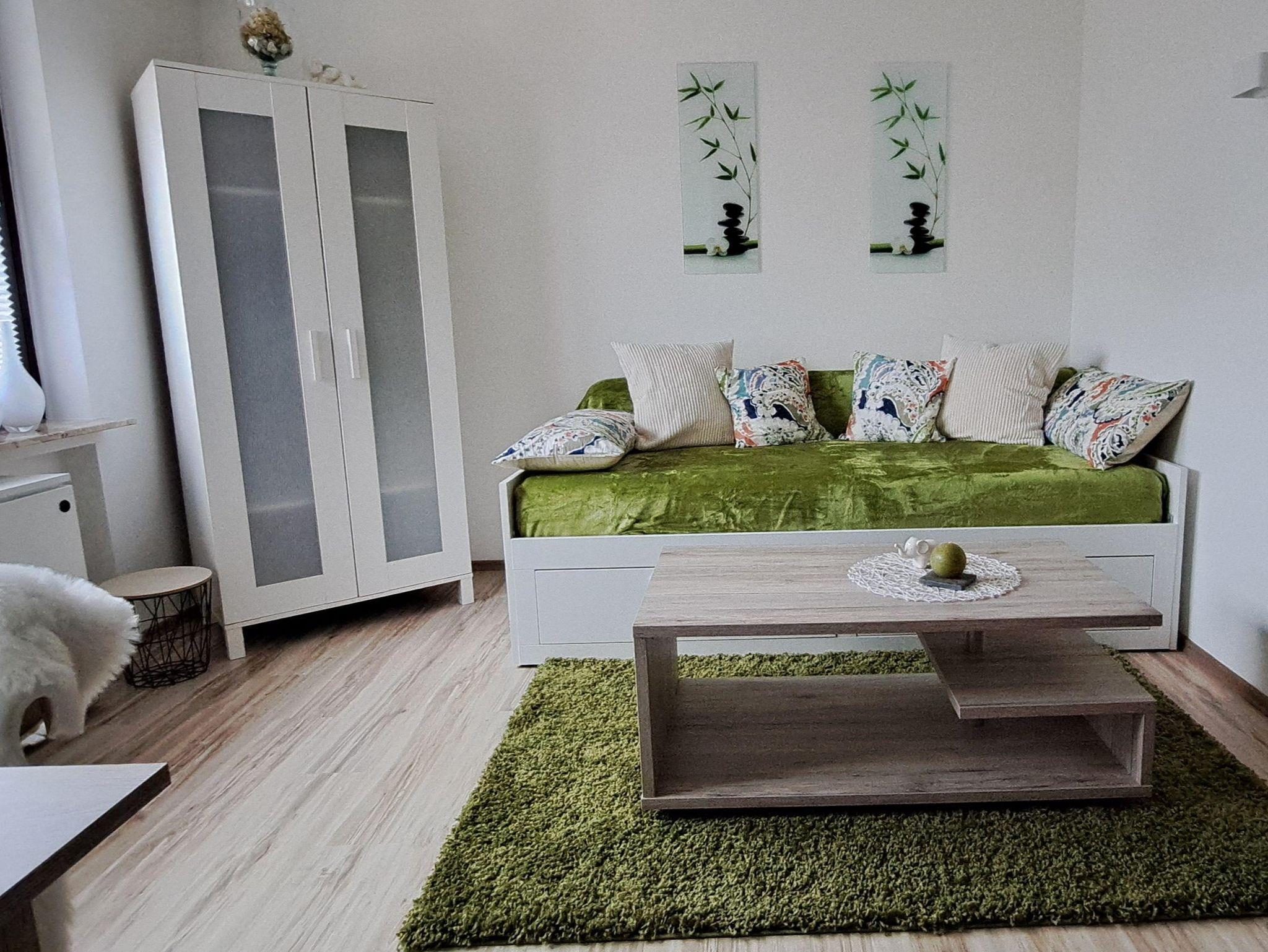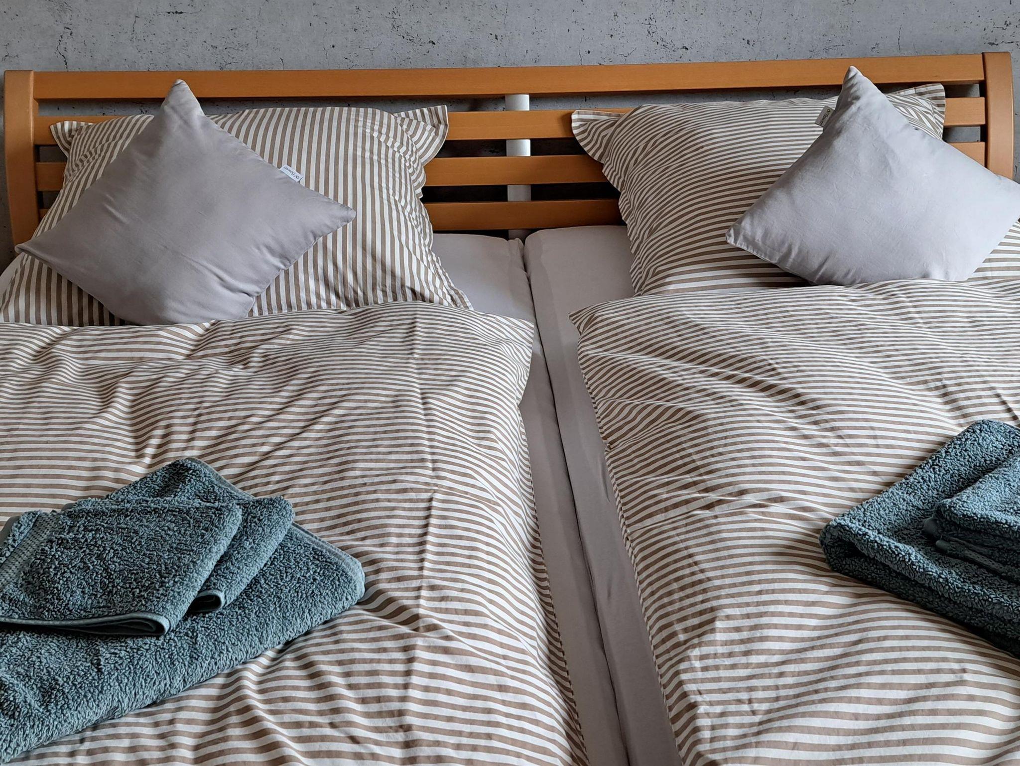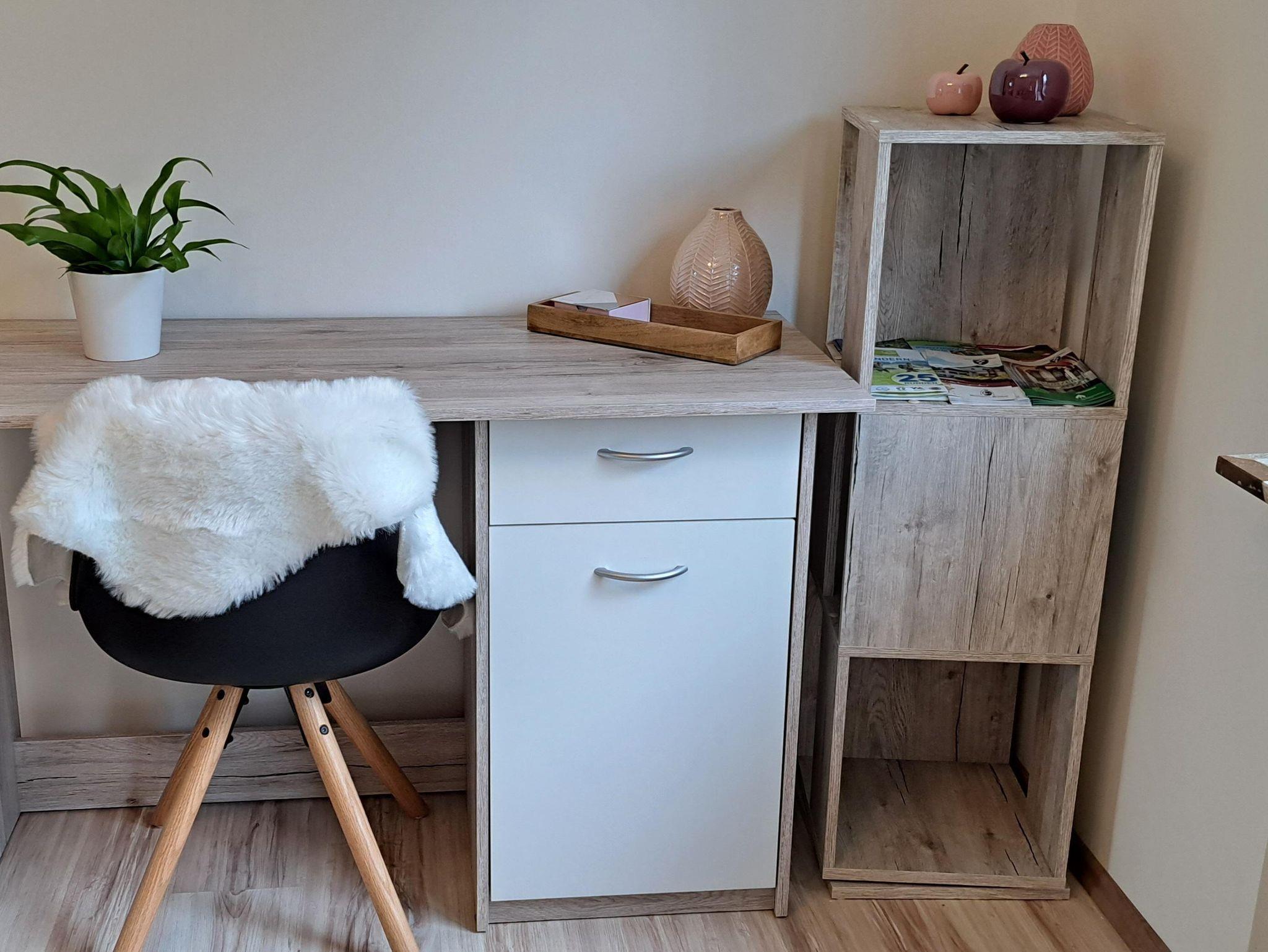 Das kleinere Schlafzimmer verfügt über ein Ausziehbett mit 2 Matratzen. Angrenzend befindet sich das Gäste WC, daher müssen die Gäste nicht durch das andere Schlafzimmer um zur Toilette zu gelangen. In diesem Zimmer befindet sich auch ein Schreibtisch, sodass die Ferienwohnung ideal geeignet ist, Urlaub und Arbeit zu verbinden (Workation im Westerwald).