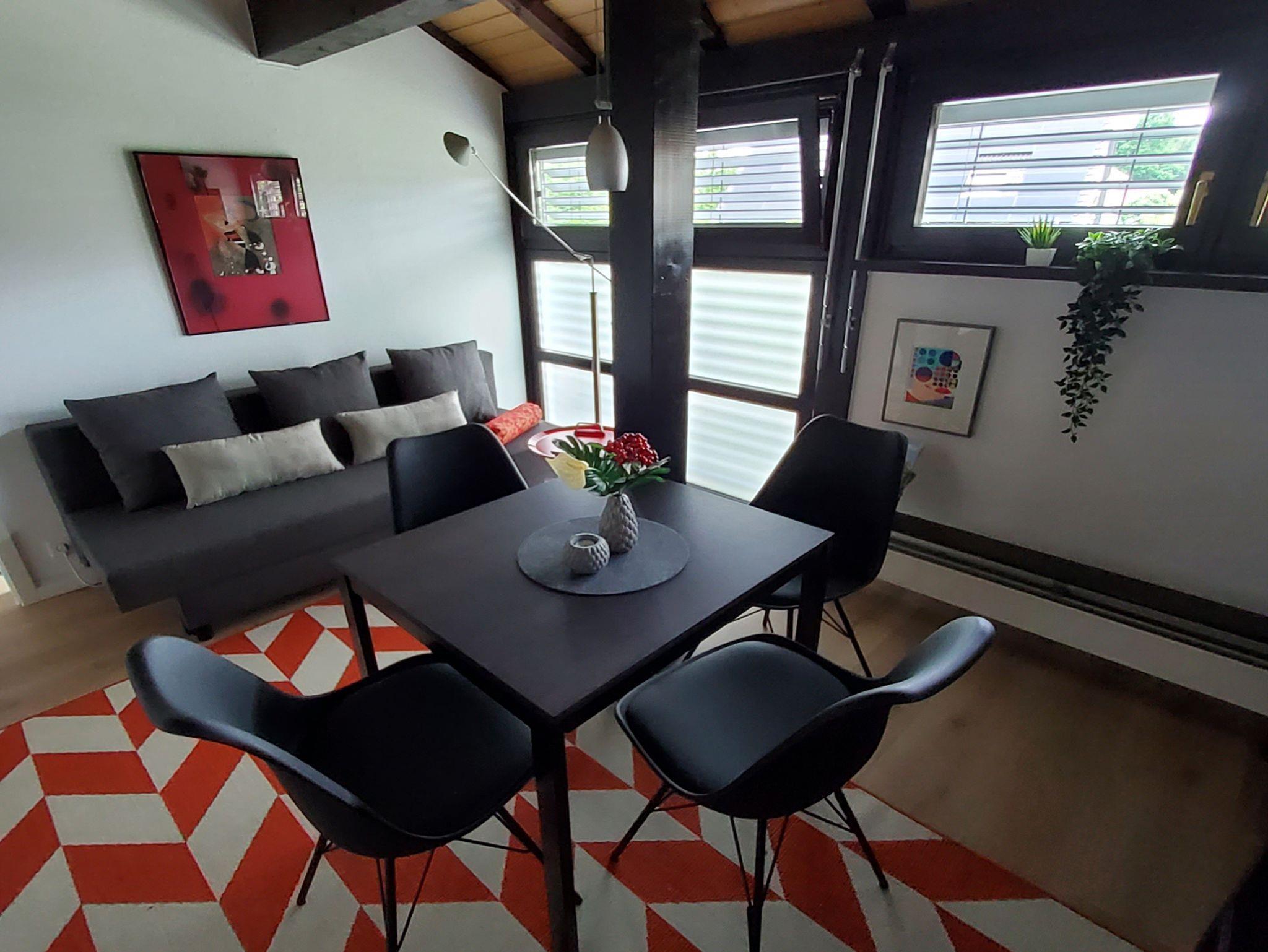 Schlafen wie im Hotel – Wohnen wie zuhause! Diese stilvoll eingerichtete Wohnung für bis zu drei Personen befindet sich im ersten Stock eines charmanten Zweifamilienholzhauses mit separatem Zugang über eine Außentreppe. Helle Räume, elegante Holzbalkendecken und Glasschiebetüren schaffen ein behagliches Wohngefühl. Das Wohn-/Schlafzimmer bietet ein hochwertiges Boxspringbett, das auch als Daybed genutzt werden kann, eine gemütliche Sitzecke, TV, DAB-Radio, Ventilator, Insektenschutz und effektive Verdunkelung. Das Ankleidezimmer überzeugt mit viel Stauraum und Extras wie Bügelbrett, Bügeleisen und Wäscheständer. Das Bad ist modern ausgestattet mit Dusche, WC, Waschtisch mit Auszügen, Kosmetikspiegel, Duschhocker und Föhn. Die großzügige Wohnküche bietet alles für den Alltag: vollständige Einbauküche mit allen Geräten, Geschirr, Nespresso-Maschine, Mikrowelle und Waschtrockner sowie eine zusätzliche Schlafcouch. Außerdem steht ein teilausgebauter Dachboden zur flexiblen Nutzung. Ob als Abstellraum, Fitnessbereich oder Homeoffice – Sie gestalten Ihren Raum individuell. Wir freuen uns auf Ihren Besuch!