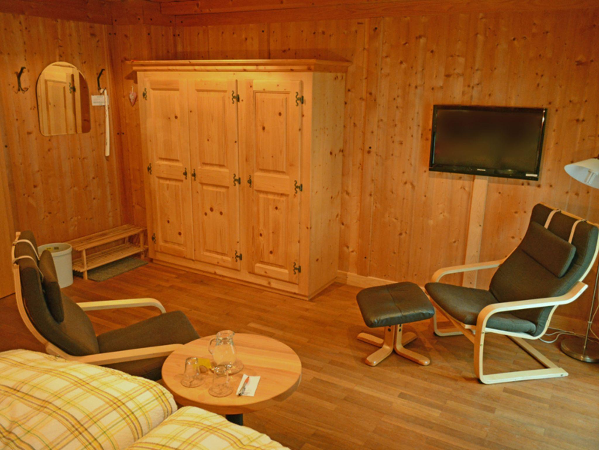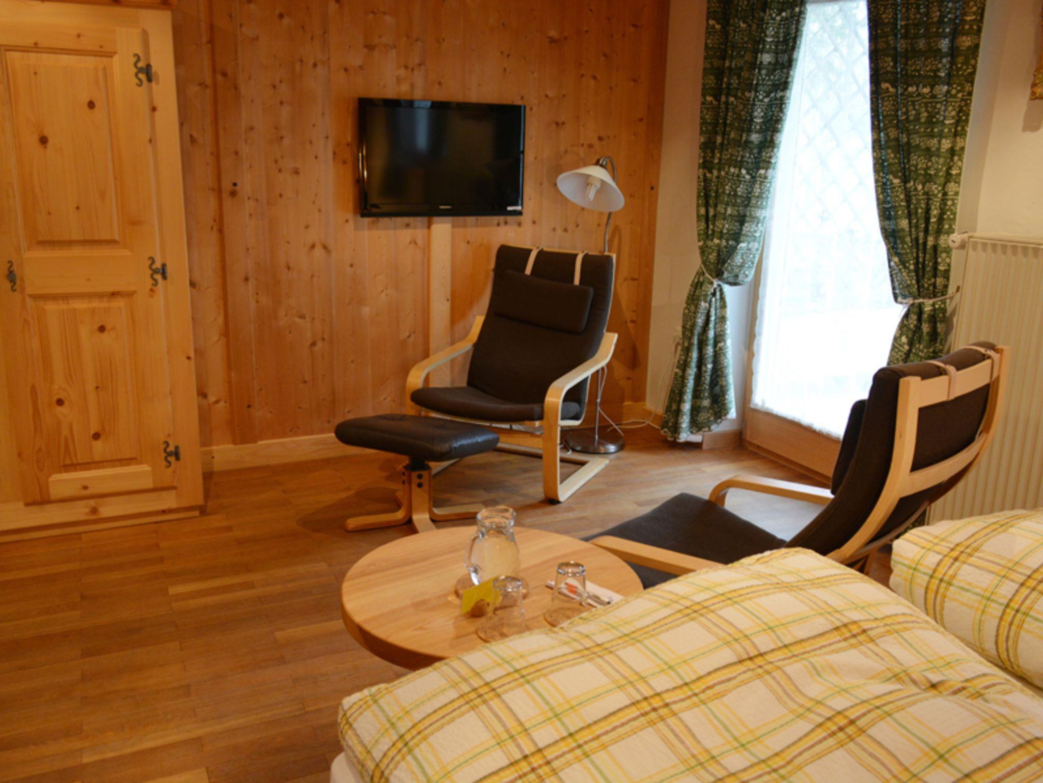 Im Zimmer stehen zwei Relaxsessel und ein erhöhtes Bett für alle Gäste mit Rückenleiden. Außerdem steht Ihnen eine sonnige Terrasse mit Blick zum Wallberg zur Verfügung.