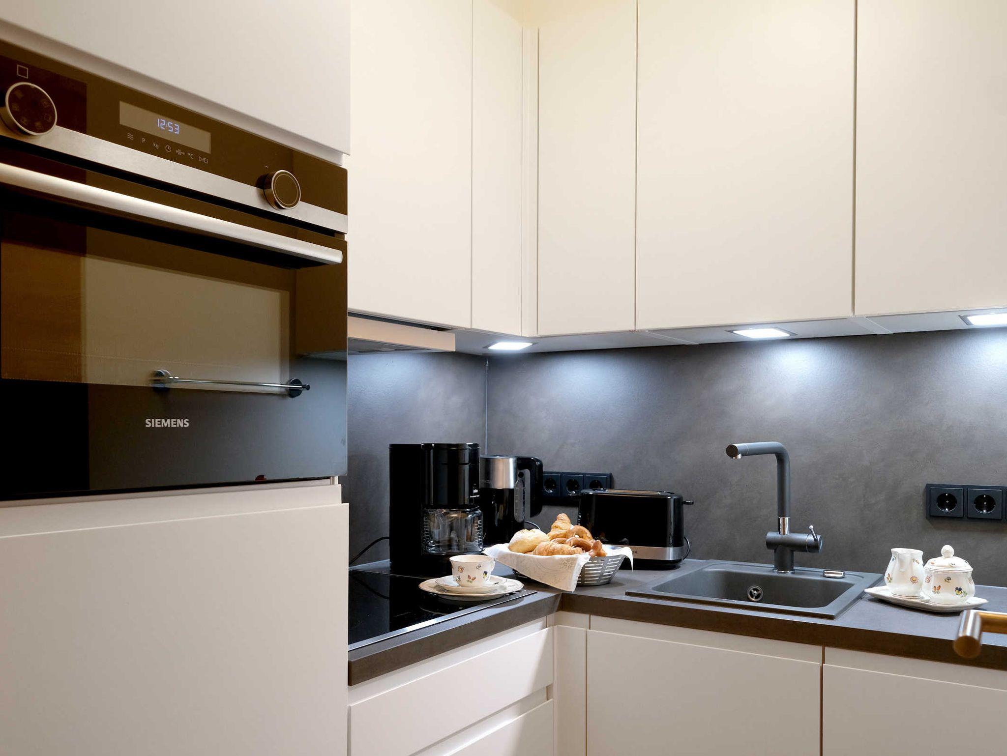 • separate und voll ausgestattete Küche mit Kühlschrank, Backofen, 4-Feld Ceran Herd, Spülmaschine, Kaffeemaschine, Wasserkocher, Toaster