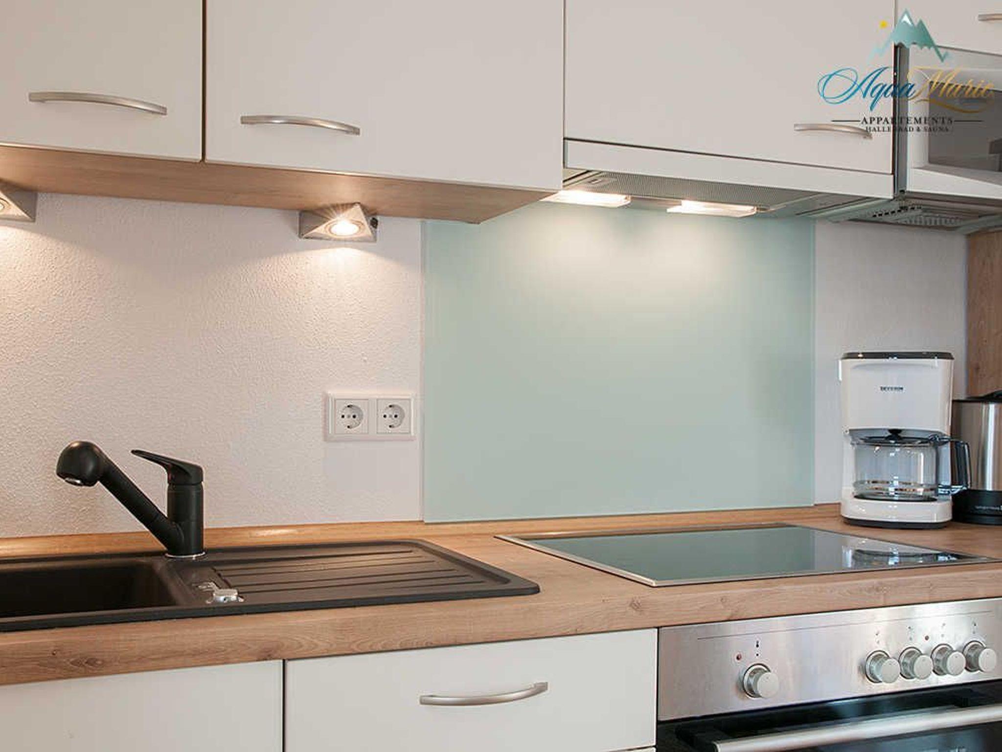 Einbauküche mit Kühlschrank, Gefrierfach, Ceran-Kochfeld, Backofen, Mikrowelle, Spülmaschine, Kaffeemaschine, Toaster, Wasserkocher.