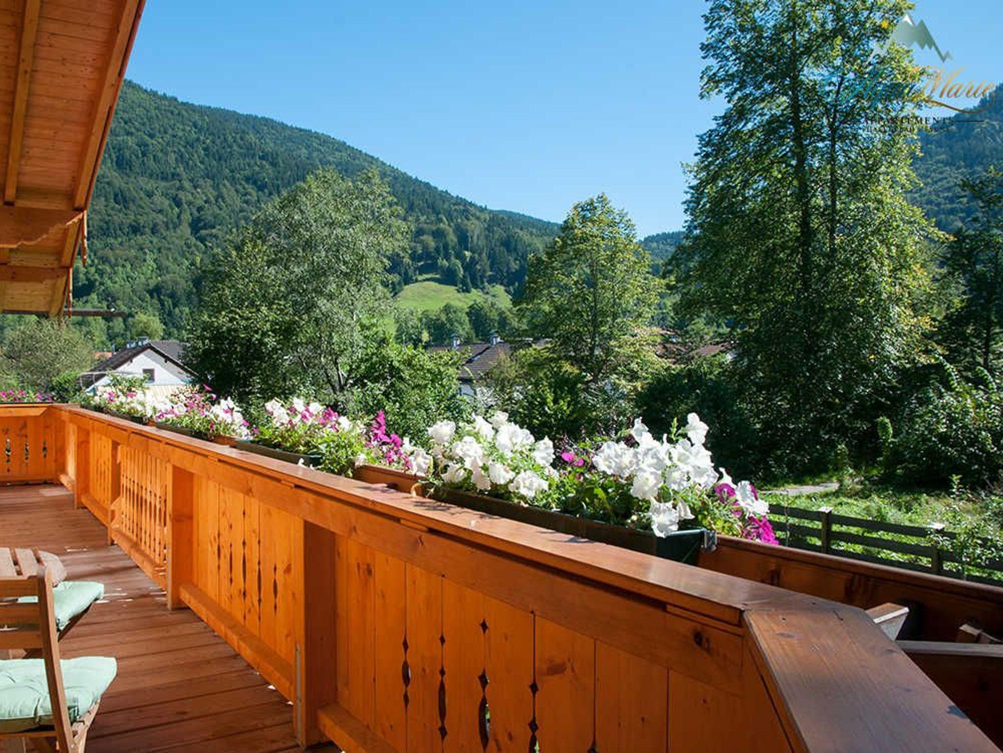 Umlaufender 16 Meter langer Süd/Ost-Balkon nach Osten mit Blick zur Bodenschneid und nach Süden mit Wallbergblick.