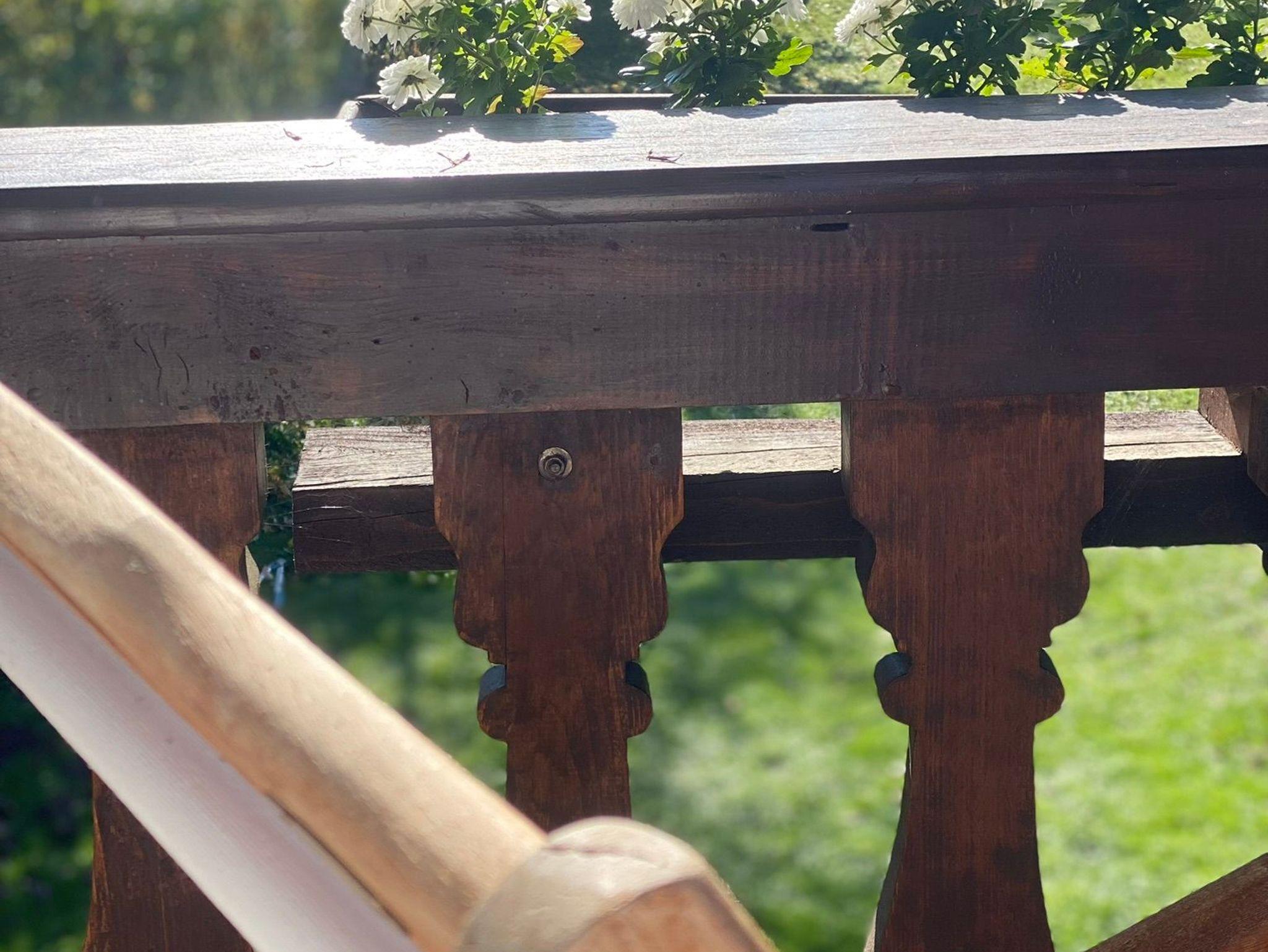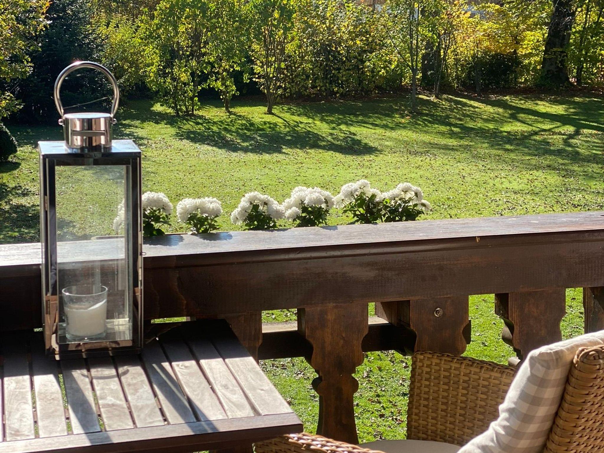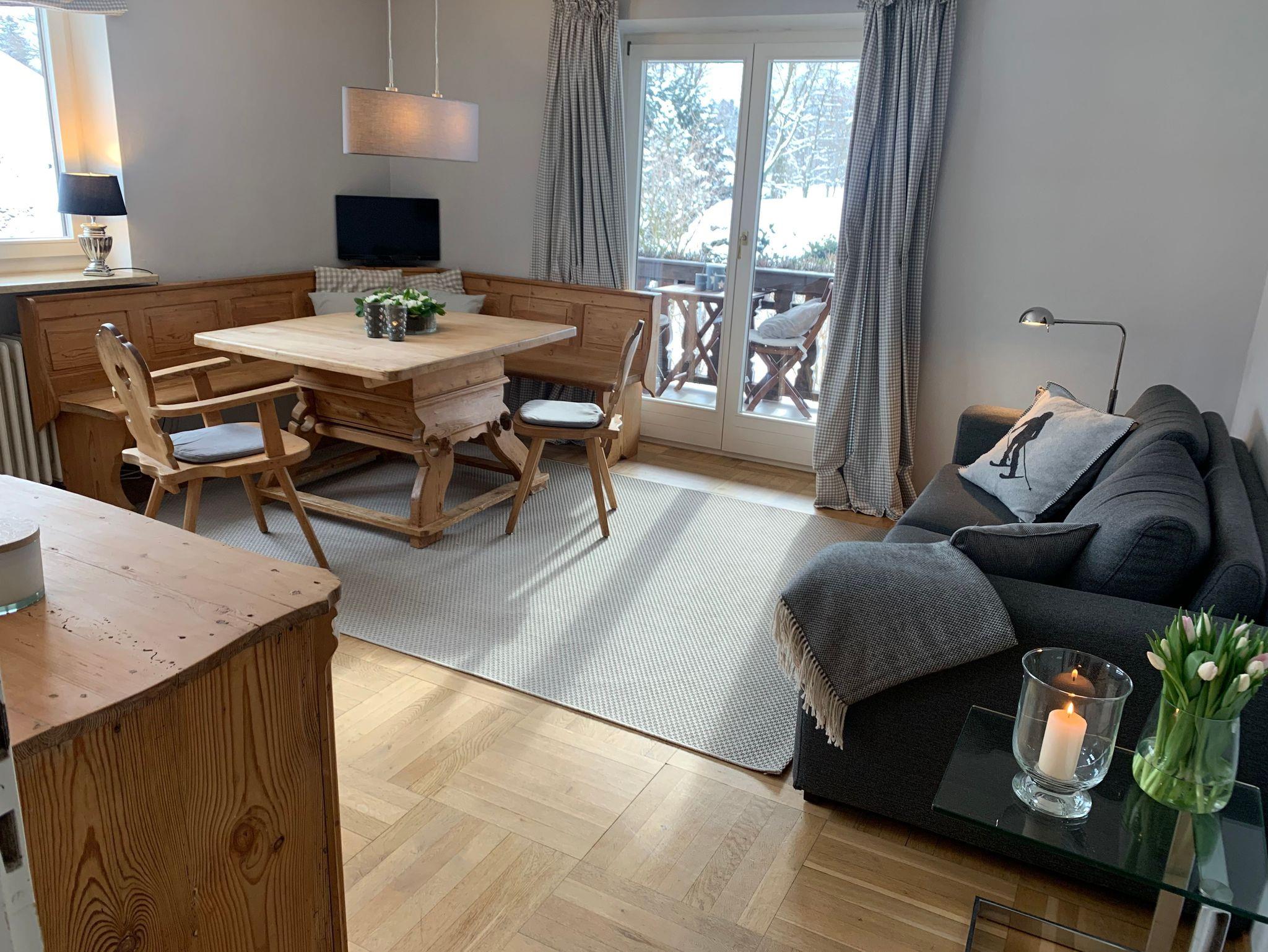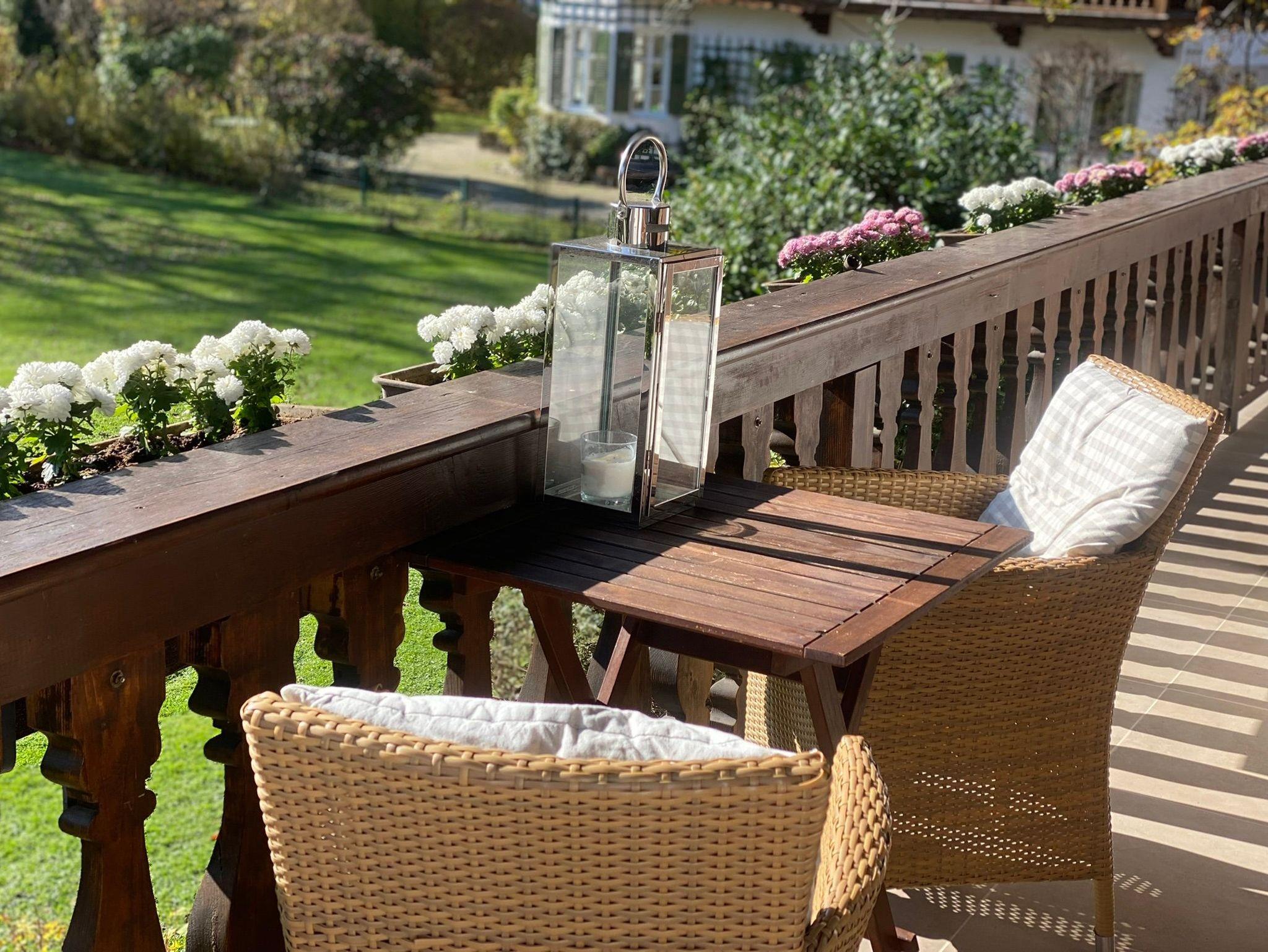 Die jüngst im bayrisch-modernen Stil geschmackvoll renovierte Wohnung mit handgeschreinerten Möbeln, Dusche mit Waschbeckeen und separatem WC, sowie eigenem Balkon mit traumhaften Blick auf den parkähnlichen Garten und das Bergpanorama.