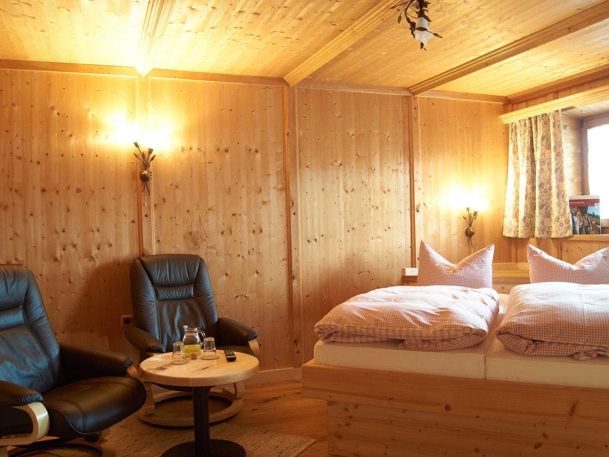 Doppelzimmer mit Balkon und Sonne bis zum Untergang. Für unseren großen Gäste ein Bett ohne Fußende.Zwei Relaxsessel laden zum Wohlfühlen ein. Zirbelholzspäne unterm Bett sorgen für einen angenehmen Schlaf.