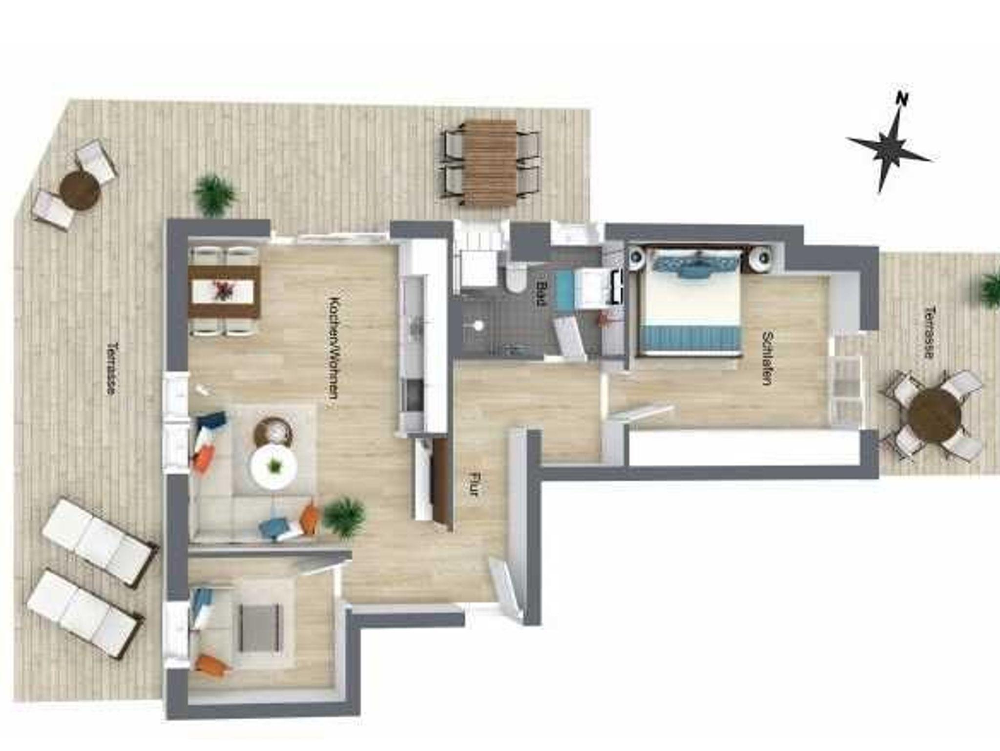 Ein absolutes Highlight der Wohnung sind die beiden Terrassen, die durch ihre Ost- bzw. Westausrichung den ganzen Tag Sonne oder Schatten bieten. Auf der über 40qm großen Ostterrasse können Sie die ersten Sonnenstunden des Tages nutzen. Ausgestattet ist die Terrasse, die direkt an den Wohnbereich grenzt, mit bequemen Liegestühlen, einem Esstisch sowie weiteren Sitzgelegenheiten. In den späteren Nachmittags- und Abendstunden bietet die zweite, auf die Westseite ausgerichtete Terrasse ausreichend Sonne. Neben den Terrassen stehen ein privates Gartenabteil sowie ein großer Gemeinschaftsgarten zur Verfügung. Das Grundstück ist zudem gut eingewachsen, wodurch Ihre Privatsphäre gewahrt wrid.