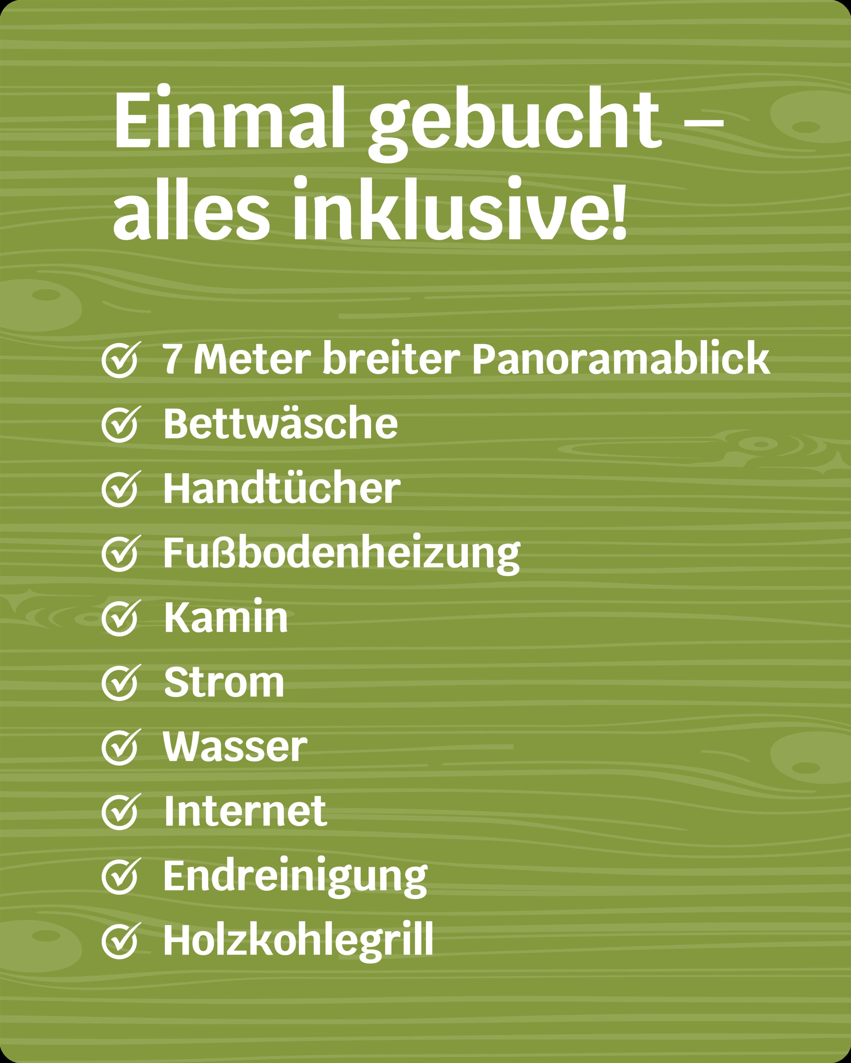 Das Ferienhaus mit einem lichtdurchfluteten offenen Wohn- und Küchenbereich, einem Schlafzimmer und einem Wellness-Bad mit Sauna bietet Ihnen auf 61 Quadratmetern großzügigen Platz für 2 Personen. Die 7 Meter breite Glasfront lässt die Natur beim Essen oder Relaxen teilhaben. In der kalten Jahreszeit vollendet das knisternde Kaminfeuer das Urlaubsfeeling.