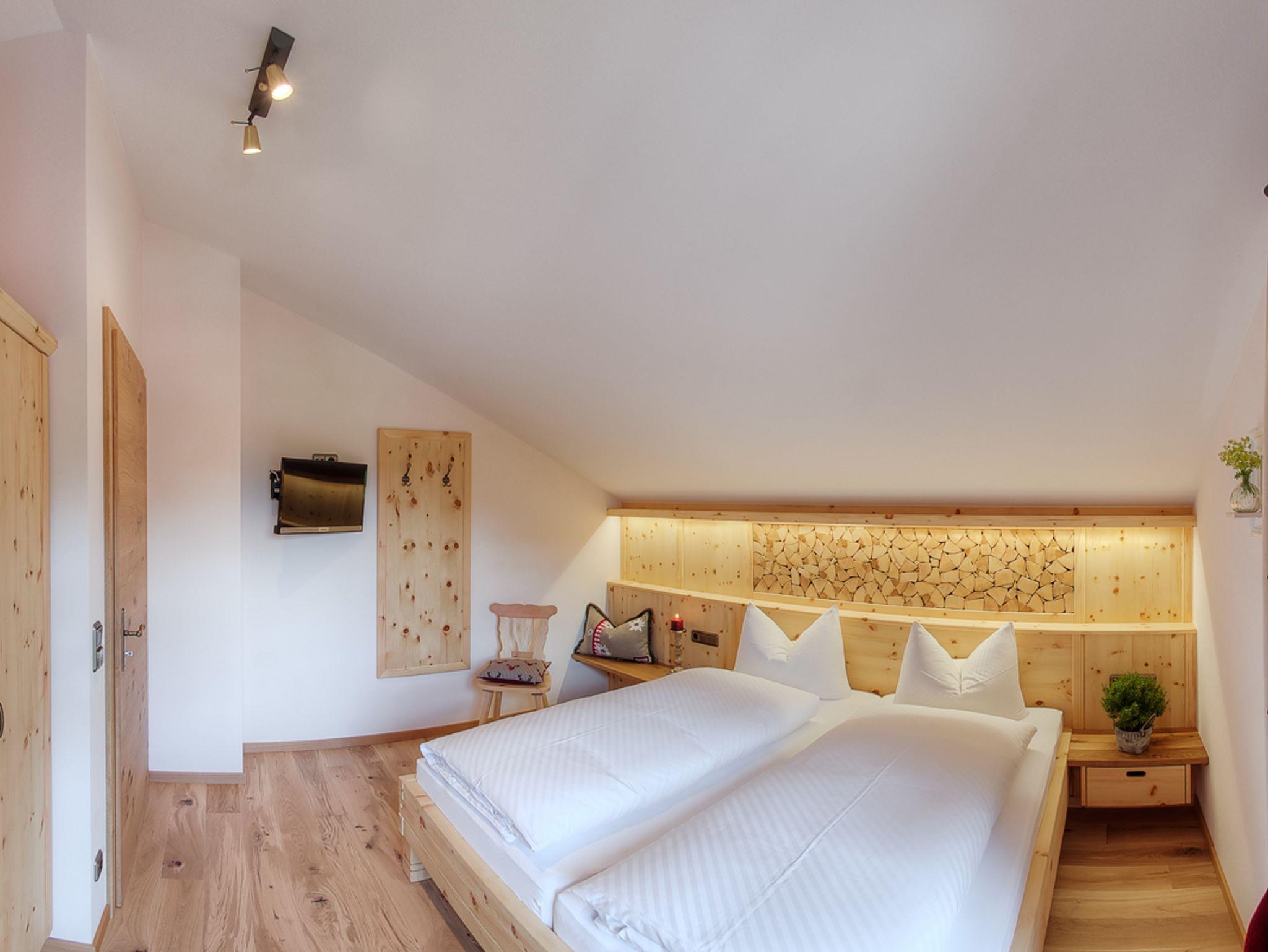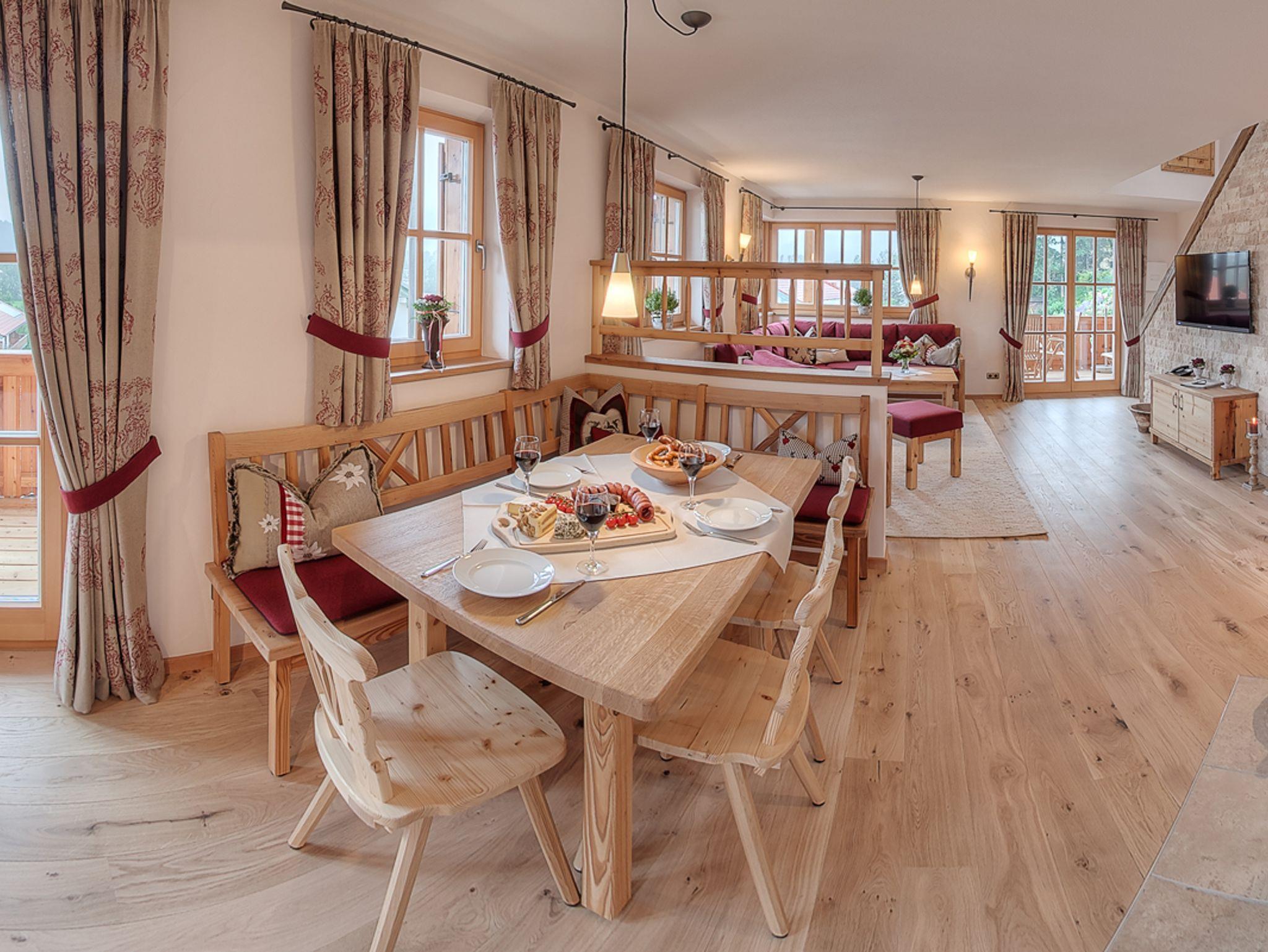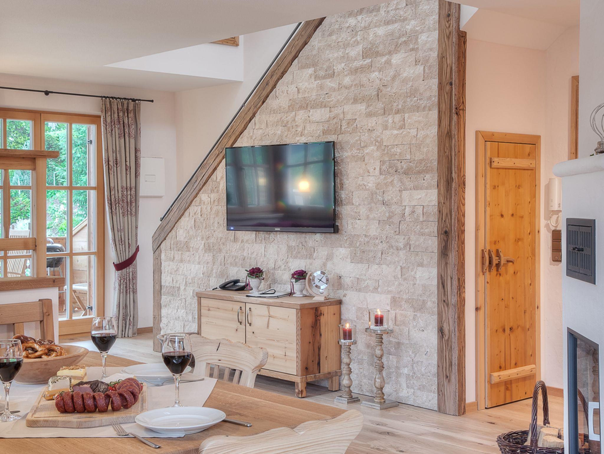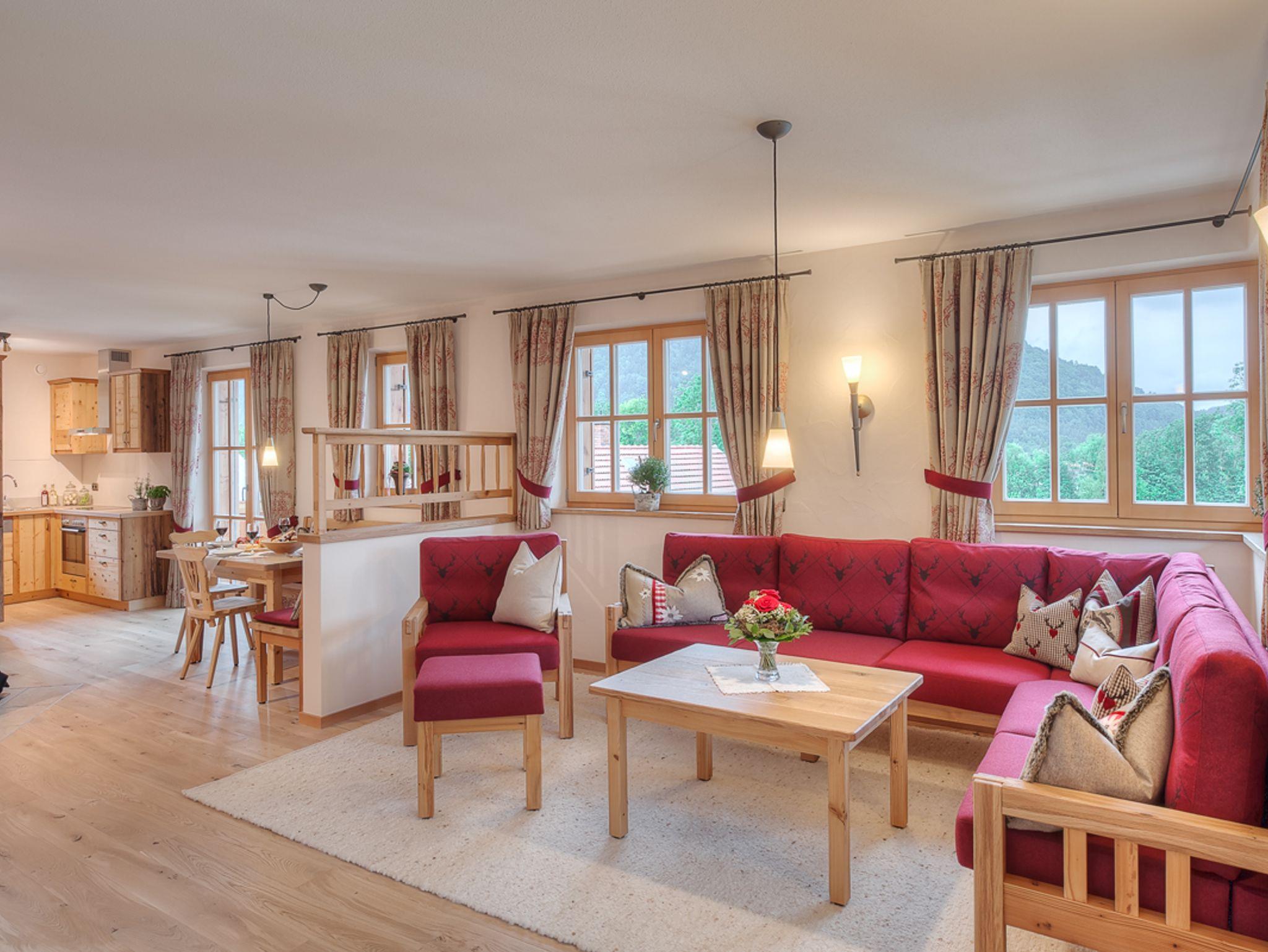 In der Ferienwohnung Rose (110 m²) fällt es ganz leicht, den Alltag hinter sich zu lassen und im Urlaub anzukommen. Rose ist in alpenländisch-elegantem Stil gehalten und hochwertig eingerichtet. Die Wohnung erstreckt sich über zwei Stockwerke unseres Hanghauses: eine interne Treppe verbindet das 1. Obergeschoss mit dem Dachgeschoss.Wohnraum: Im 1. Obergeschoss befindet sich der offene, lichtdurchflutete Wohnraum: er ist mit einer vollausgestalteten Küche in Altholzqualität, einem behaglichen Kachelofen zum selbst Anheizen, einer rustikalen Essgruppe und einem großen Wohnbereich mit gemütlichen, geschreinerten Polstermöbeln, Smart-TV und WLAN ausgestattet. Der Wohnraum führt auf zwei Balkone hinaus, einen Ostbalkon und einen großen Südbalkon mit Grill. Von dort genießen Sie einen malerischen Blick auf das Ruhpoldinger Alpenpanorama. Schlafzimmer: Die beiden Schlafzimmer im Dachgeschoss mit Doppelbetten und TV sind zur Gänze aus Zirbenholz gearbeitet; diese sorgt, dankt der ätherischen Öle der Zirbe, für einen erholsamen Schlaf. Von den Schlafzimmern aus gelangt man auf den dritten Balkon der Wohnung: östlich ausgerichtet lädt er dazu ein, mit der Sonne in den Tag zu starten. Bäder:Die Wohnung besitzt zwei Bäder und ein separates WC. Bad I ist mit Badewanne, Dusche und Waschtisch ausgestattet, Bad II mit Dusche, Waschtisch, WC und dem Herzstück, einer großzügigen Sauna – hier können Sie nach einem ereignisreichen Urlaubstag entspannen. Lage und Sonstiges:Die Wohnung befindet sich in bester Lage: ruhig, aber dennoch zentral.Ihr Auto können Sie in der hauseigenen Tiefgarage mit angrenzendem abschließbaren Abstellraum parken.