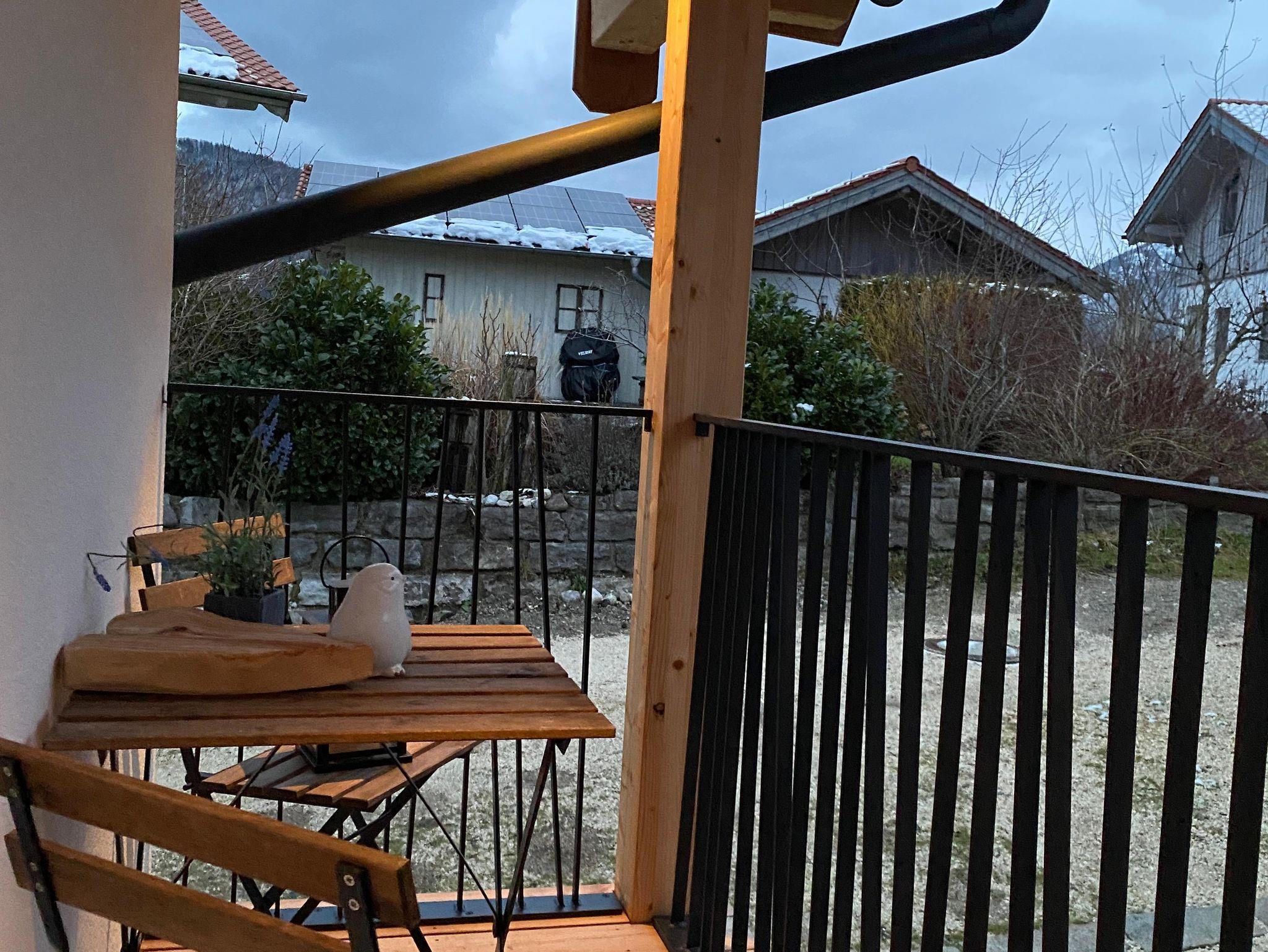 Dieser Sitzplatz lädt zum Verweilen ein – ideal für ein genüssliches Frühstück an der frischen Luft, während der Blick auf den Rauschberg die Seele berührt. Perfekt für einen entspannten Start in den Tag.