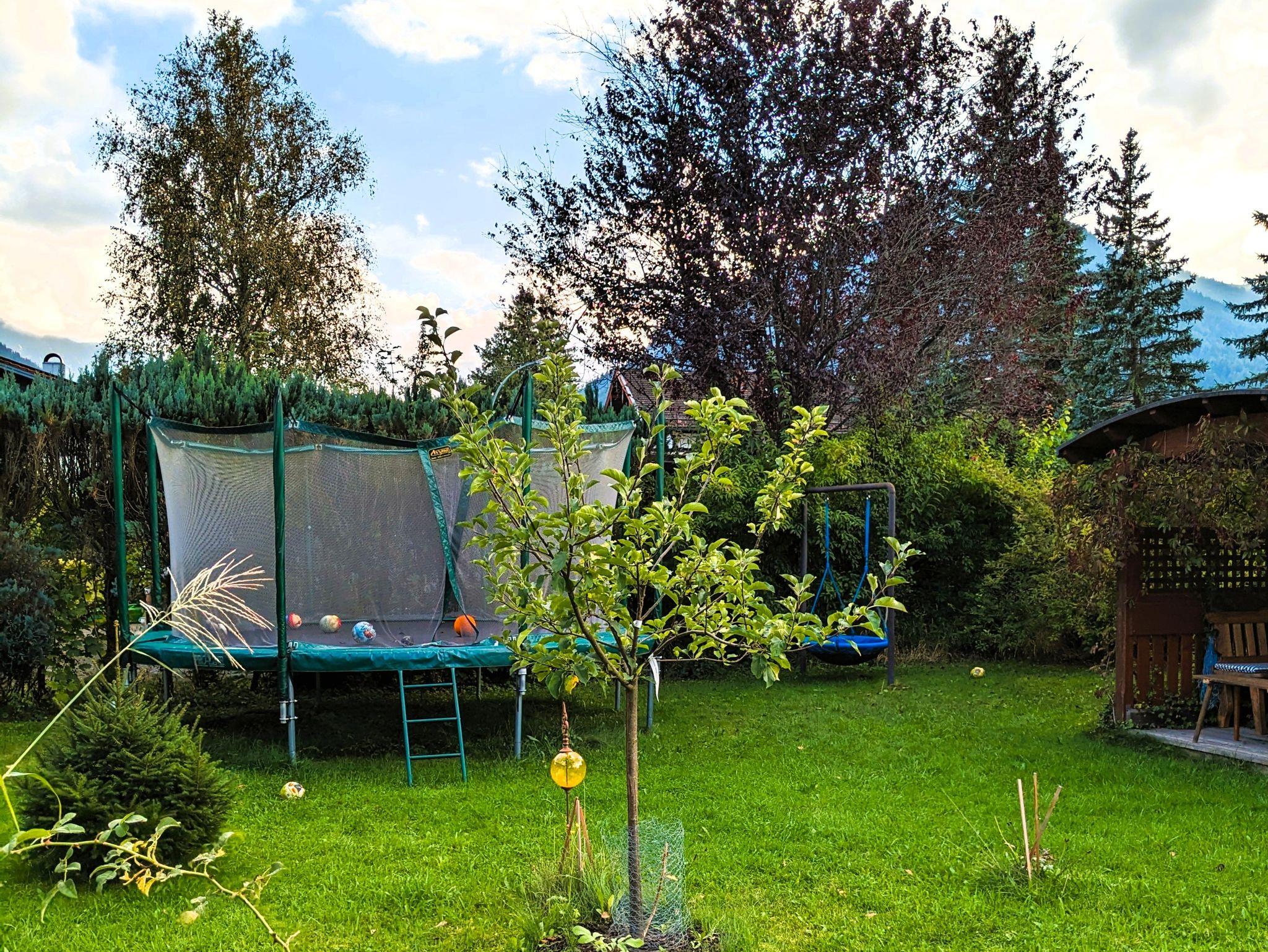 Der Garten mit Laube, Grill, Trampolin, Schaukel und Spielgeräten läd zum Verweilen ein.
