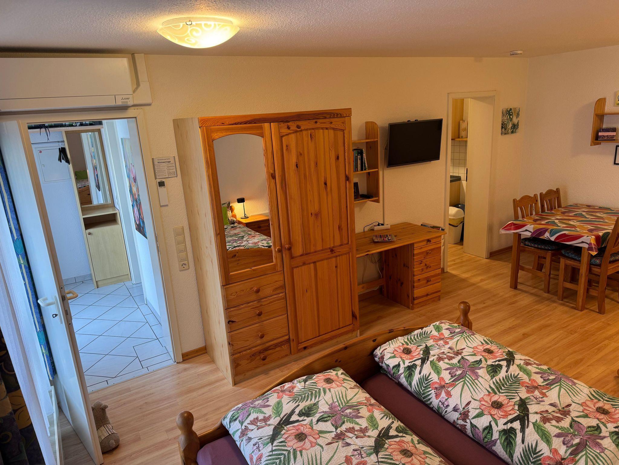 Die Nichtraucher-Ferienwohnung ist geeignet für max. 4 Personen und ist ausgestattet mit WC und Badewanne, einem kombinierten Wohn-Schlafbereich mit einem Doppelbett und einem Etagenbett, sowie Schreibtisch, Essecke und TV. Unseren Gästen steht WLAN zur Verfügung. Die separate Küche verfügt über einen Backofen, Kochgelegenheit, Kaffeemaschine, Kühlschrank und Wasserkocher. Handtücher und Bettwäsche sind vorhanden. Der Schlafraum ist mit einer Klimaanlage ausgestattet. Vor Ort fällt bis ende 2025 eine Kurtaxe in Höhe von 1 EUR pro Person pro Tag an. Ab 2026 fällt eine Kurtaxe in Höhe von 1,45 EUR pro Person pro Tag an. Kinder von 0-11 Jahren zahlen keine Kurtaxe.