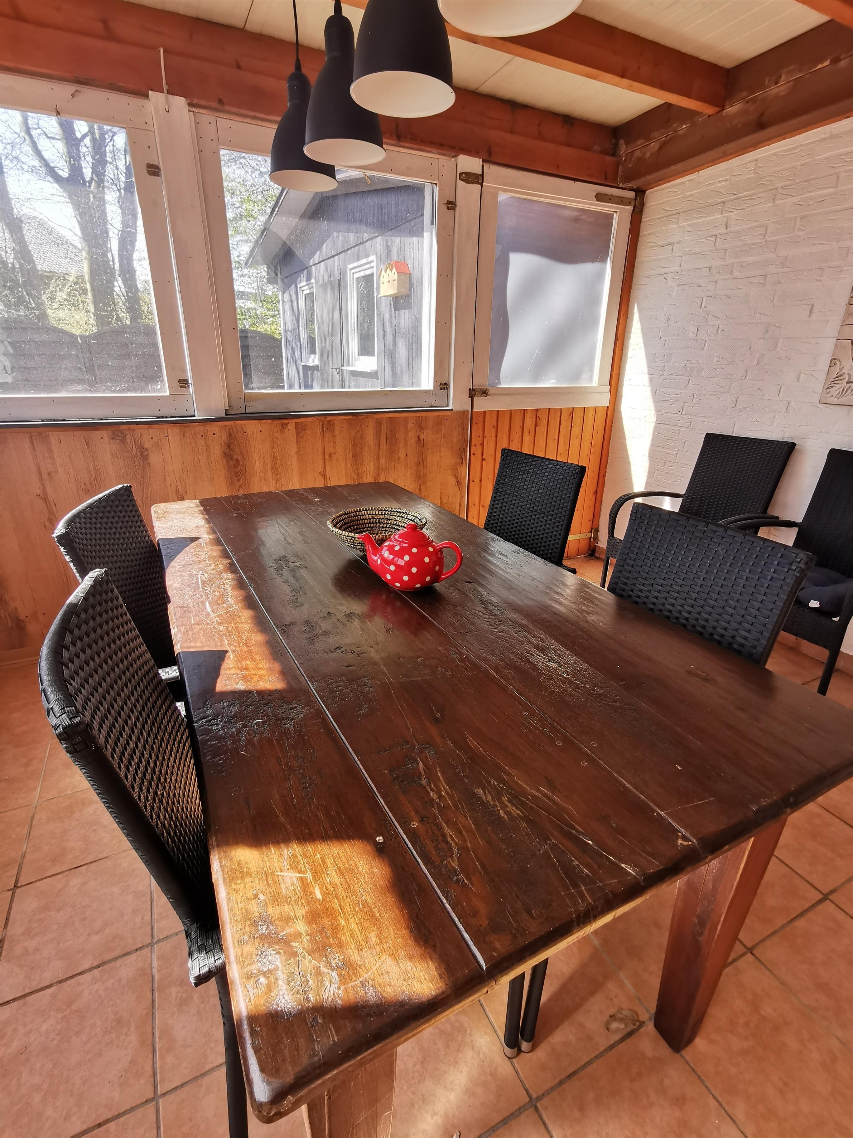 - großer Holztisch incl. 6 Stühle auf der geschlossenen Terrasse