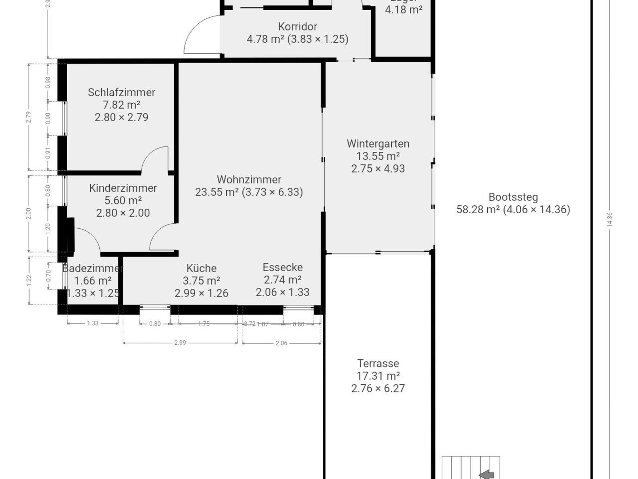 Ein besonderes Highlight ist der Wintergarten, der mit einem Esstisch für vier Personen ausgestattet ist. Von den zwei Relaxsesseln im Wintergarten genießen Sie den herrlichen Ausblick auf den Bootssteg und den Kanal. Auch bei schlechtem Wetter können Sie hier die Natur erleben. Von dort gelangen Sie auf die teilweise überdachte Terrasse mit gemauertem Grillkamin und weiter über eine Treppe zum etwa 14 m langen Bootssteg.
