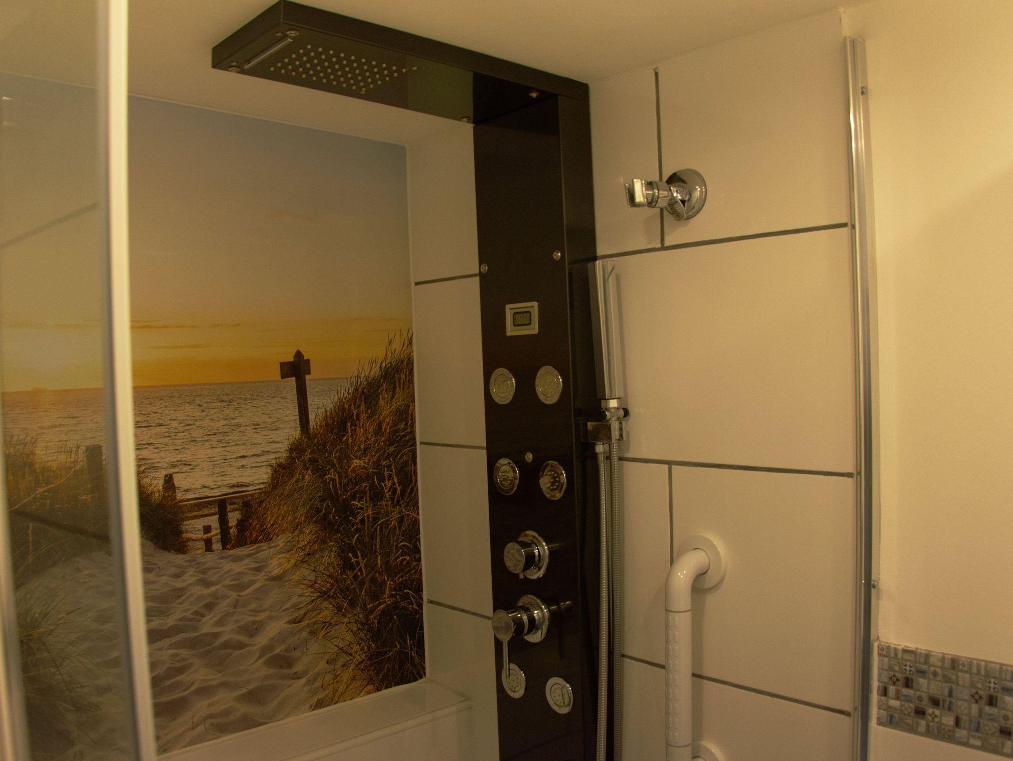 Badezimmer: Zwei moderne Bäder, jeweils mit Dusche und WC.