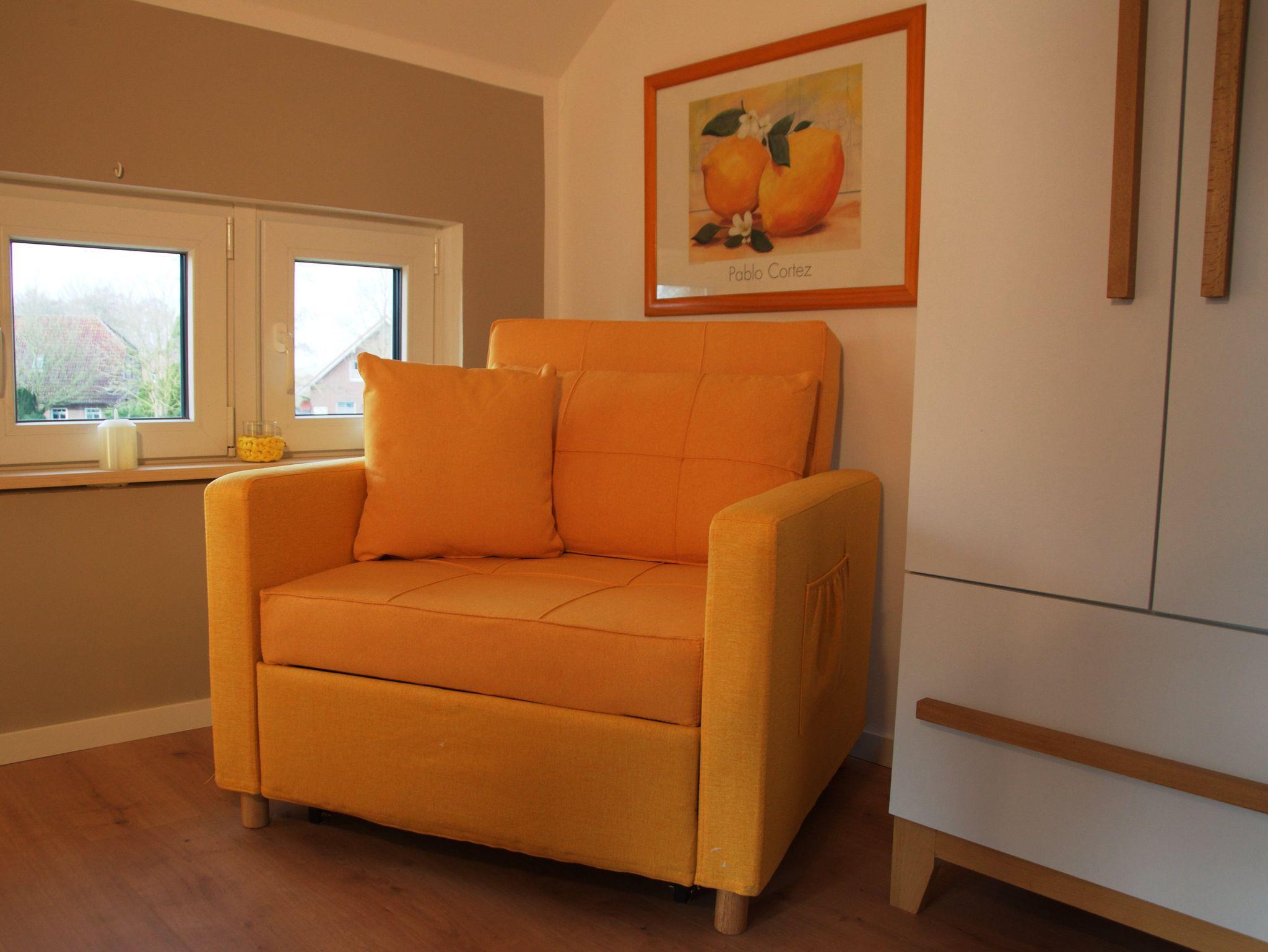Unsere stilvoll erneuerte 40m² große Ferienwohnung „Kleines Meer“ liegt am ruhigen Ortsrand von Wiegboldsbur. Die offene Raumgestaltung umfasst einen gemütlichen Wohnbereich mit TV, eine voll ausgestattete Küche mit Spülmaschine, ein Schlafzimmer mit Doppelbett und kleiner Büroecke sowie ein modernes Bad mit Dusche. Bettwäsche und Handtücher sind inklusive.