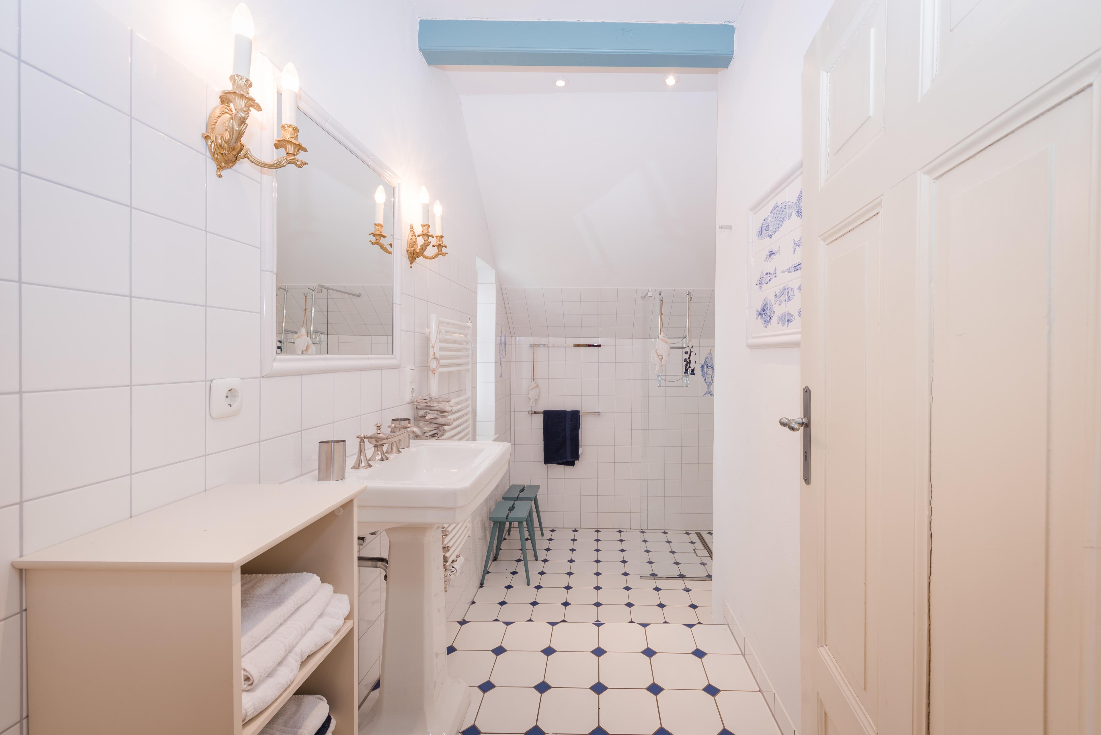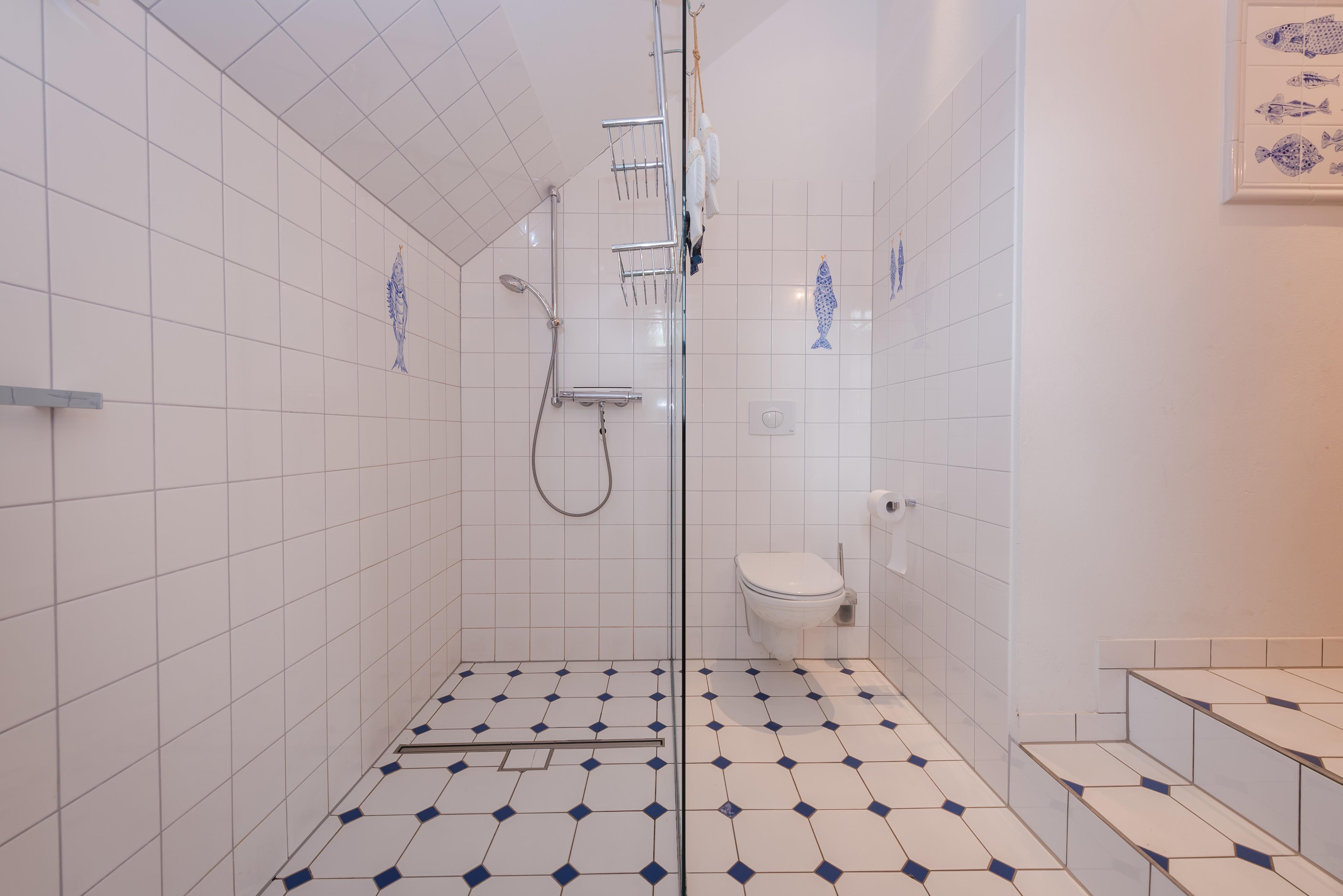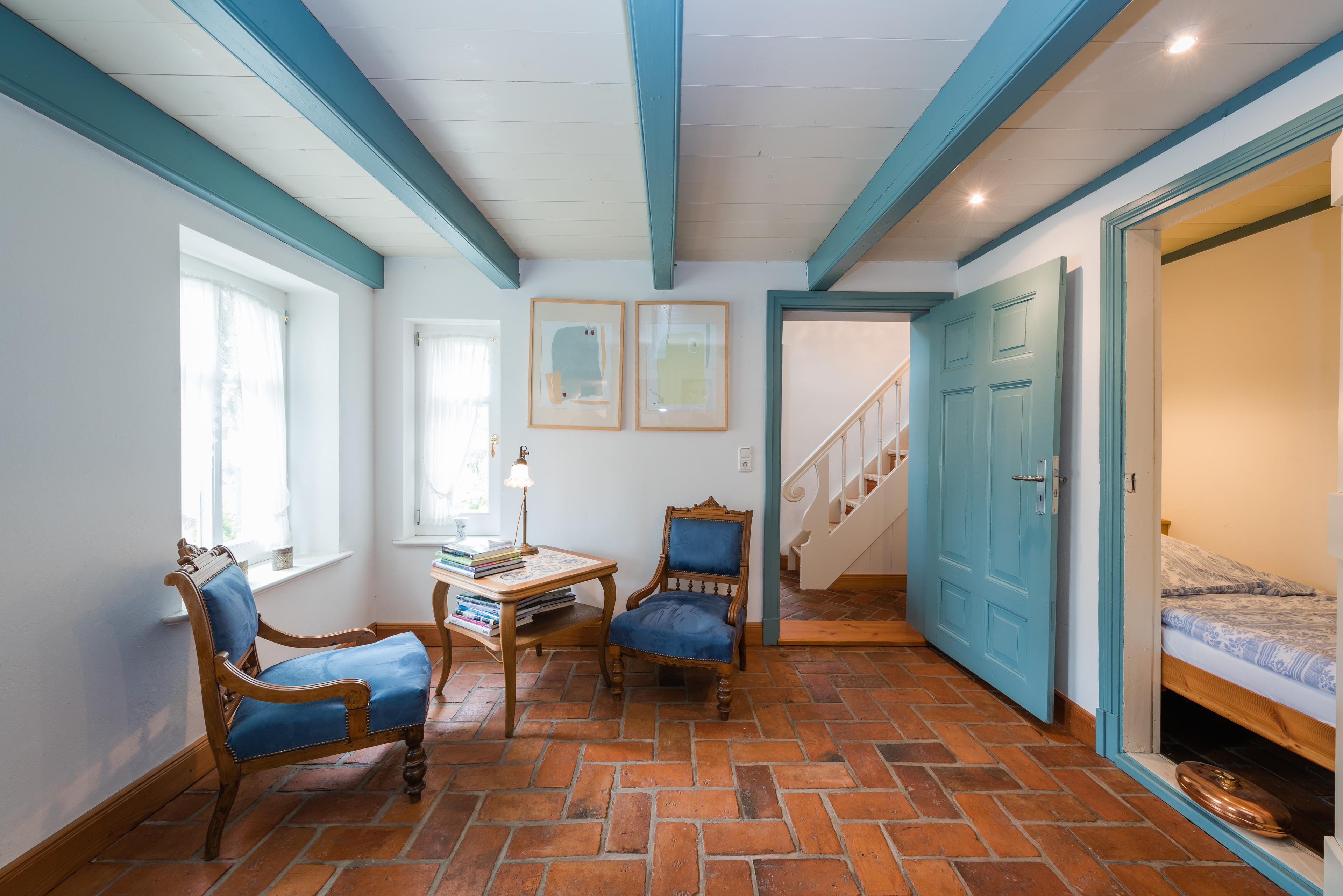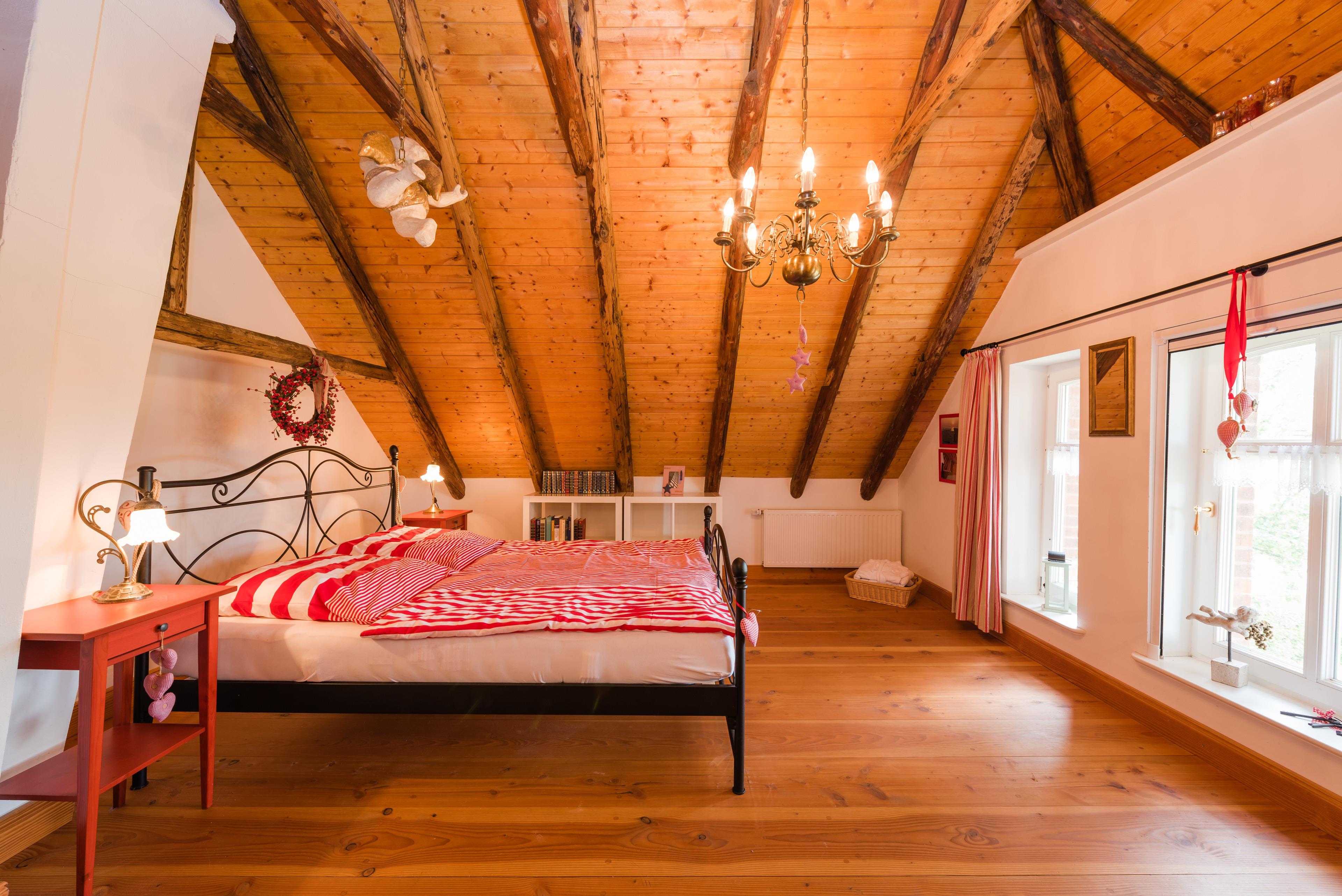 Das Butzenbett-Zimmer befindet sich ebenfalls im Erdgeschoss. Auch das geräumige Badezimmer - natürlich mit Fußbodenheizung - und: handgemalten Fliesen. Ein traumhaftes Schlafzimmer gibt es im Dachgeschoss.