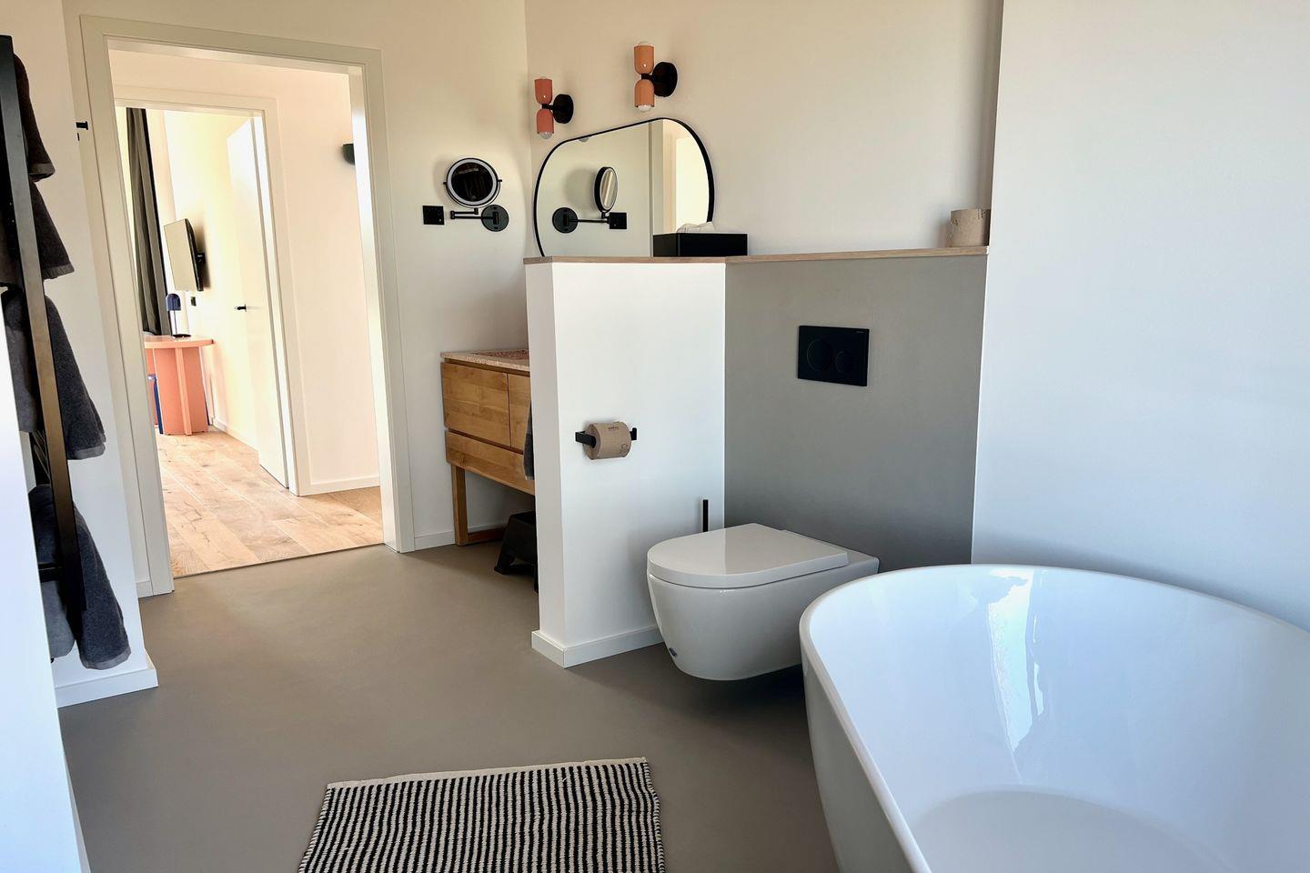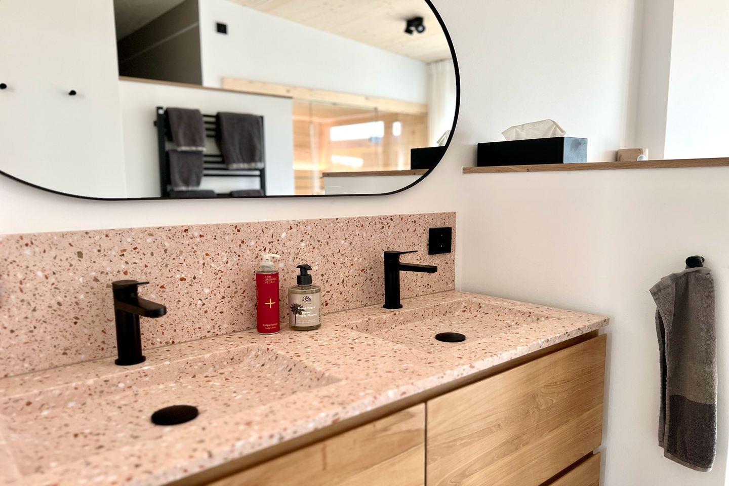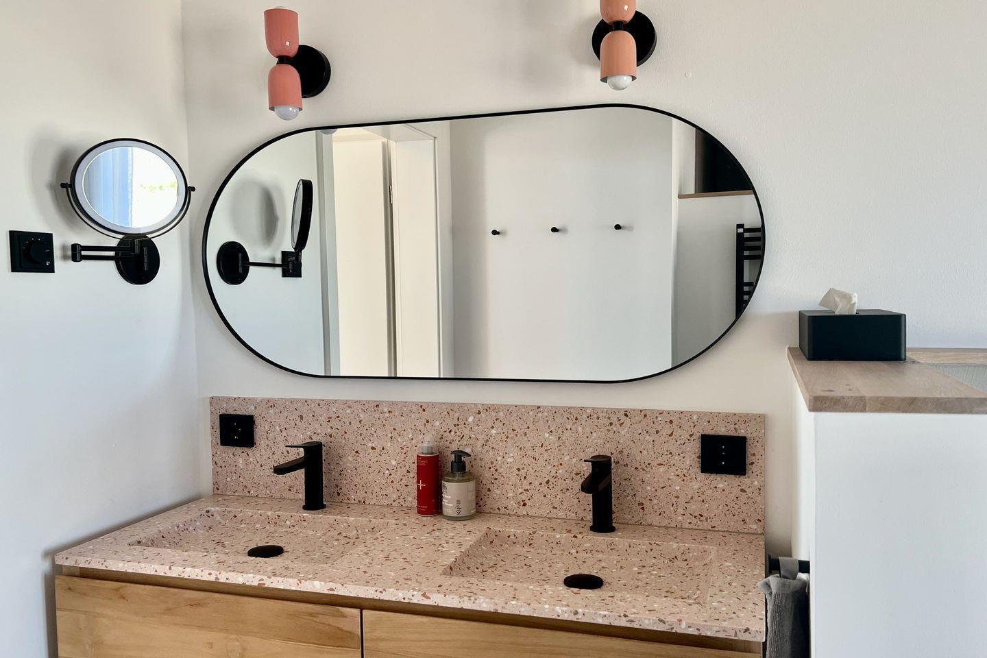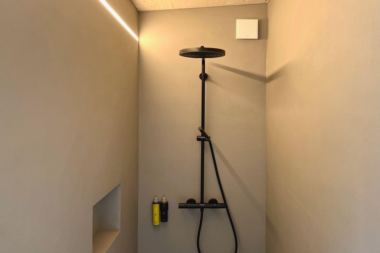 ° Badezimmer mit Regendusche, Badewanne, WC, Waschtisch, Föhn und Kosmetikspiegel