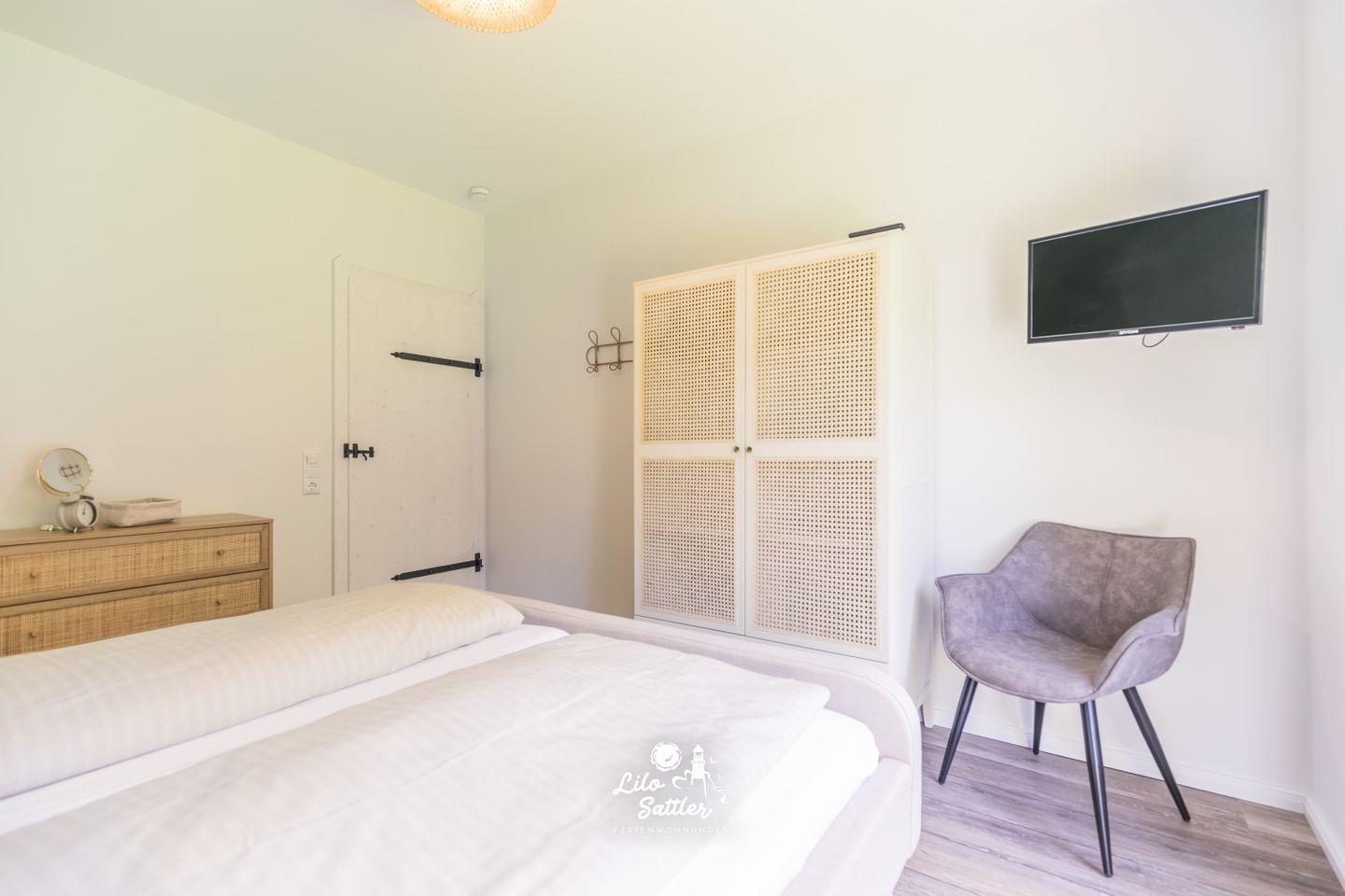 Doppelbett (200 x 180 cm) mit getrennten Matratzen, Lattenrost Kopf- und Fußteil verstellbar, Kleiderschrank 2-türig, Kommode, Ganzkörperspiegel, Sessel, TV, Fenster mit Verdunkelungsplissees, Zugang zum Garten