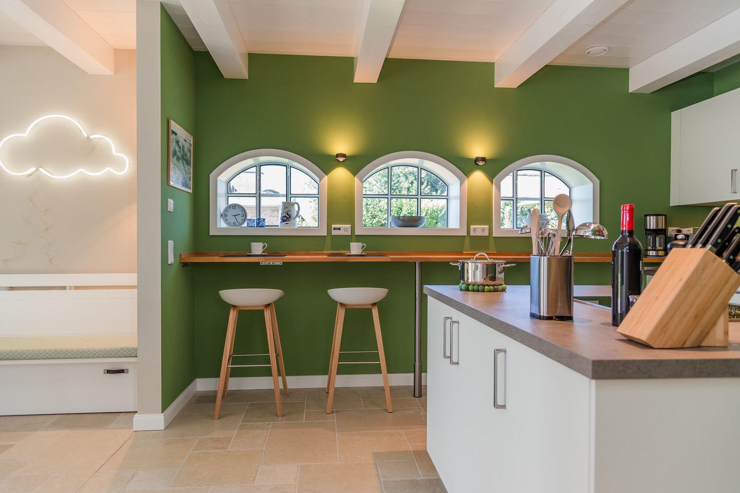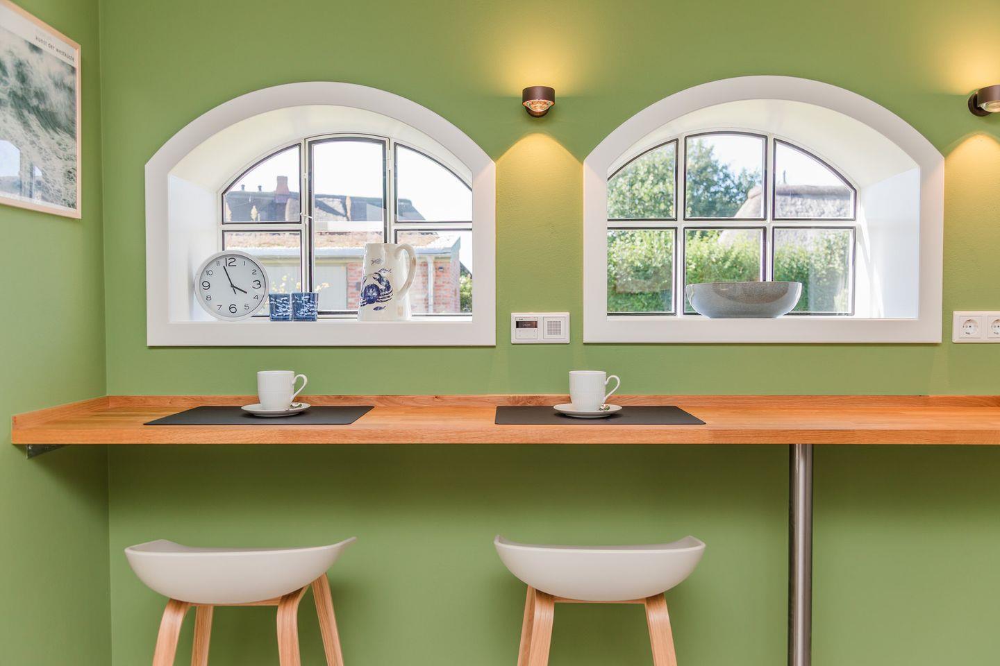 Im Erdgeschoss befinden sich der großzügige Wohn- und Essbereich mit offener Küche und ein Schlafzimmer mit Bad en Suite, sowie ein Gäste-WC. Über den Essbereich gelangen Sie direkt auf die eigene Terrasse und in den Garten. Der Kachelofen im Wohnbereich sorgt auch an kühleren Tagen für eine angenehme Atmosphäre.