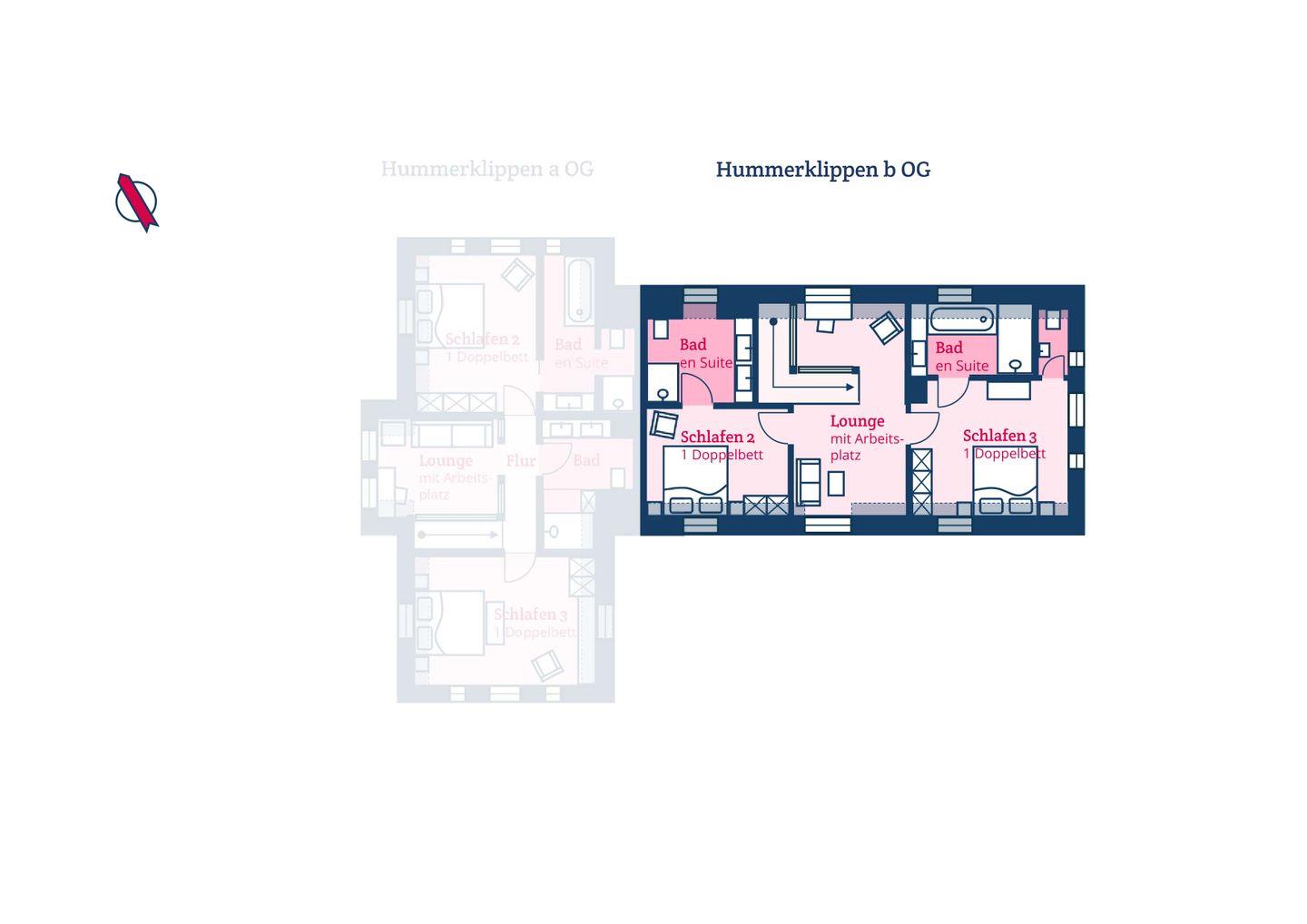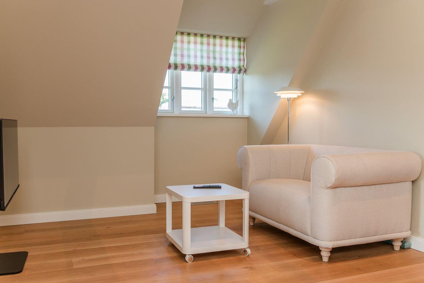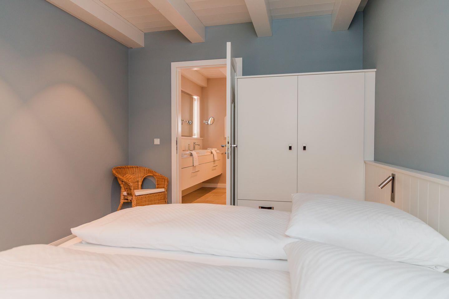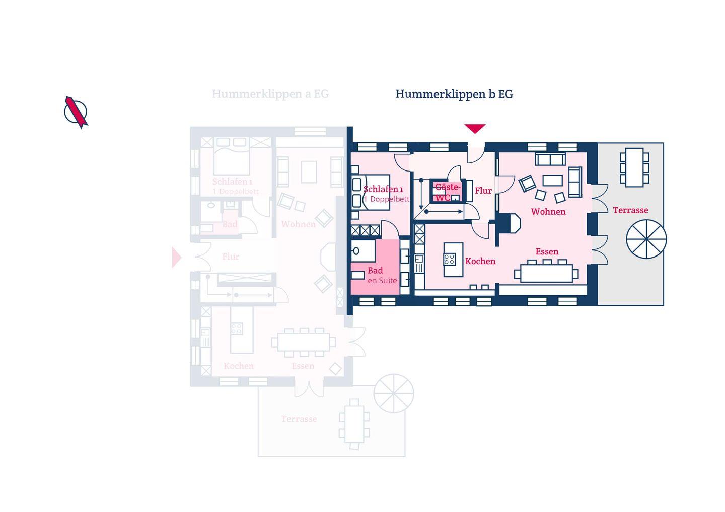 Der reetgedeckte Ferienhausteil Hummerklippen b verfügt über 3 Schlafzimmer und 3 Bäder und bietet somit komfortabel Platz für bis zu 6 Personen zuzüglich einer Kleinkinderaufbettung.