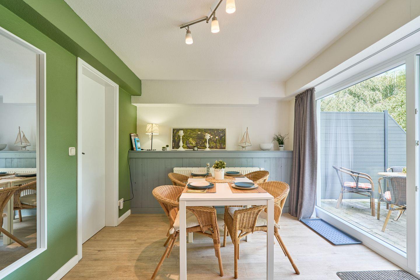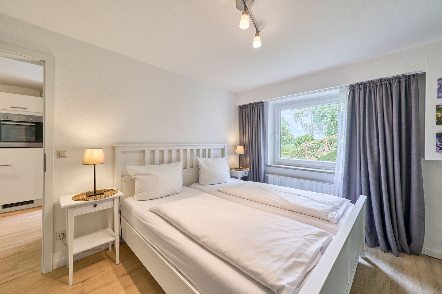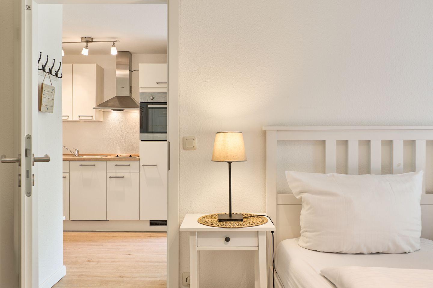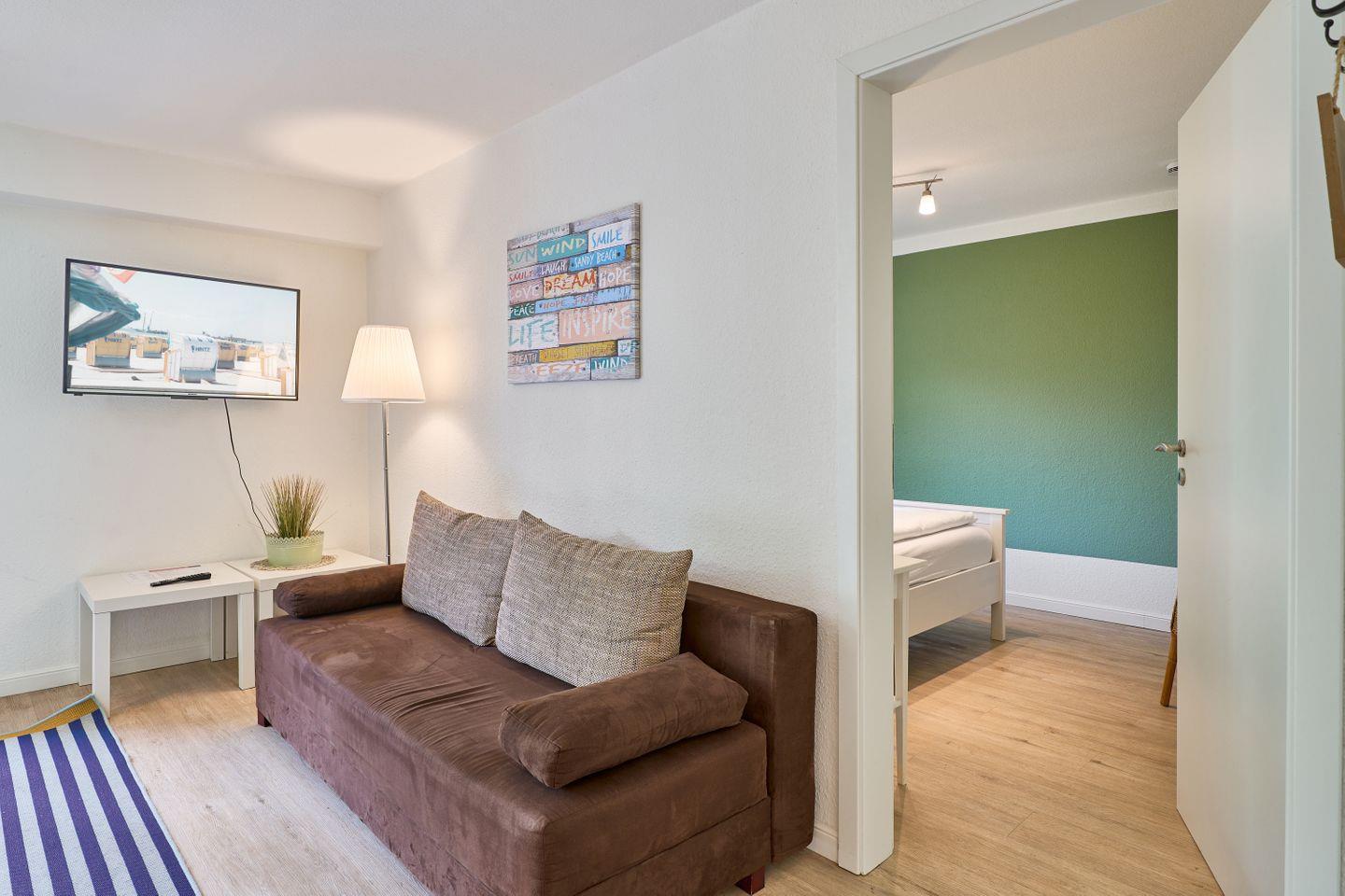 Die Unterkunft umfasst insgesamt zwei Zimmer aufgeteilt in ein separates Schlafzimmer mit drei Schlafmöglichkeiten und einen Wohnbereich mit offener Küche. Die moderne, an das Wohnzimmer angrenzende Küche ist komplett ausgestattet: Herd, Backofen, Kühlschrank mit Gefrierfach, Spülmaschine, Kaffeemaschine, Wasserkocher, Toaster, Koch- und Essgeschirr sowie Küchenutensilien stehen Ihnen zur Verfügung. Ein Esstisch sowie ein gemütlicher Sofabereich runden das Angebot im Wohnbereich ab, sodass sowohl gemeinsame Mahlzeiten als auch entspannte Abende vor dem Fernseher möglich sind.