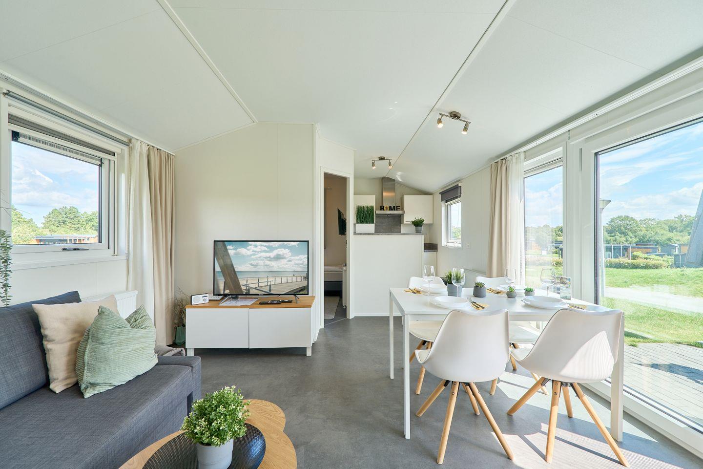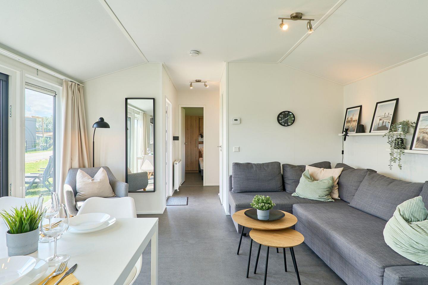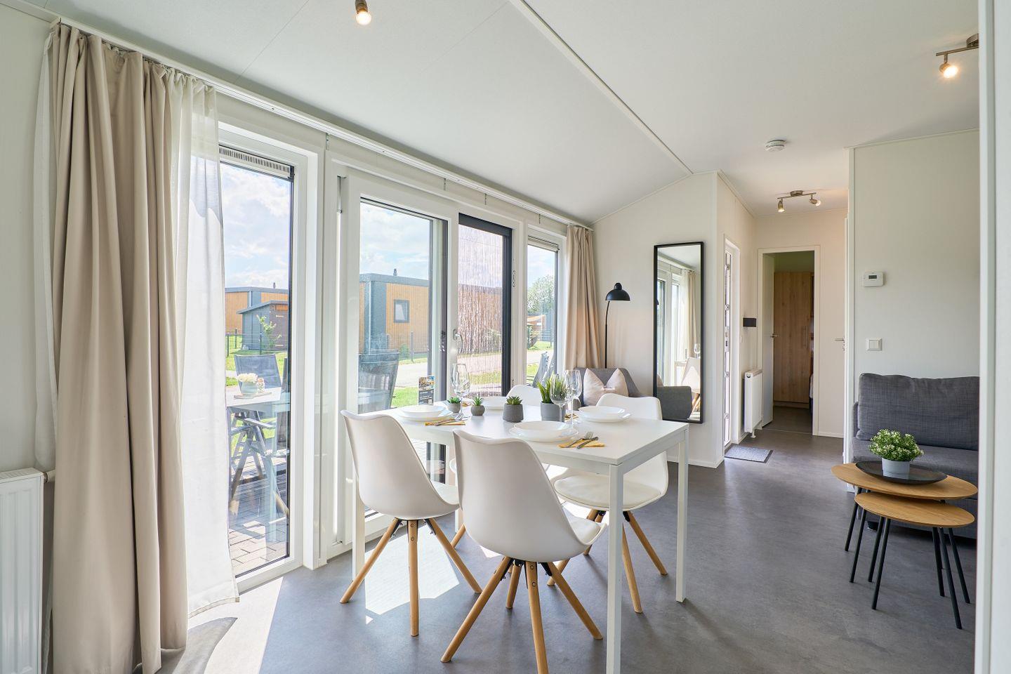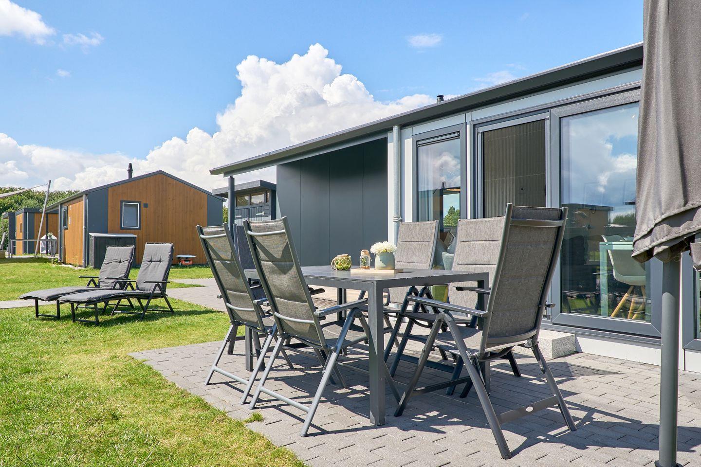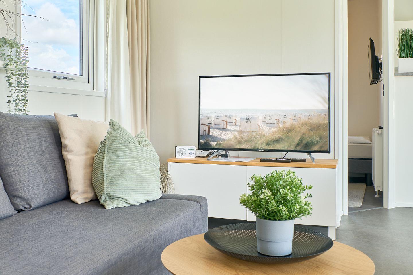 Das Ferienhaus erstreckt sich über ca. 40 m² und bietet mit zwei separaten Schlafzimmern und insgesamt fünf Schlafmöglichkeiten ausreichend Platz für bis zu fünf Personen. Im offen gestalteten Wohn- und Essbereich können Sie gesellige Abende verbringen oder in Ruhe die Umgebung genießen. Eine moderne und voll ausgestattete Küche steht Ihnen zur Verfügung, inklusive Herd, Backofen, Kühlschrank mit Gefrierfach, Spülmaschine, Kaffeemaschine, Wasserkocher, Toaster sowie Geschirr und sämtlichen Küchenutensilien. Am Esstisch finden alle Gäste bequem Platz. Der lichtdurchflutete Wohnbereich ist durch moderne Fenster mit Sichtschutz hell und freundlich gestaltet und lädt mit einem bequemen Sofa zum Verweilen ein.