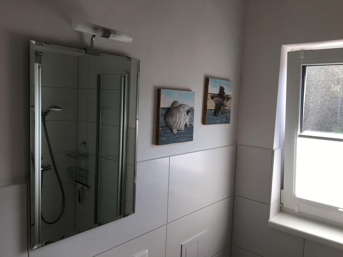 Zwei Badezimmer – beide mit Dusche und jeweils mit Waschbecken, Spiegel und Fenster ausgestattet und ein sep. Gäste-WC im Erdgeschoß – bieten ausreichend Komfort für alle Gäste. Der offene Wohn-Essbereich verfügt über eine gemütliche Sofaecke ( 1 Schlafsofa (150x200cm), TV, Sichtschutz-Plissees) , sowie einen Kaminofen, der an kühlen Tagen für behagliche Wärme sorgt. Die ländlich-moderne Atmosphäre wird durch stilvolle Ausstattungsdetails, wie Kommode, Ganzkörperspiegel sowie durchdachte Raumaufteilung abgerundet.