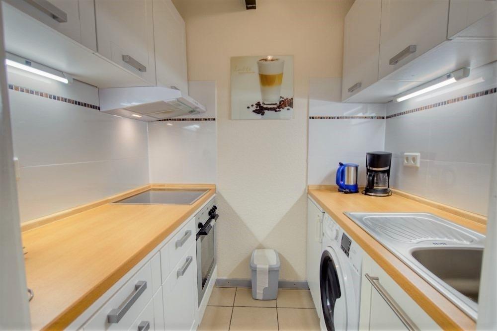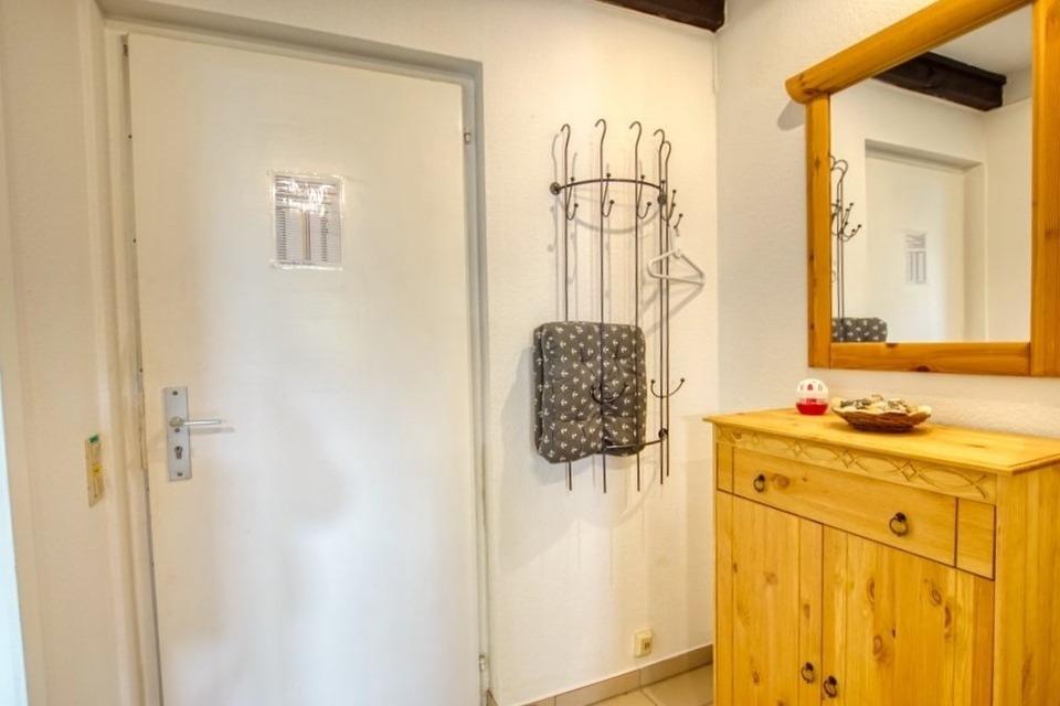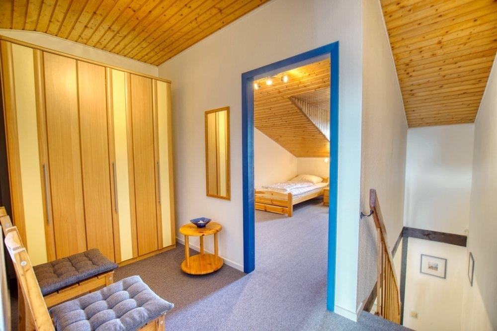Das Appartement verfügt über zwei Schlafzimmer im Obergeschoss (Doppelbett sowie zwei Einzelbetten), ein Wohnzimmer im Erdgeschoss mit Schlafcouch, Esstisch und TV sowie eine voll ausgestattete Küche mit Backofen, Ceranfeld und Kaffeemaschine. Ein Duschbad befindet sich ebenfalls im Erdgeschoss. Die Terrasse ist direkt vom Wohnbereich aus zugänglich.