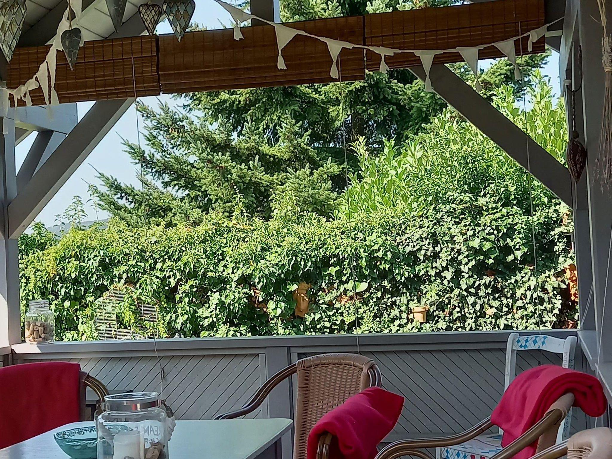 Gemütlicher Wohnraum mit Bettcouch und Kabel-TV, Schlafzimmer mit zwei Betten, Bad mit Wäscheschleuder, eingerichtete Küche mit Mikrowelle, Essplatz mit Burgblick. Direkter Zugang zur Terrasse und schönem Garten.
