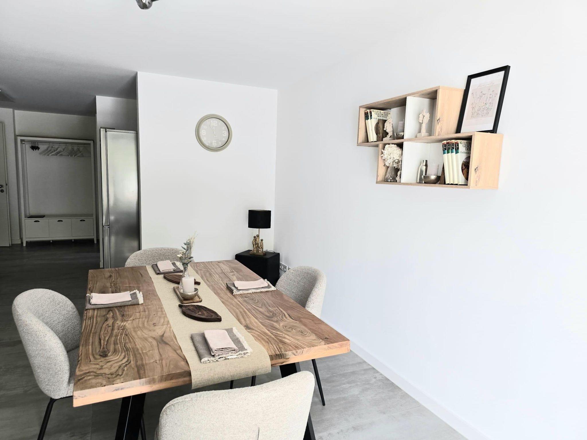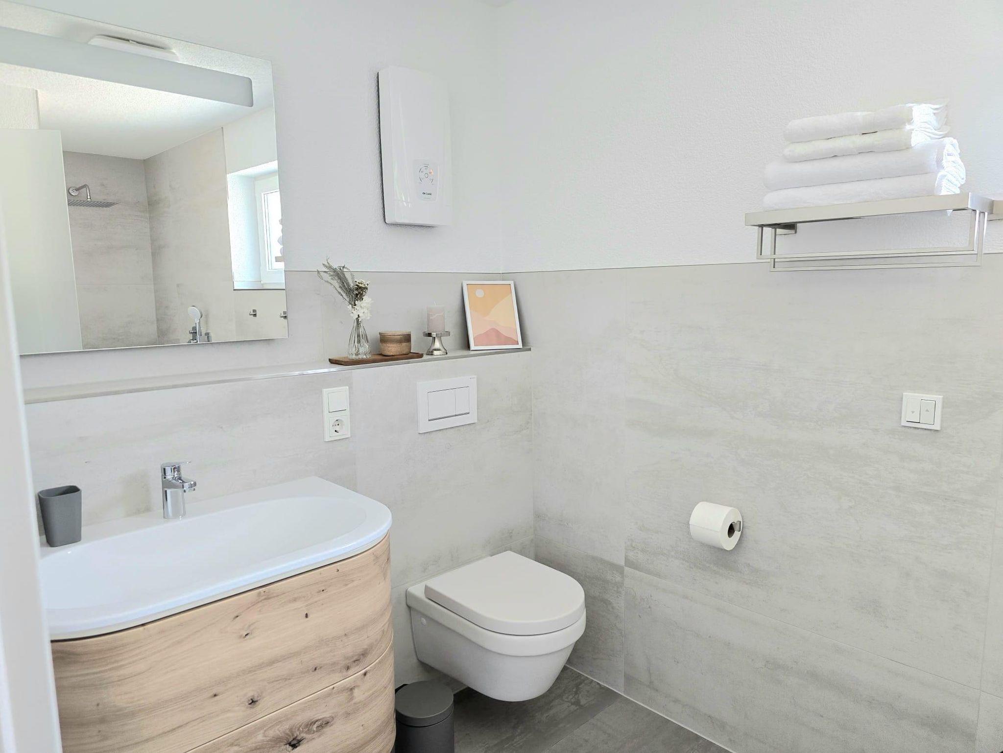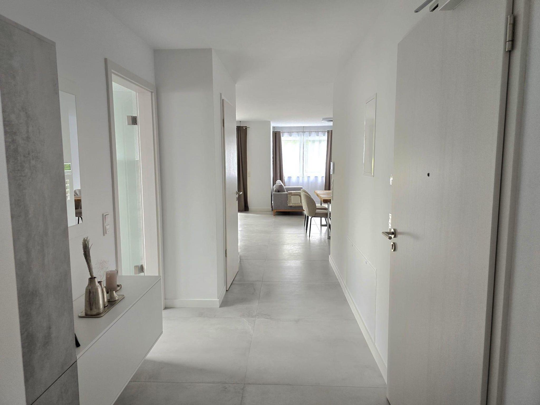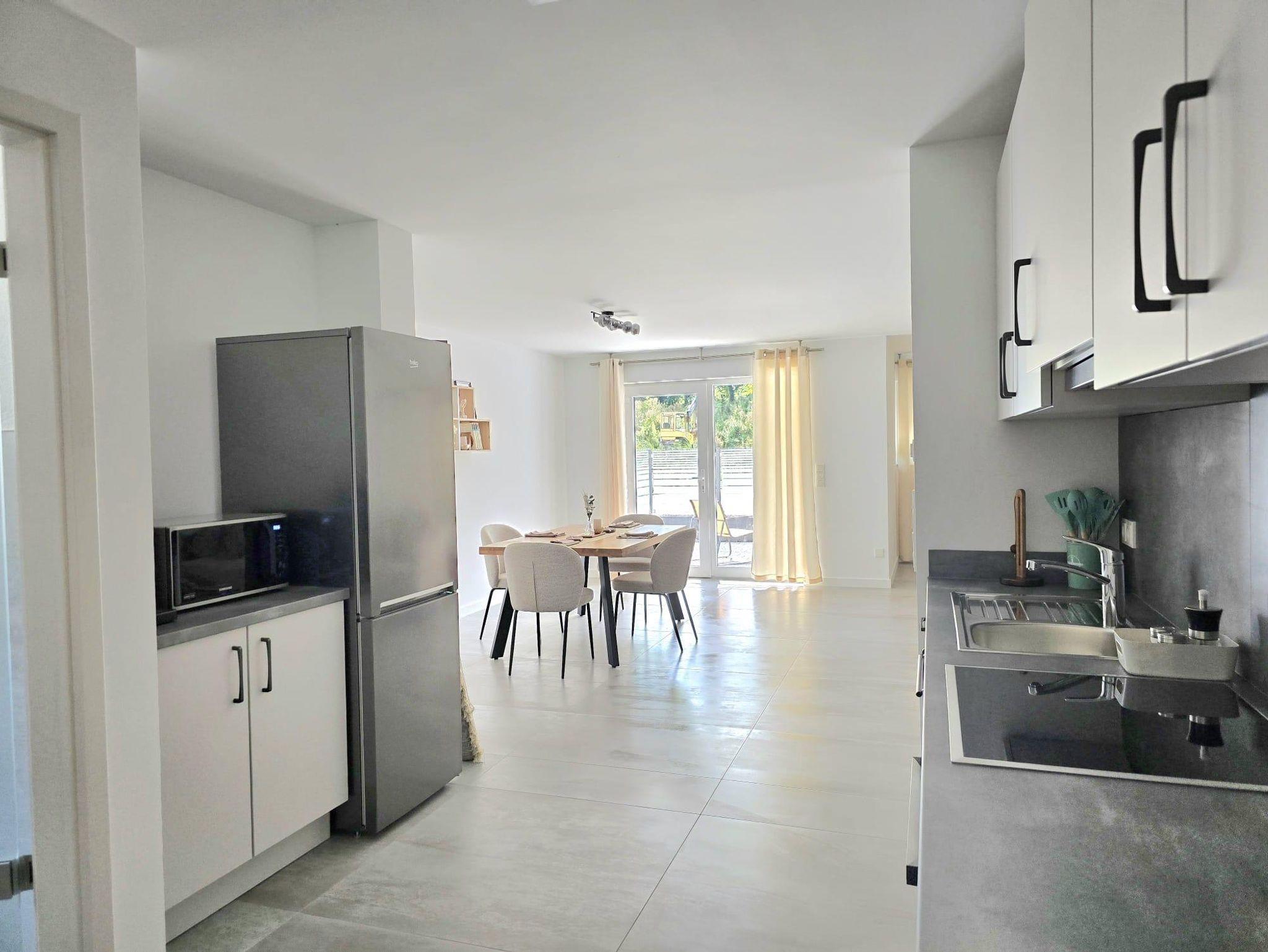 Mit einer Wohnfläche von ca. 65 qm laden wir Sie herzlich in unsere neu gebaute und moderne Ferienwohnung ein. Der offene Wohnraum umfasst einen großzügigen Wohn-, Schlaf- und Essbereich und eine offene, gut ausgestattete Küche. Vom Wohn-, Schlaf- und Essbereich haben Sie direkten Zugang zur überdachten Terrasse mit Sitzgarnitur, auf der Sie den Abend bei einem Glas Wein ausklingen lassen können. Darüber hinaus gibt es ein geräumiges Badezimmer mit ebenerdiger Dusche und WC.