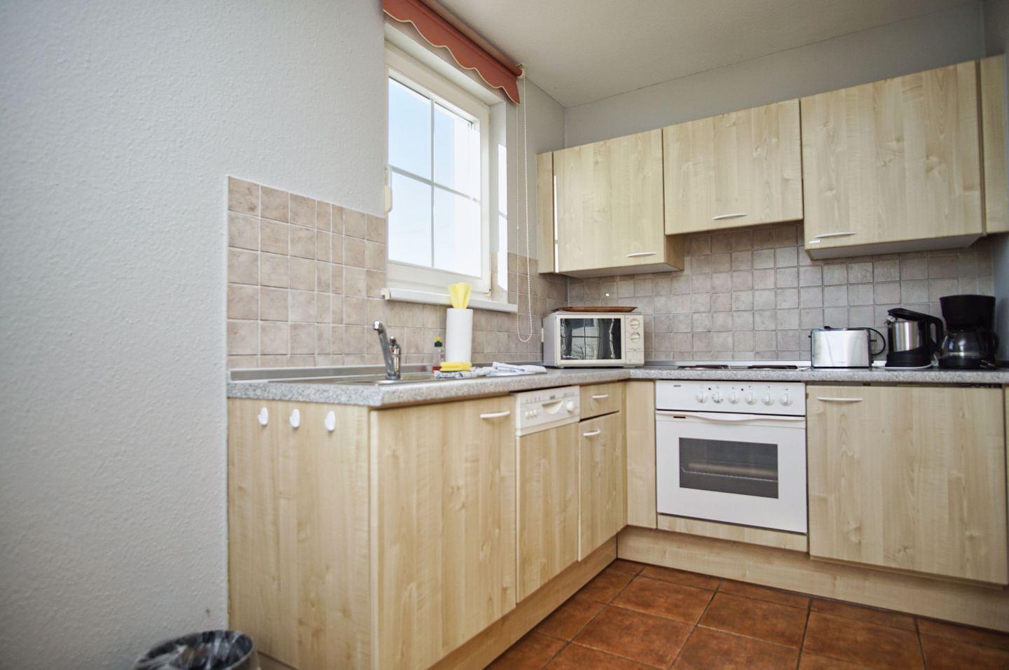 KÜCHE // Küchenzeile, Herd (4-Platten), Kühlschrank, Backofen, Mikrowelle, Toaster, Wasserkocher, Kaffeemaschine, Spülmaschine, reichlich Besteck, Geschirr und Küchenutensilien ++