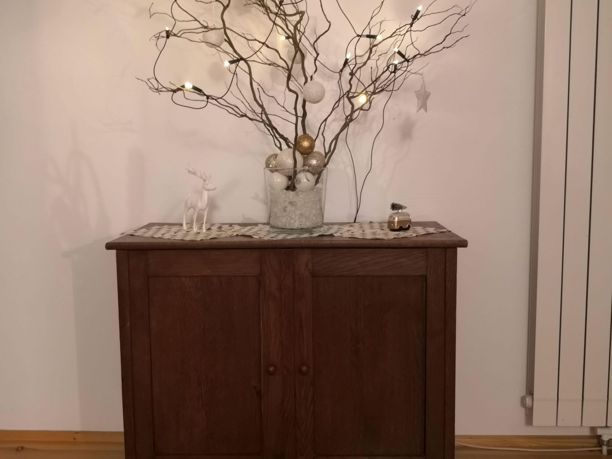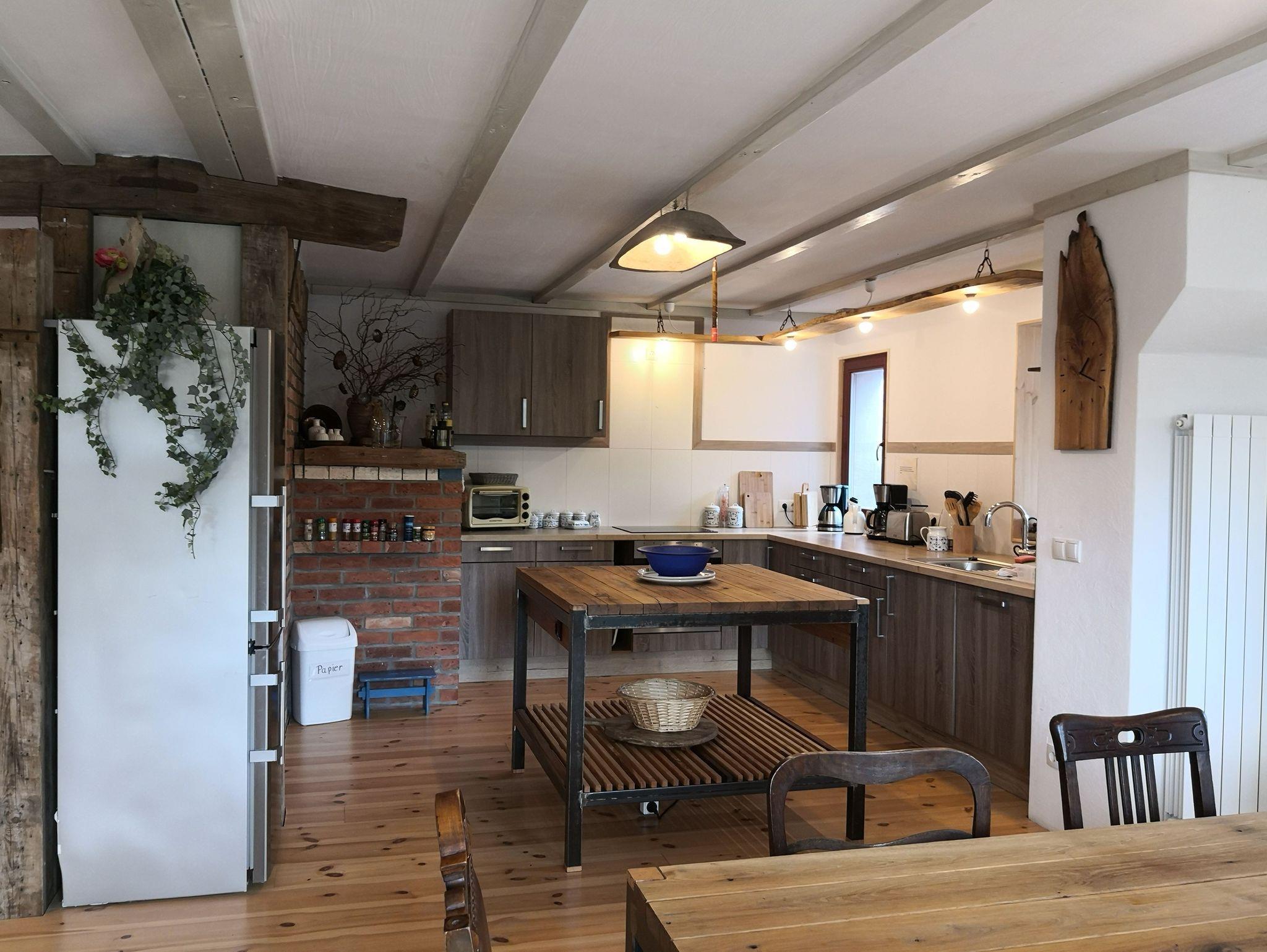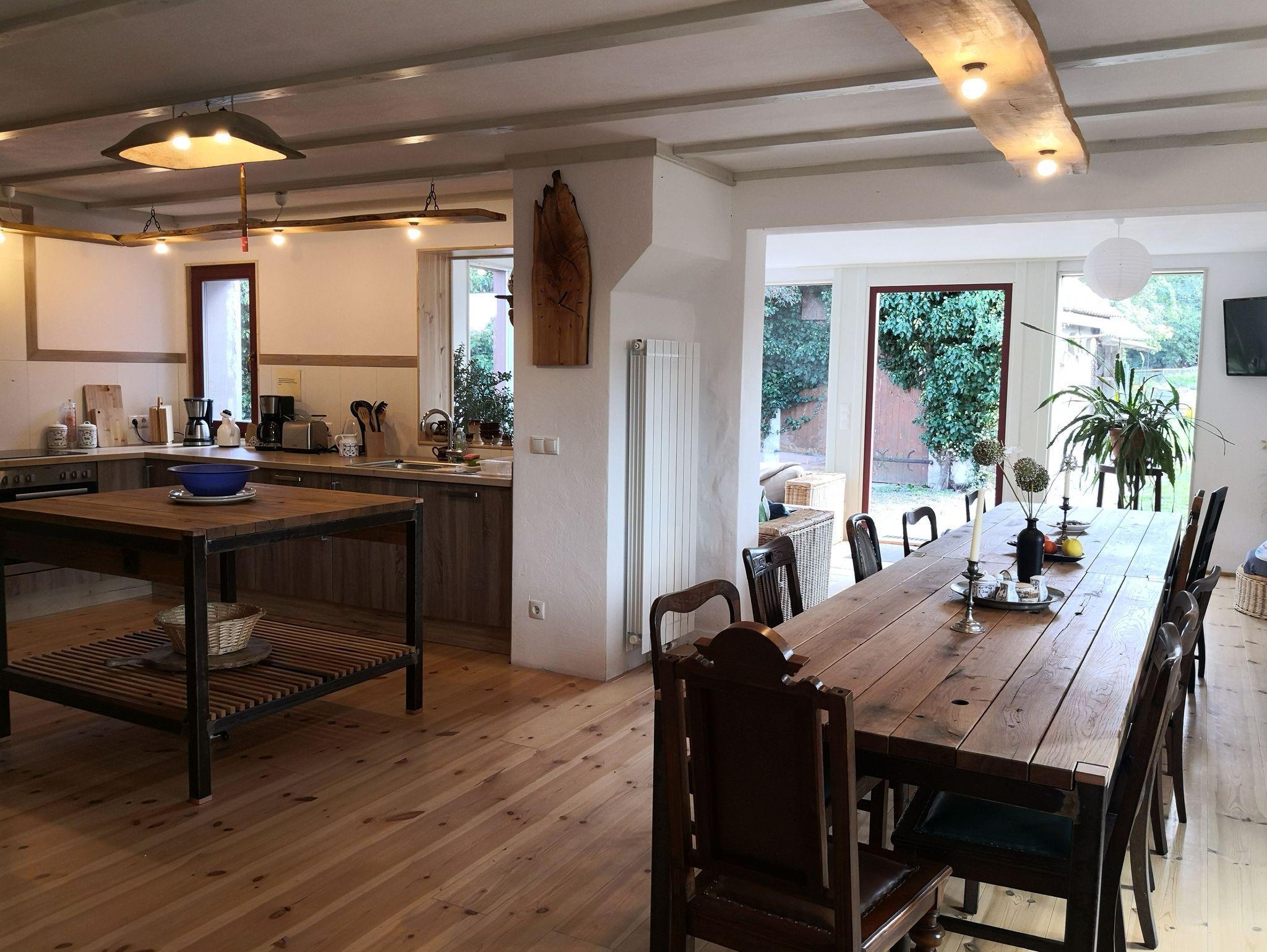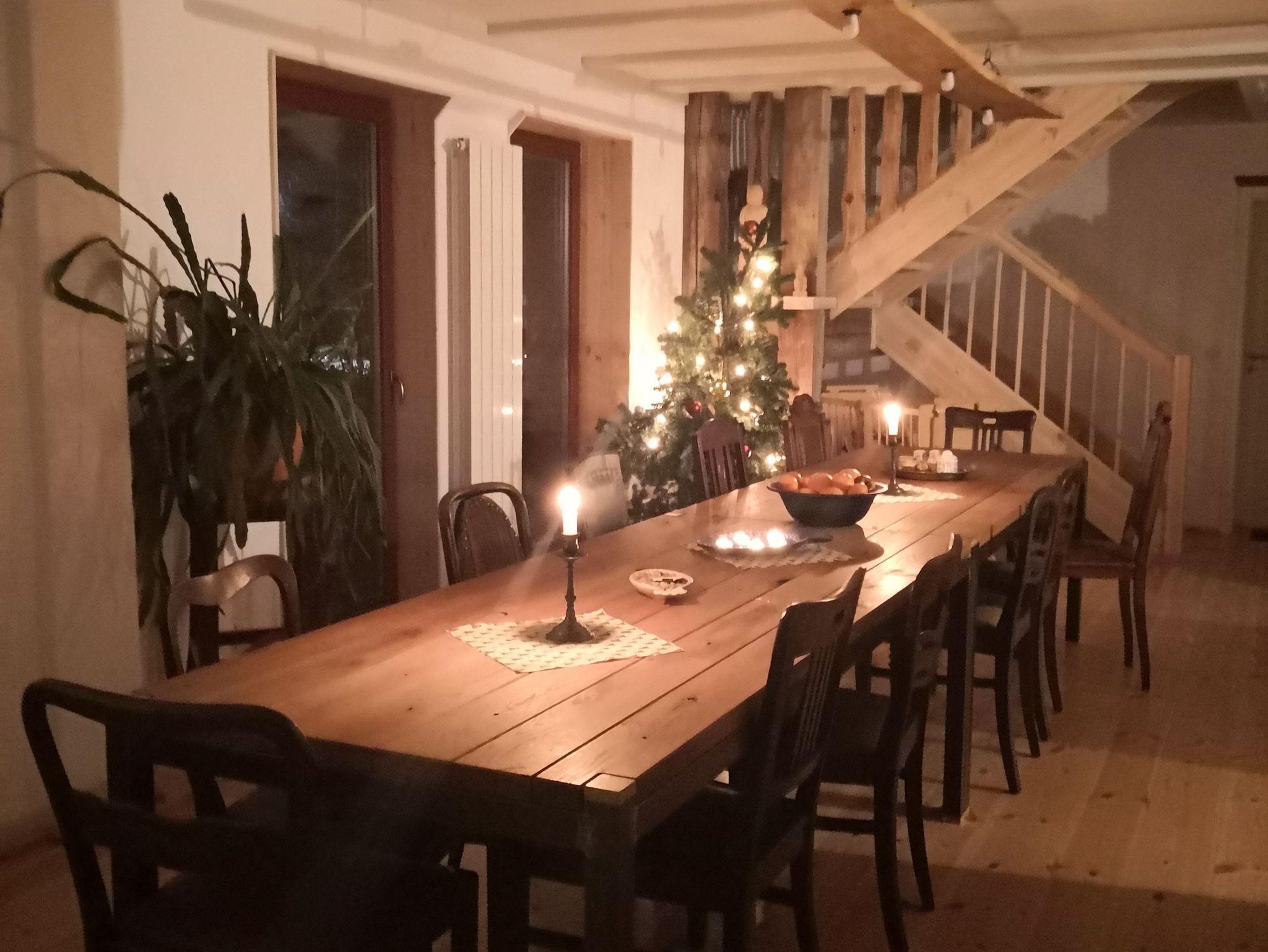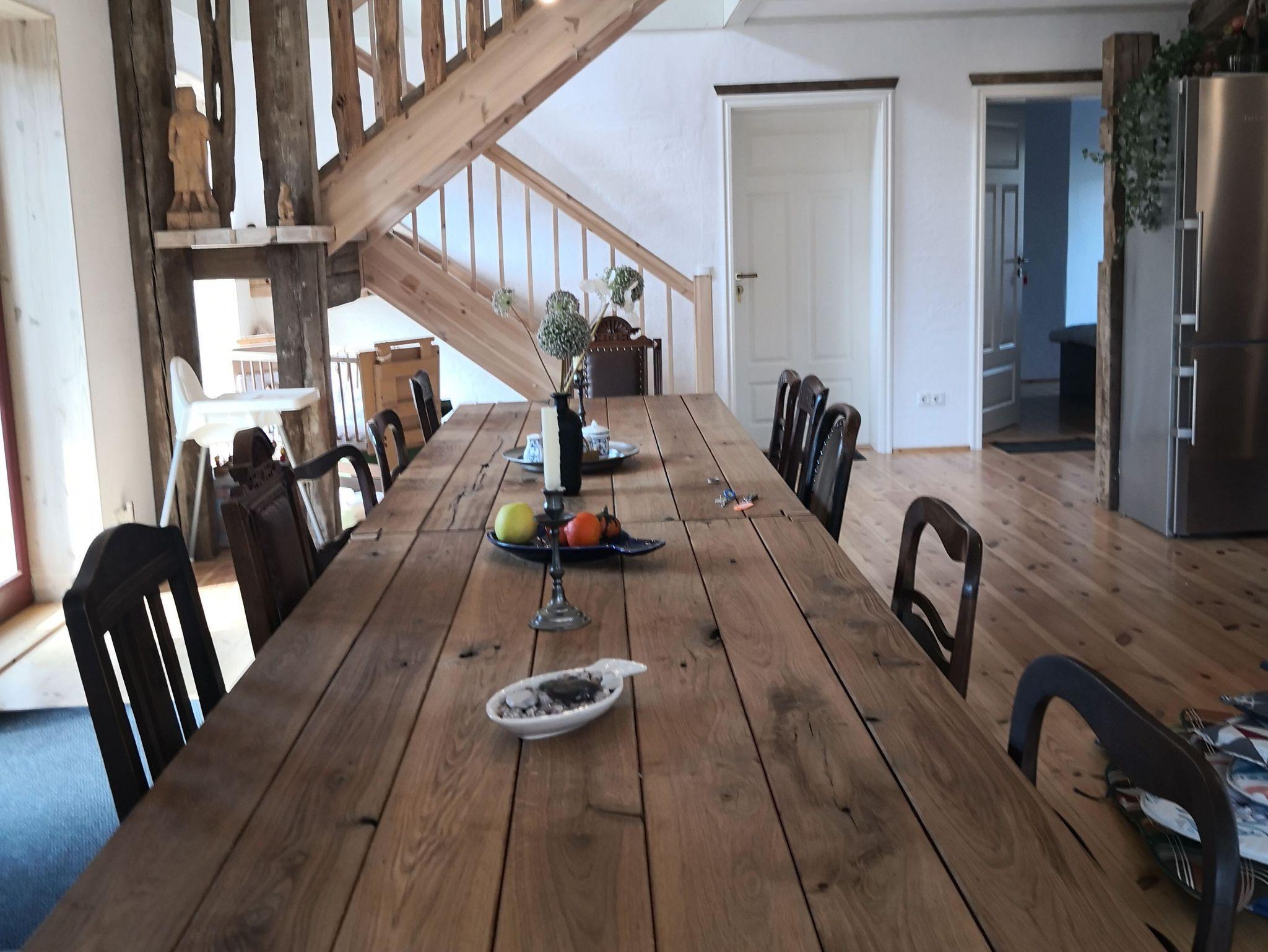 In der Wohnküche gibt es einen großen , massiven Esstisch für 12 Personen, der auch verlängert werden kann.