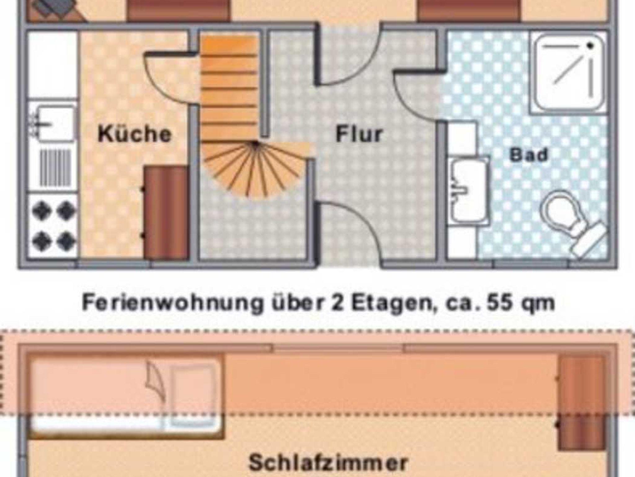 Die Ferienwohnung geht über 2 Etagen und bietet ausreichend Platz für bis zu 4 Personen - ideal also für einen Familienurlaub. Die Wohnung ist über einen separaten Eingang zu erreichen, diese ist komplett ausgestattet, im Wohnzimmer mit Sat-TV, gemütlicher Sitzecke und Essecke, einem Bad mit Dusche und WC, einer separaten Küche und im Obergeschoss befindet Schlafbereich mit 1 Doppelbett und 2 Einzelbetten. Bettwäsche wird zur Verfügung gestellt, Handtücher müssen selbst mit gebracht werden. Die große Terrasse und Spielwiese mit Grillplatz hinter dem Haus kann von den Feriengästen selbstverständlich mit genutzt werden. Ebenso ist ein eigener PKW-Stellplatz vorhanden. Einkaufsmöglichkeiten befinden sich in ca. 300 m Nähe - Friseur und verschiedene Gaststätten sind ebenfalls in unmittelbarer Nähe vorhanden.