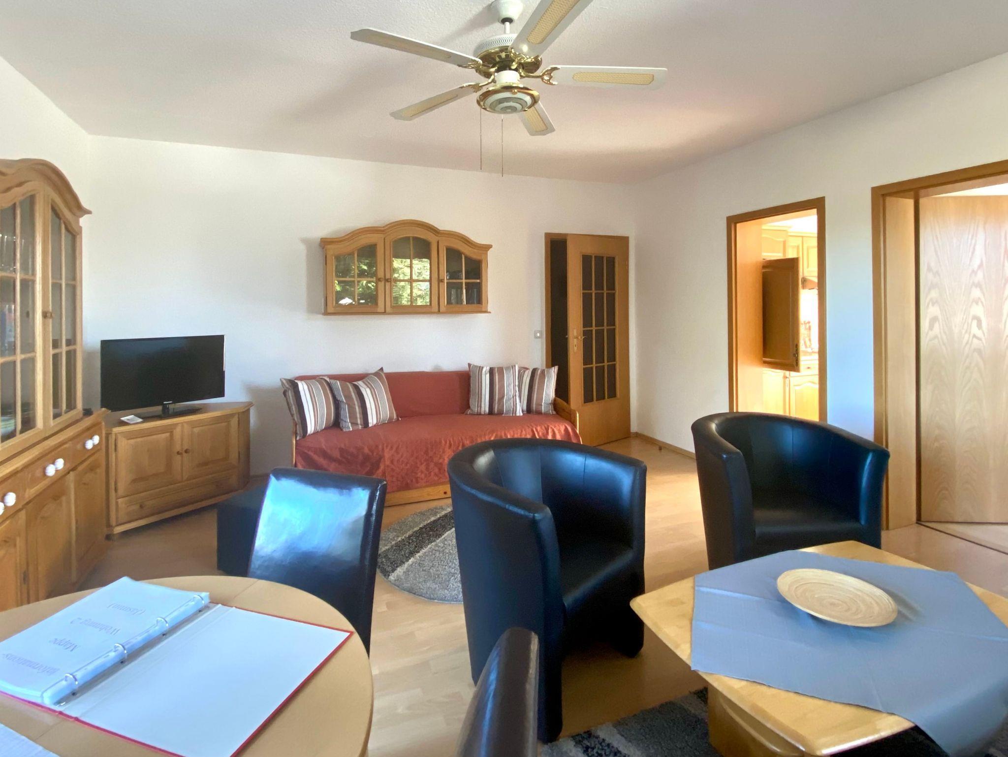 Die Ferienwohnung verfügt über ein separates Schlafzimmer mit zwei getrennt stehenden Betten und ein Wohnzimmer mit gemütlicher Sitzecke. Im Wohnzimmer finden Sie zudem noch eine kleine Essecke und ein TV-Gerät. Die separate Küche beinhaltet alles, um die Familie mit Leckereien verwöhnen zu können. Desweiteren befindet sich in der Wohnung ein Duschbad mit WC. Zur Ferienwohnung gehört ein 18 qm großer Süd-West-Balkon.