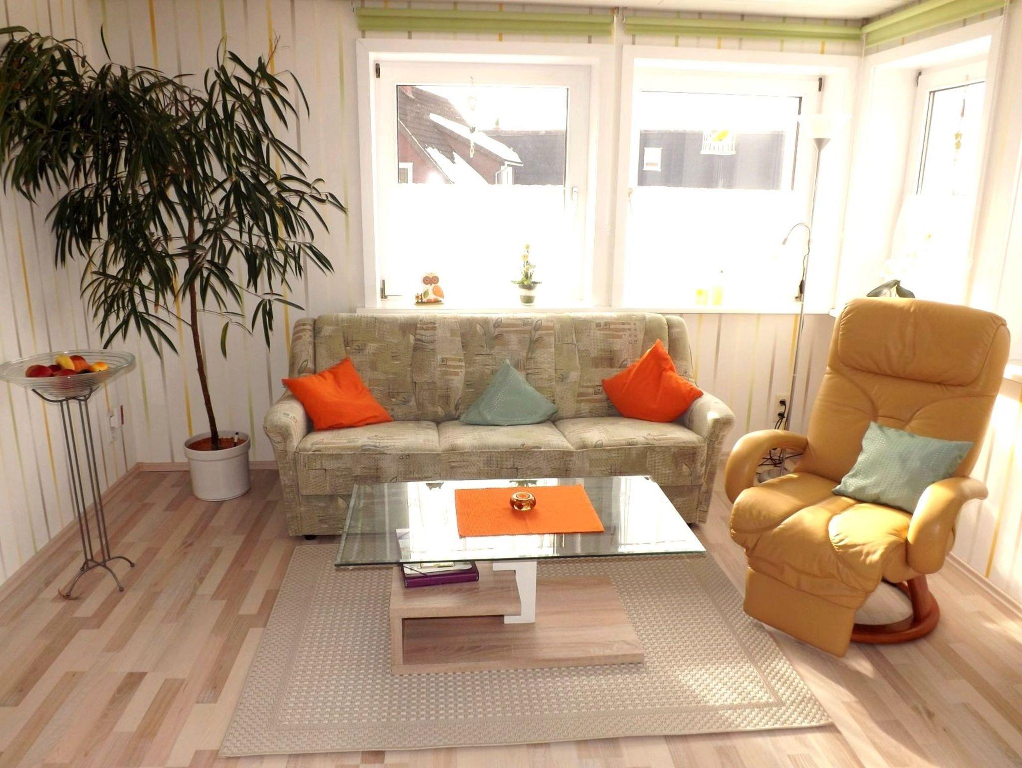 Im Wohnzimmer gibt es neben einem Stresslessessel noch eine gemütliche Couch, eine Wohnwand mit Flachbild- Sat-TV, einer Stereoanlage und einer kleinen Bücher- und Spieleauswahl.