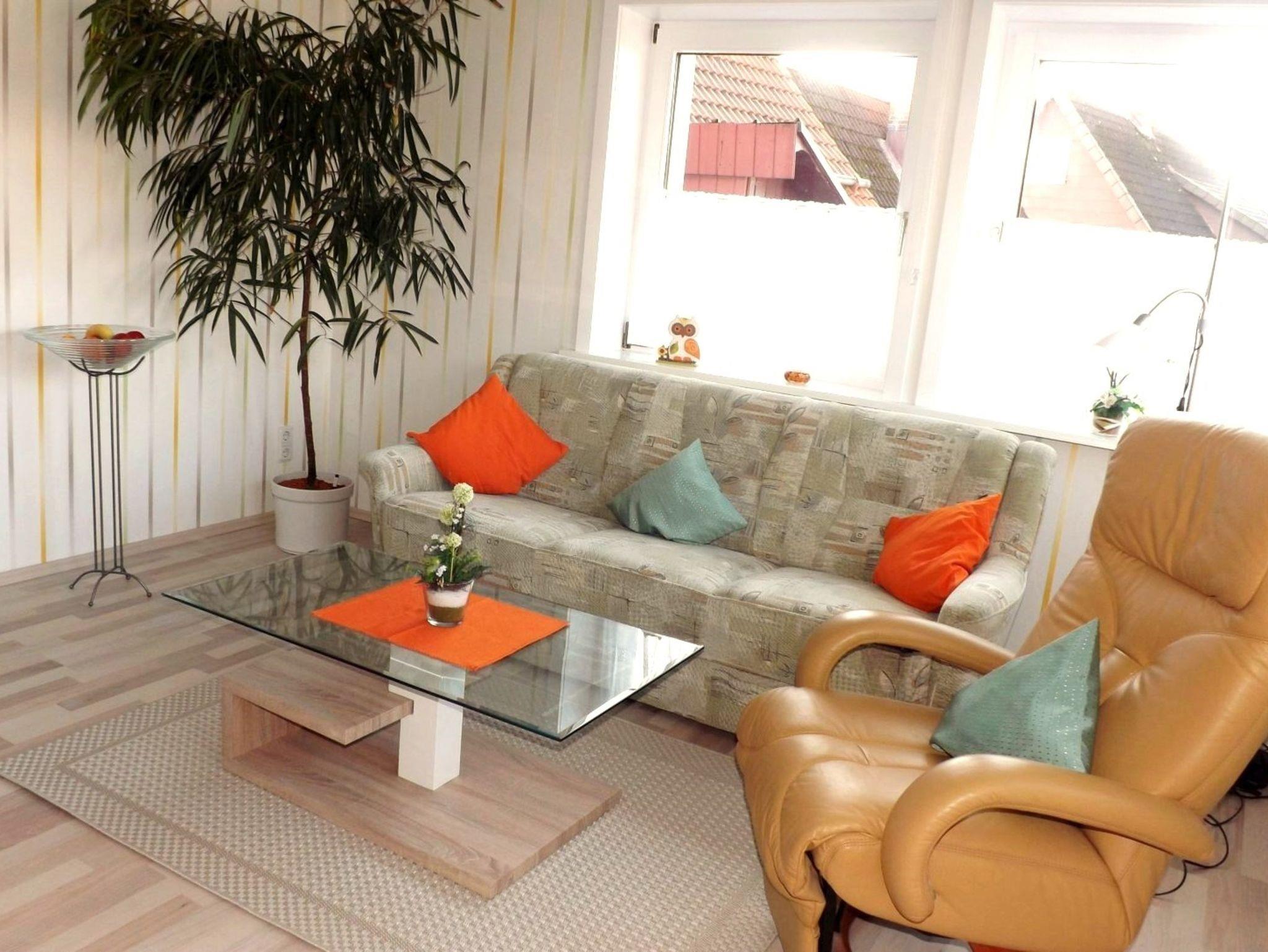 Im Wohnzimmer gibt es neben einem Stresslessessel noch eine gemütliche Schlafcouch, eine Wohnwand mit Flachbild- Sat-TV, einer Stereoanlage und einer kleinen Bücher- und Spieleauswahl.