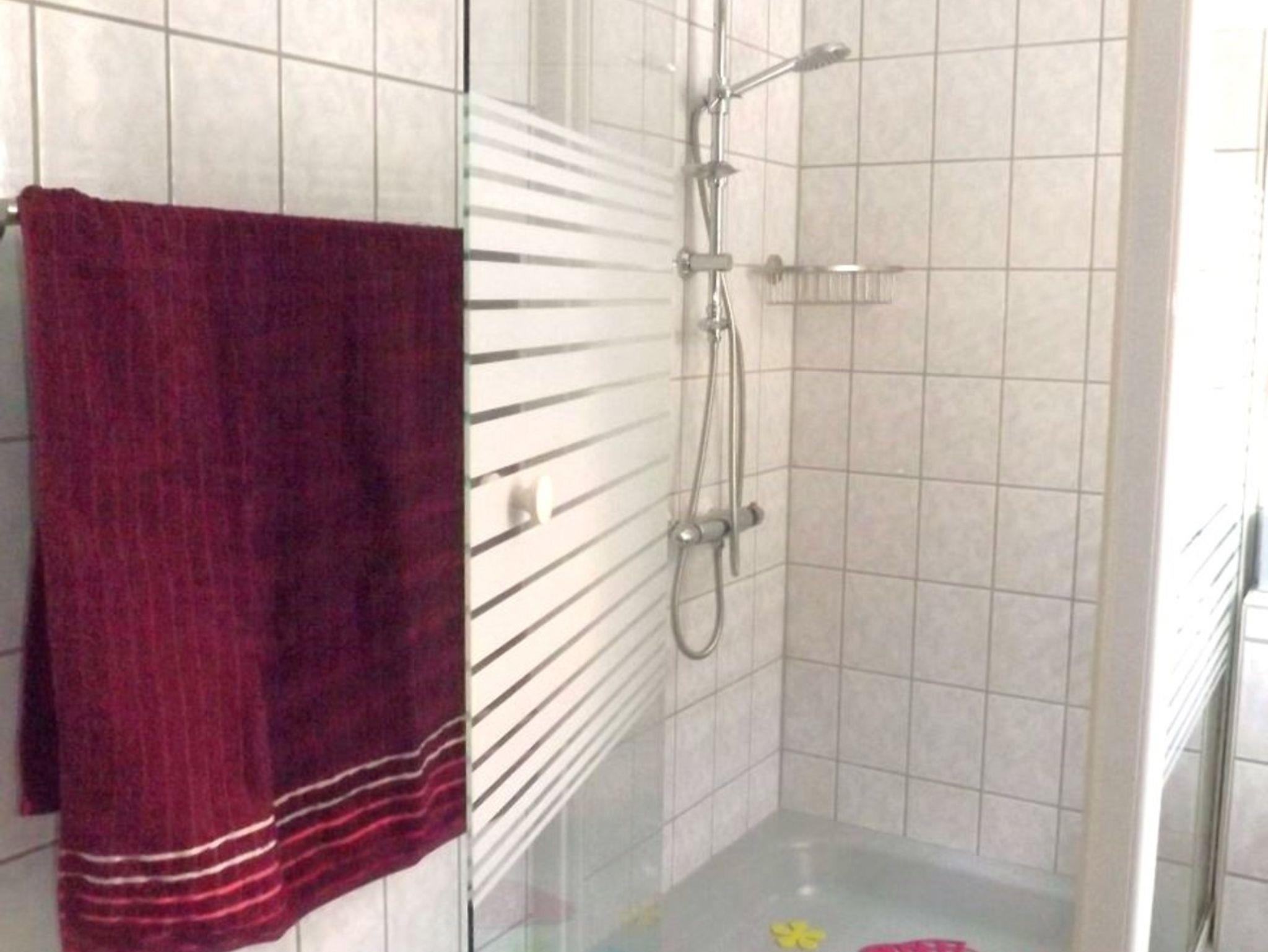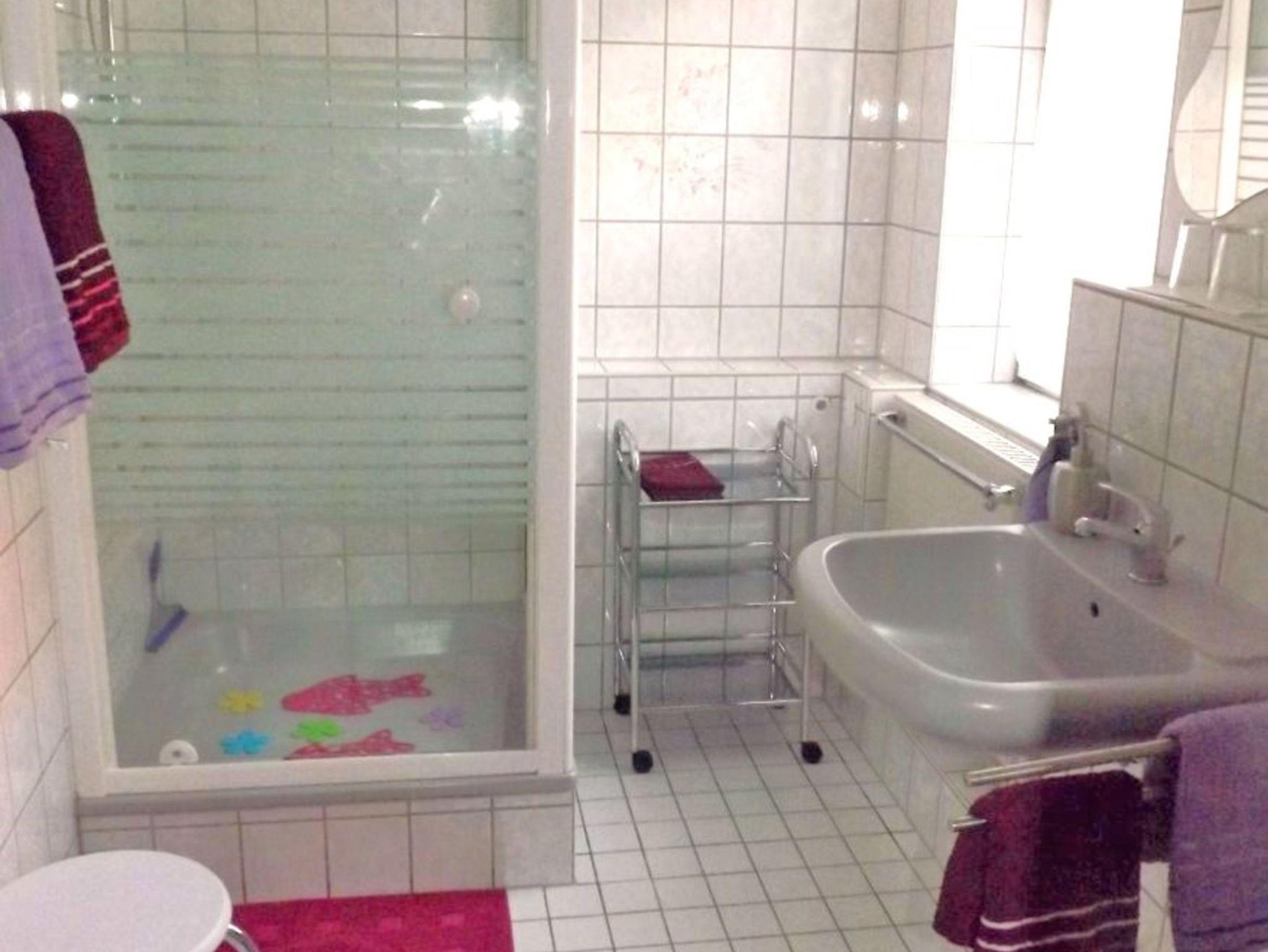 Im hellen und geräumigen Badezimmer gibt es eine moderne Dusche, ein Waschbecken und das WC.