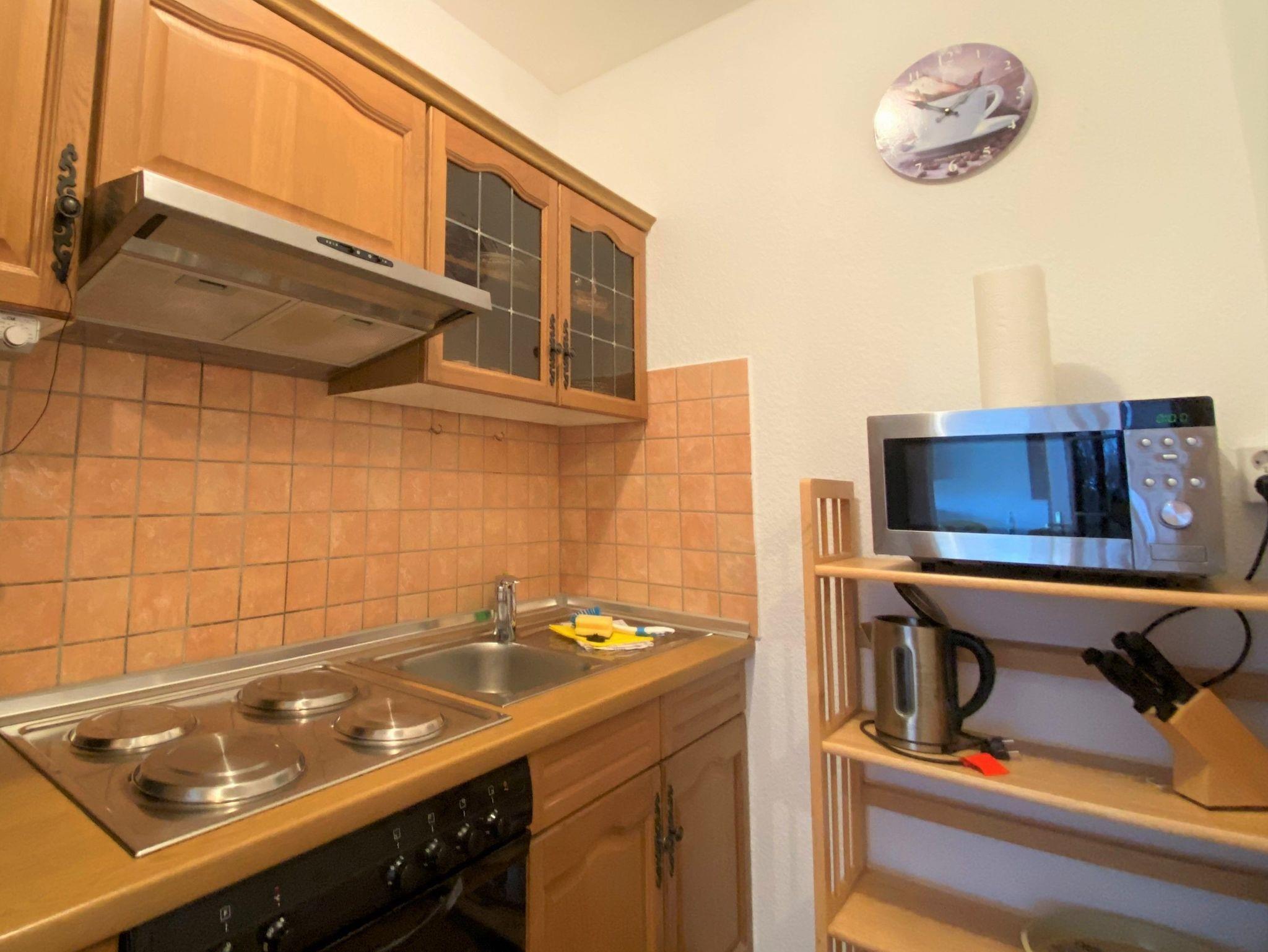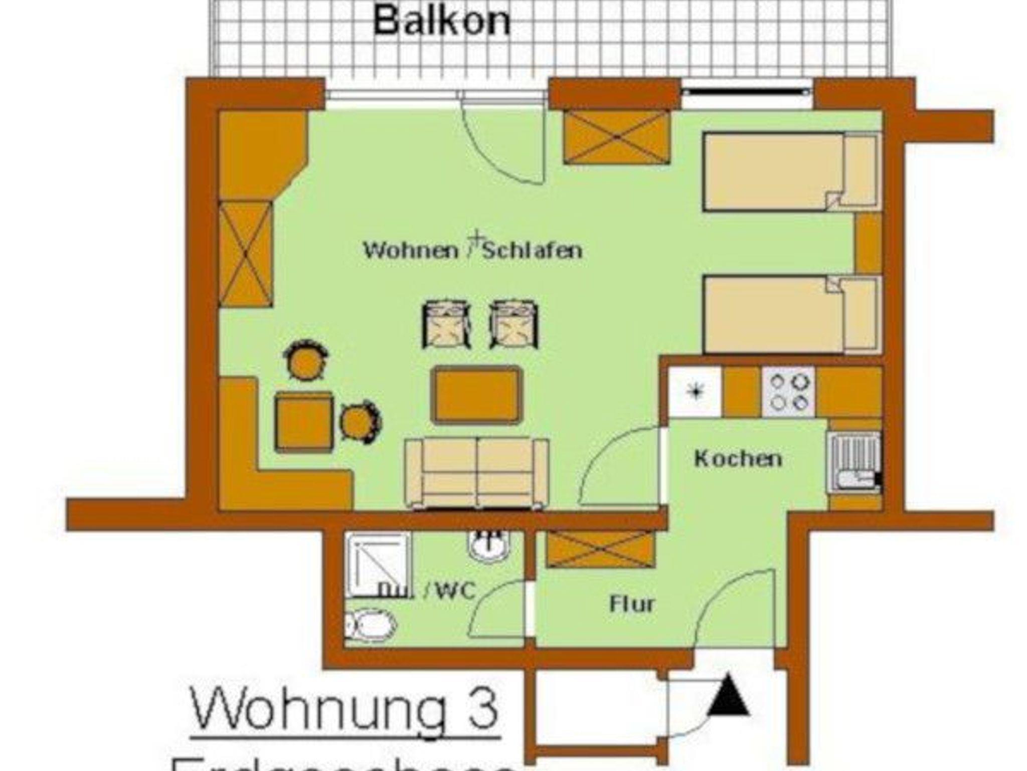 Zur Ferienwohnung gehören Duschbad mit WC sowie eine separate Küche mit allen nötigen Kochutensilien. Außerdem gehört zur Ferienwohnung ein 10 qm großer Balkon der nach Süd-Westen ausgerichtet ist. Eine Kinderaufbettung (bis 6 Jahre) ist auf dem Schlafsofa möglich.