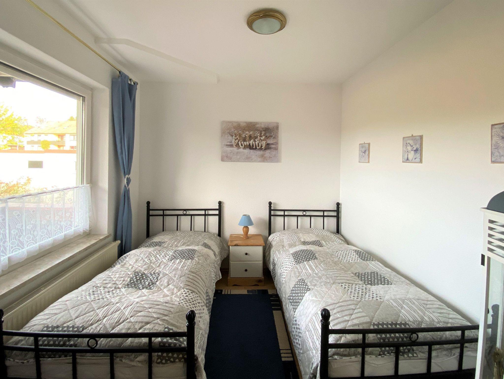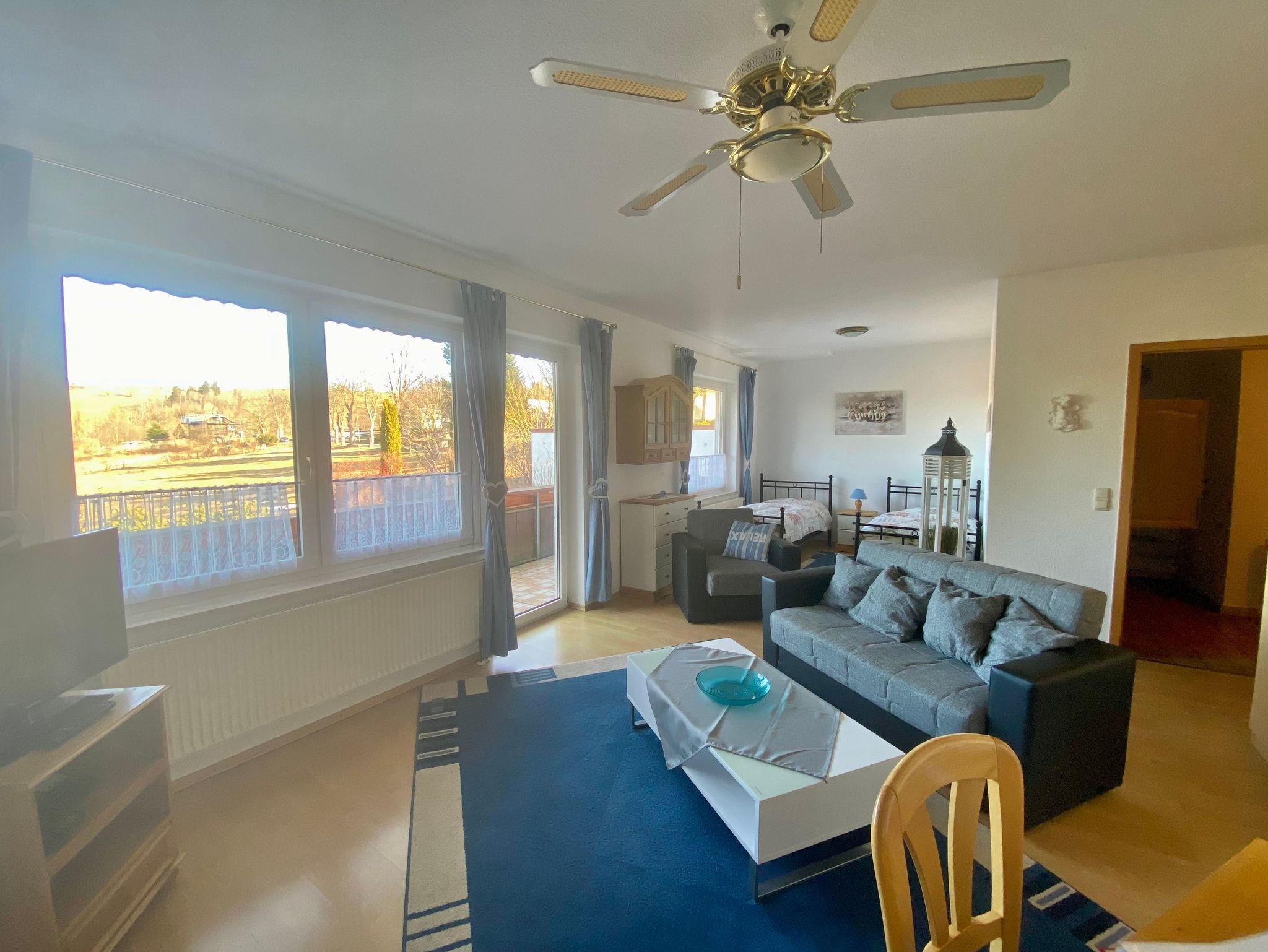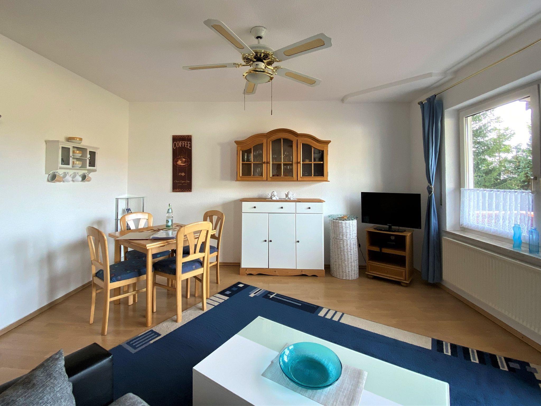 Die Ferienwohnung verfügt über einen kombinierten Wohn- und Schlafraum; dieser ist ausgestattet mit 2 Einzelbetten, Sitzecke, TV und kleinem Esstisch.