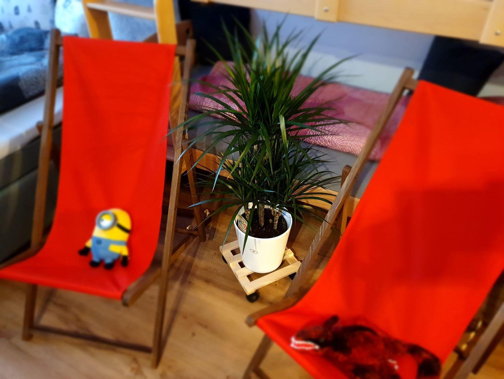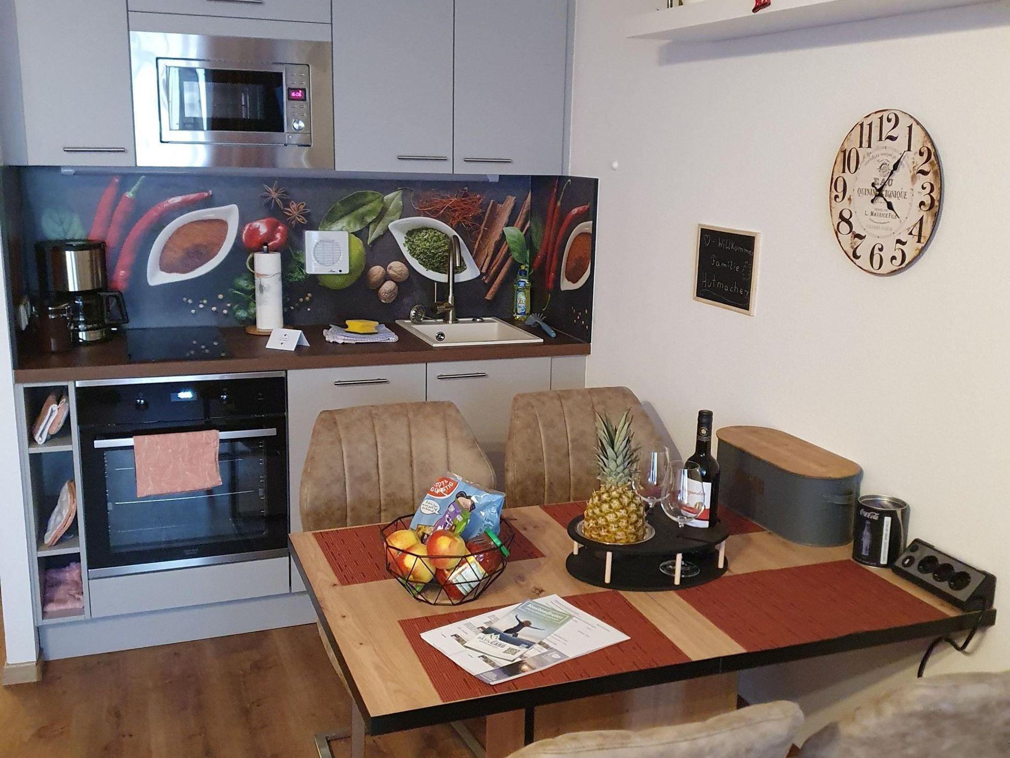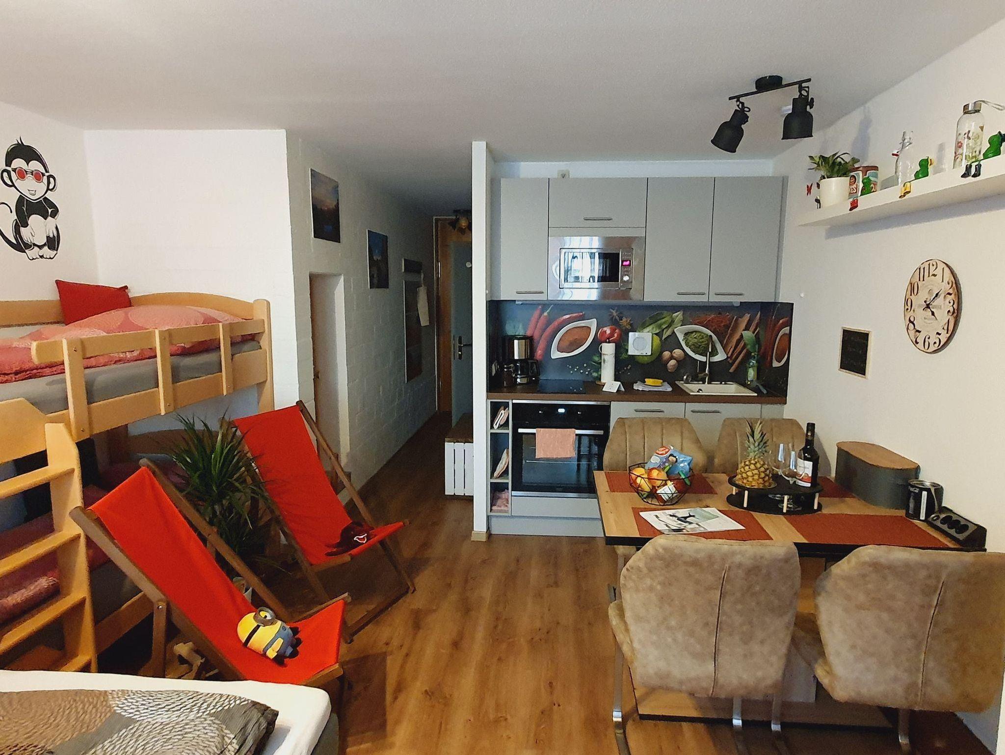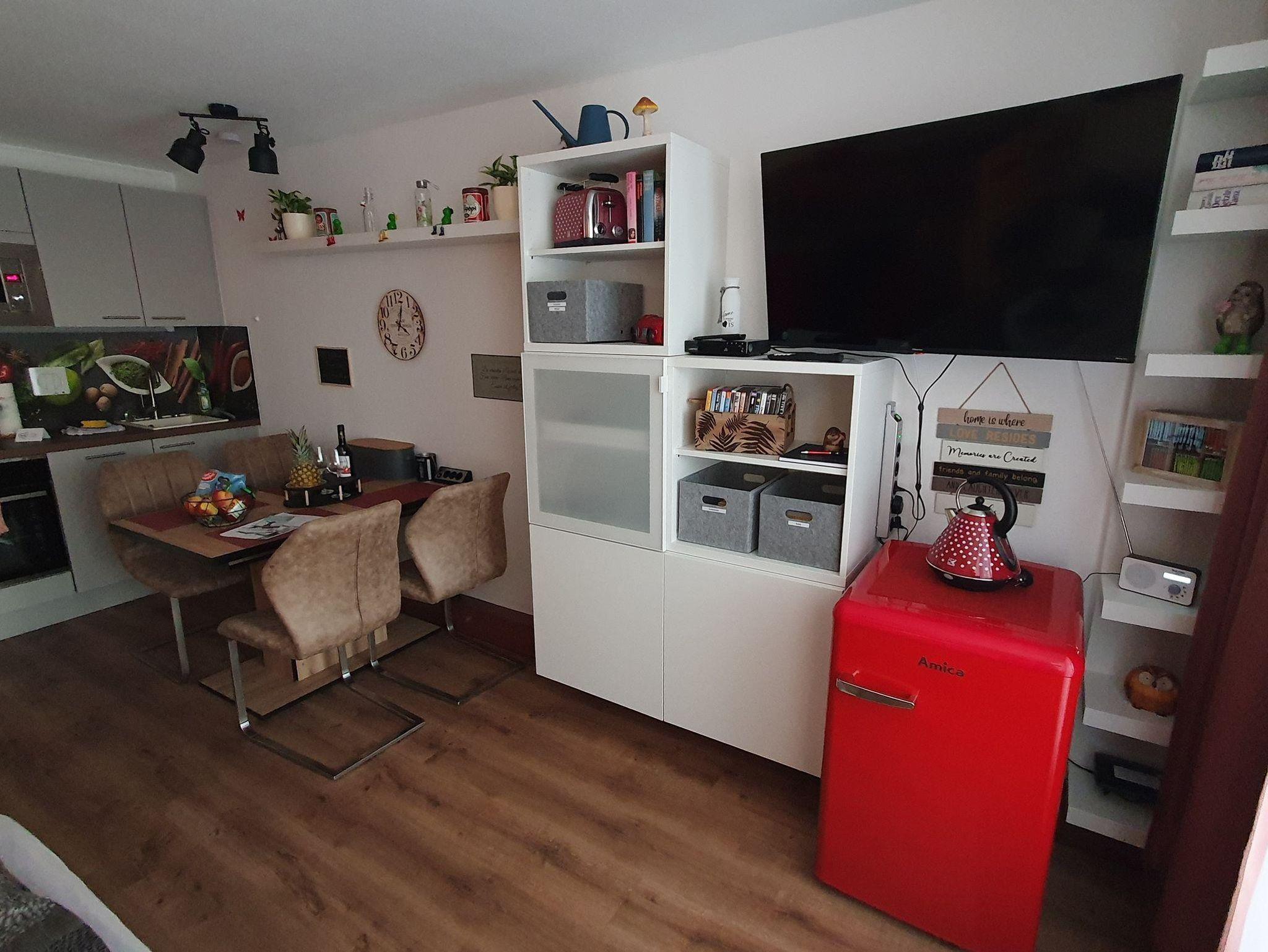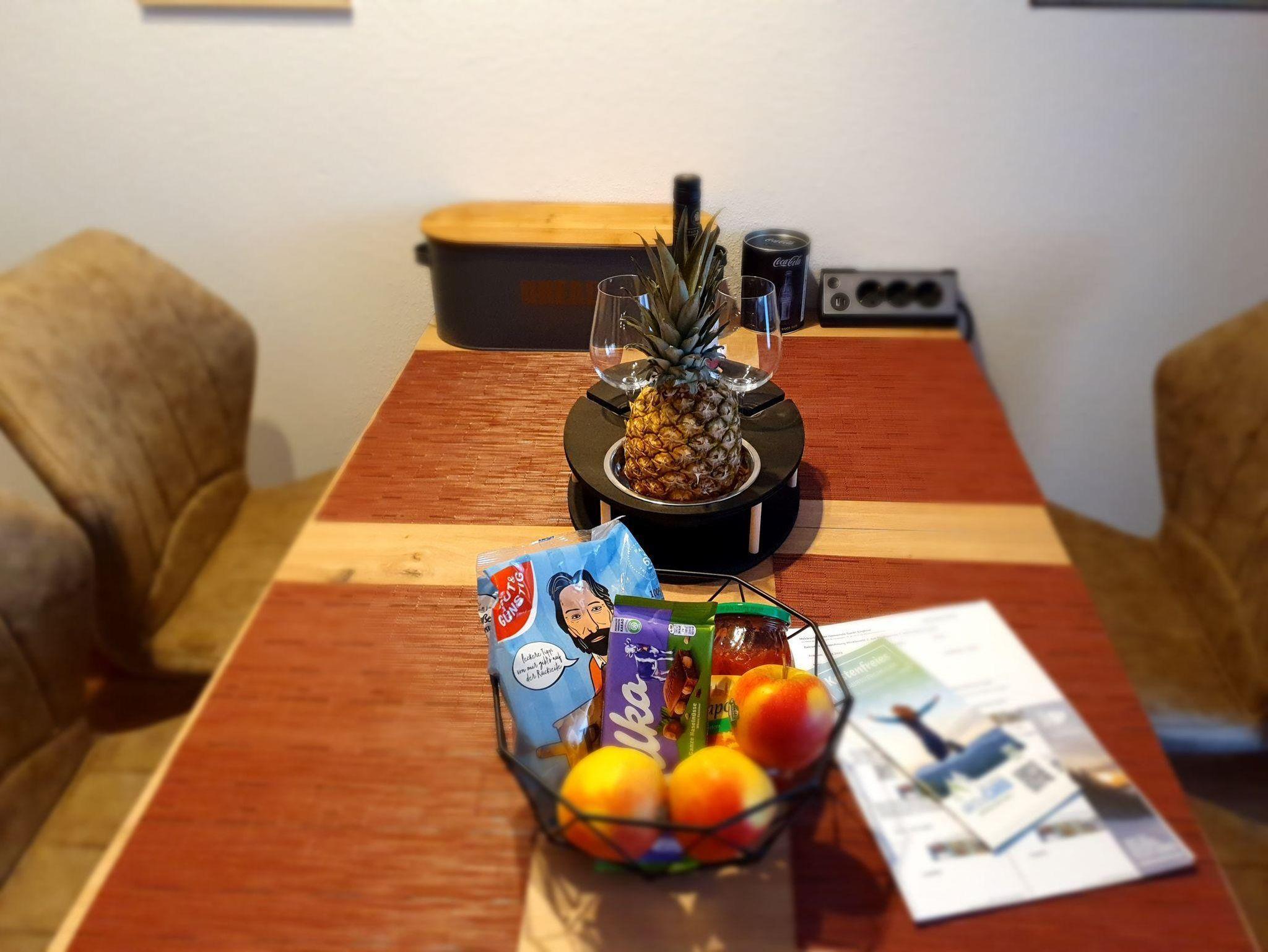 Die 33 qm Unterkunft für bis zu 4 Personen verfügt über einen Wohn-Schlafraum mit Doppelbett und Etagenbett, eigenem Bad, Dusche, Föhn, einer vollausgestatteten Küchenzeile mit Geschirrspüler, Mikrowelle, Kaffeemaschine, Wasserkocher und Herd, einem Essbereich, Flachbild-TV, Kabelempfang, DAB Radio und DVD Player. Handtücher und Bettwäsche werden gestellt. Die Ferienwohnung bietet außerdem kostenfreies WLAN, eine Auswahl an Büchern und Spielen. Auch ein kleines Begrüßungsgeschenk erwartet euch.