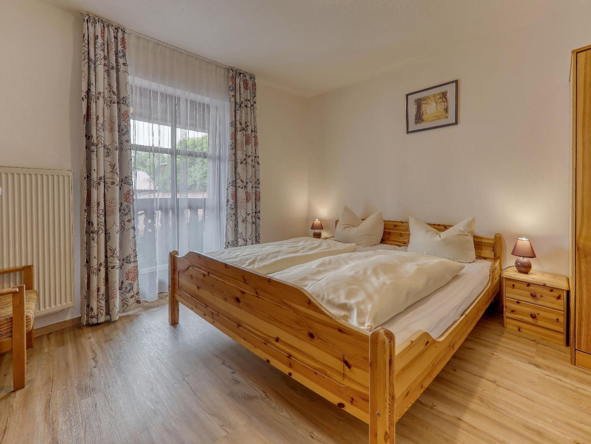 Die schöne, geräumige Ferienwohnung B mit 75qm Wohnfläche liegt im 1. Stock und bietet Platz für bis zu 5 Personen. Das erste Schlafzimmer ist mit einem gemütlichen Doppelbett eingerichtet, das andere mit einem Doppelbett und einem Einzelbett. Das gemütliche große Wohnzimmer ist mit Fernsehcouch, Fernseher, Essecke und Diele mit großer Küchenzeile ausgestattet. In der Küche ist eine Kaffemaschine, ein Wasserkocher, ein Kühlschrank, ein Herd und Backofen vorhanden. Hand-, Bade- und Geschirrtücher werden kostenlos gestellt. Außerdem gibt es kostenlose Begrüßungsgetränke und Sie können das W-Lan frei nutzen. Das Bad ist mit Dusche und WC ausgestattet. Des Weiteren haben Sie einen großen Balkon auf der Sie die Sonne genießen können. Auch buchbar als Wohnung für 2 Personen mit getrennten Schlafzimmern. Außerdem gibt es eine große Sonnenterrasse mit Liegestühlen im 1. Stock, einen Garten mit Grillmöglichkeit, einen Aufenthaltsraum, eine Tischtennisplatte, Bücher und viele Spiele sowie Autostellplätze.