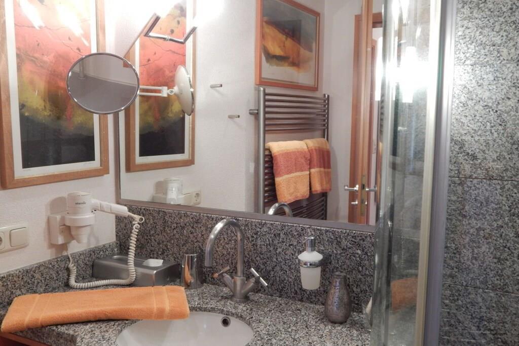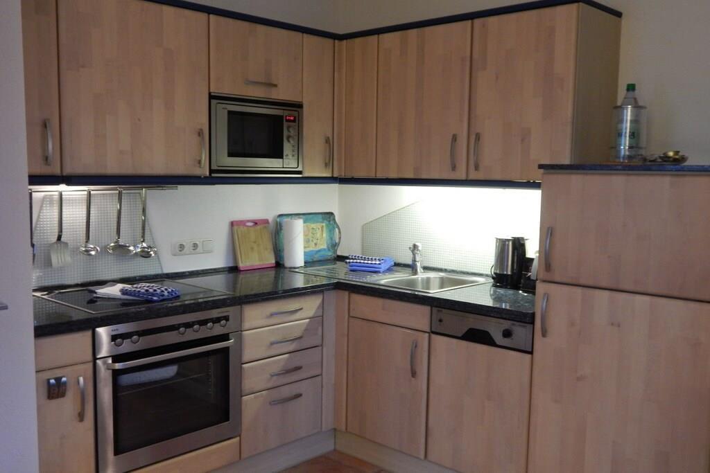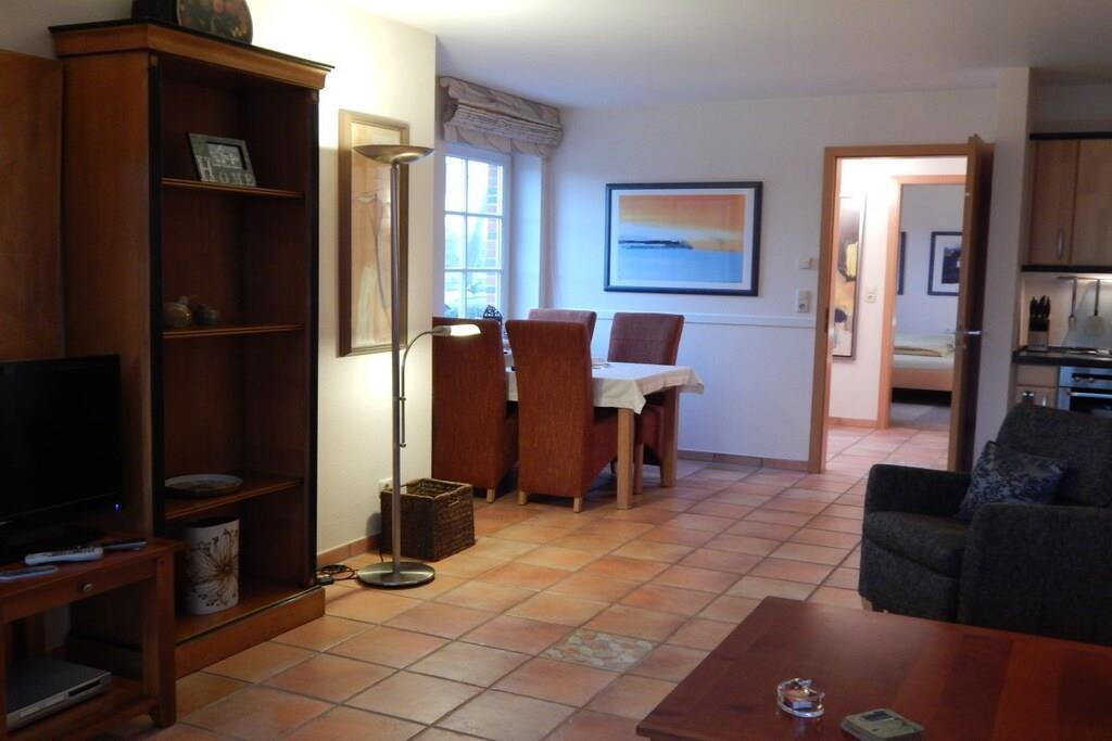 Diese Ferienwohnung mit separatem Eingang lässt mit seiner luxuriösen Ausstattung keine Wünsche offen. Exklusive Möbel, Accessoires und allerlei Annehmlichkeiten sind stilvoll aufeinander abgestimmt. Im hochwertigen Bad mit Granitausstattung finden sie eine ebenerdige Dusche mit Klappsitz, sowie einen Handtuchwärmer mit Handtüchern u. Bademänteln vor. Das Schlafzimmer ist neu ausgestattet. Die Küche ist mit allem ausgestattet, was das Kochen zum Vergnügen macht. Im gemütlichen Wohnzimmer befindet sich selbstverständlich , TV und DVD-Player mit Stereoanlage. Die eigene Terrasse lädt zum Verweilen ein. Die gesamte Ferienwohnung verfügt über eine Fußbodenheizung u. W-LAN. Genießen Sie die Ruhe in unserer Sauna im Außen-Gartenbereich.