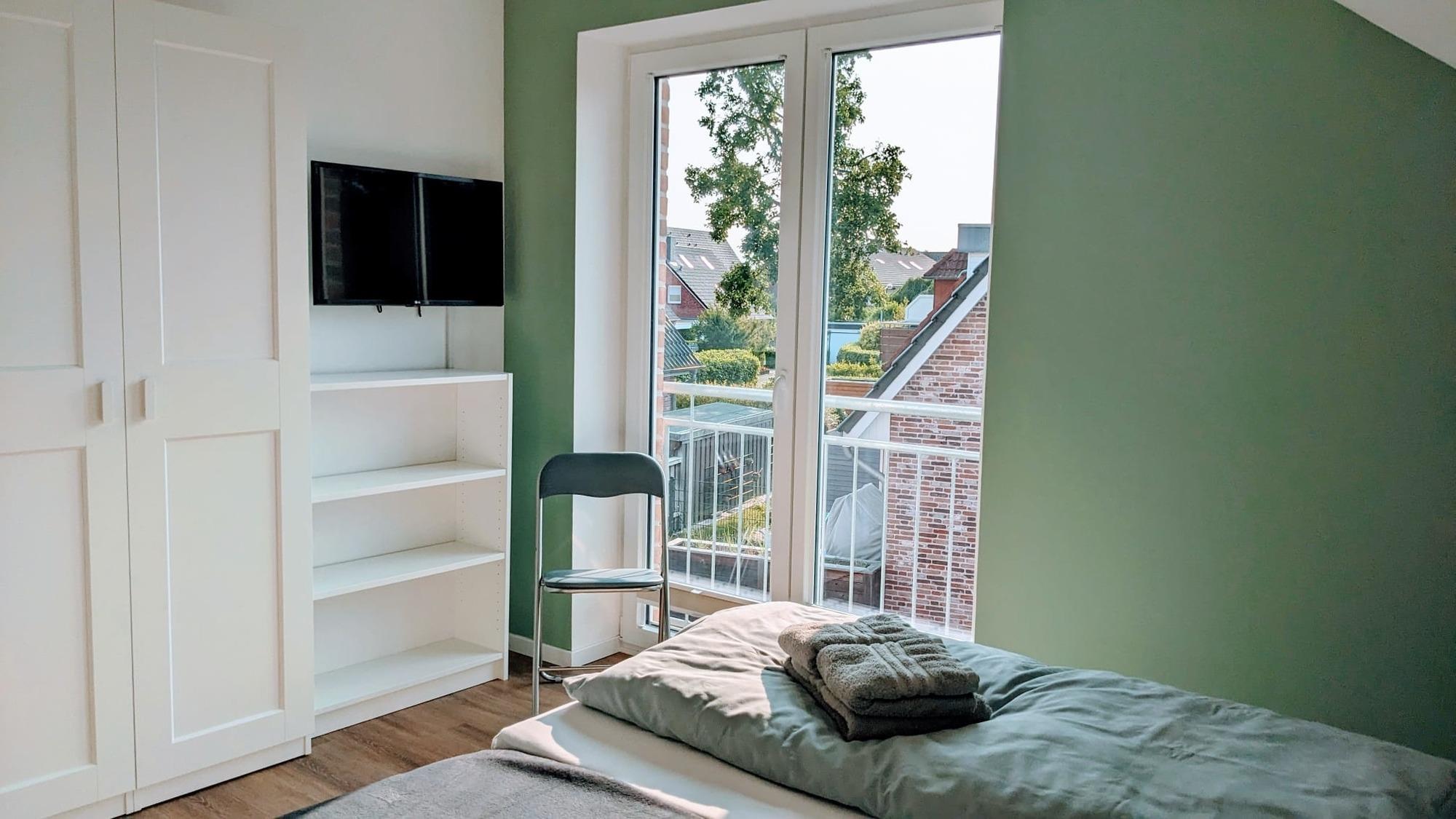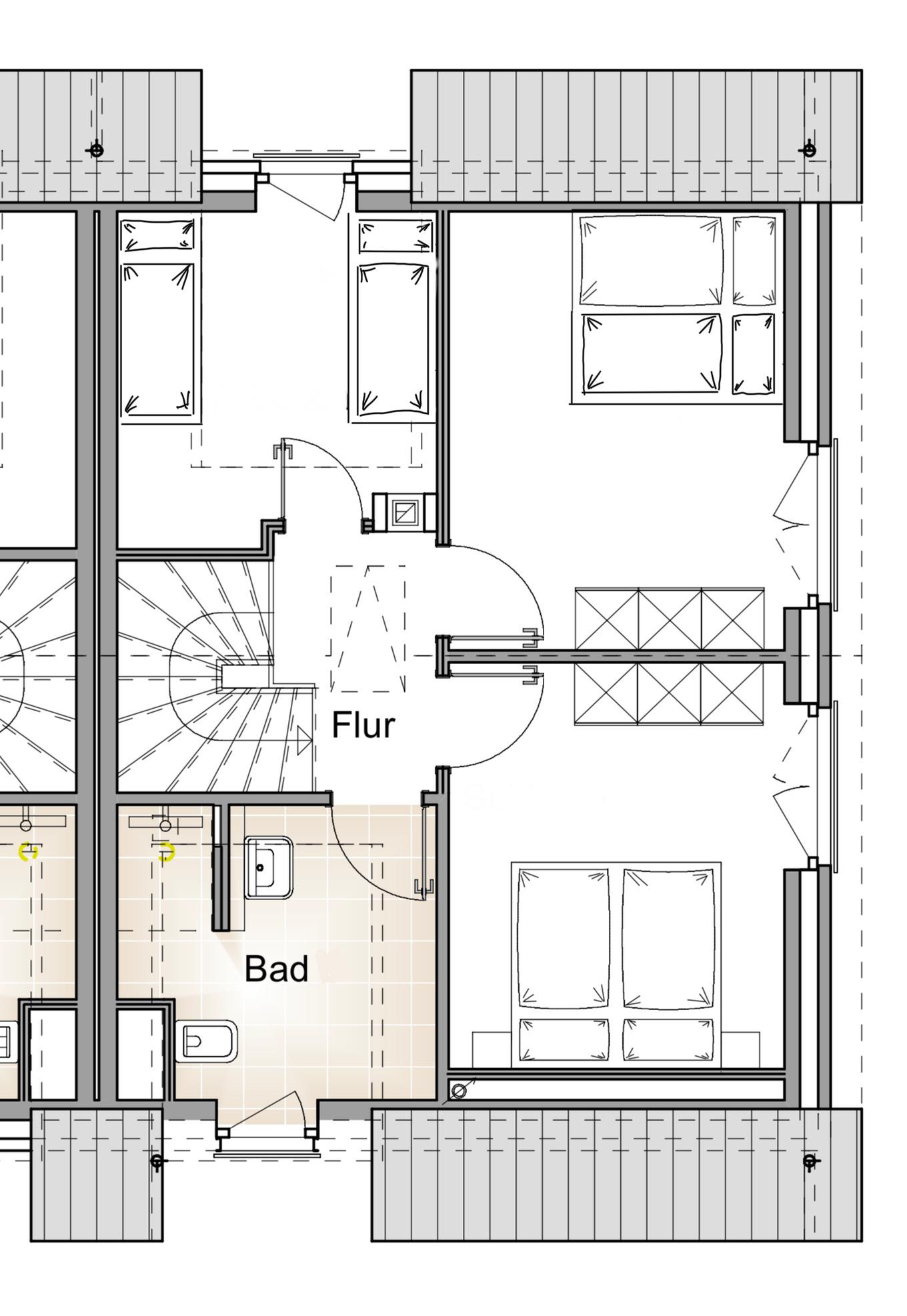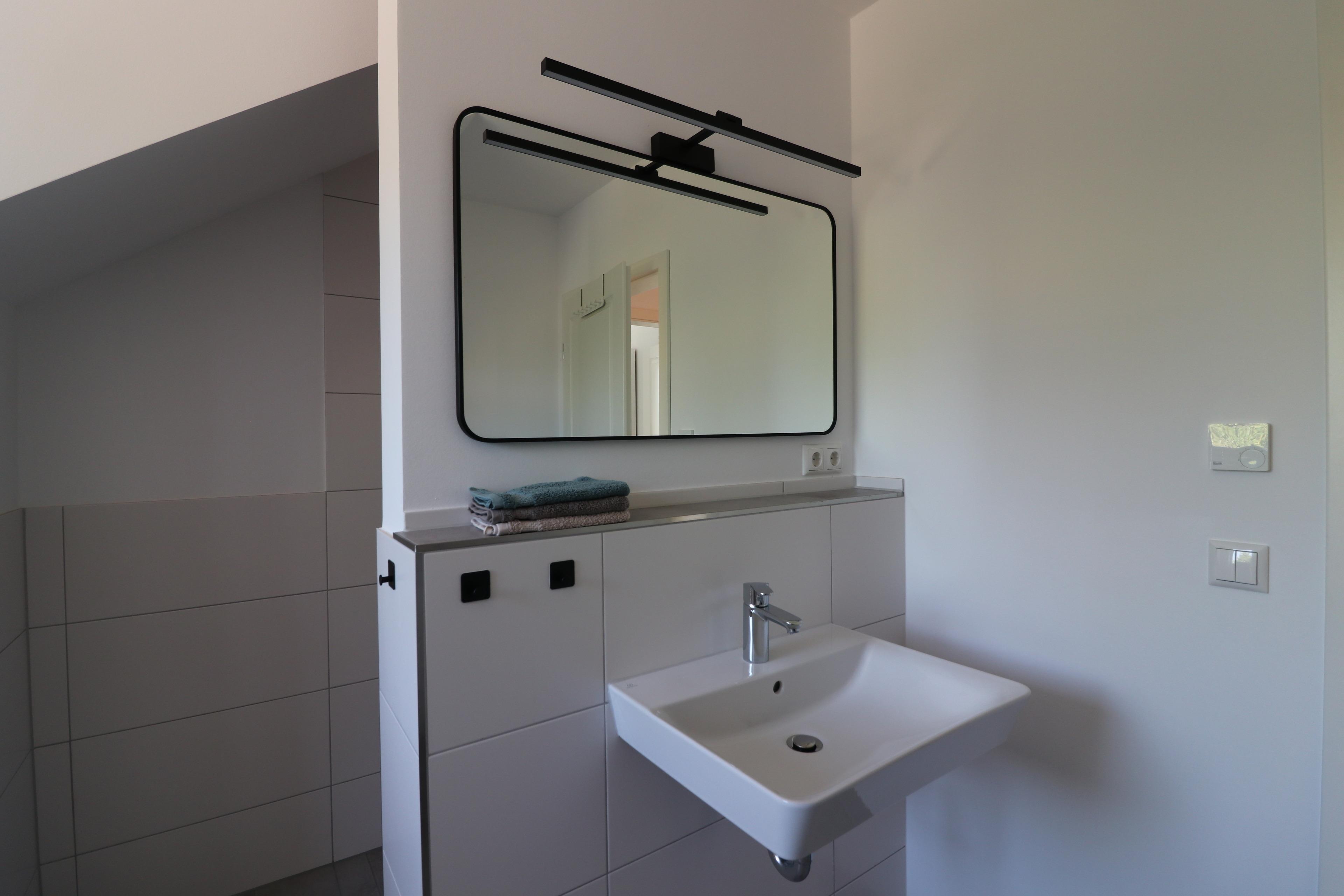 OG: Hochwertiges Badezimmer mit geräumiger Dusche, Waschtisch und WC. Zwei nordisch dekorierte Schlafräume mit je einem Doppelbett sowie Flat-TV. Zusätzlich ein weiterer Raum mit zwei seitlich angeordneten Einzelbetten.