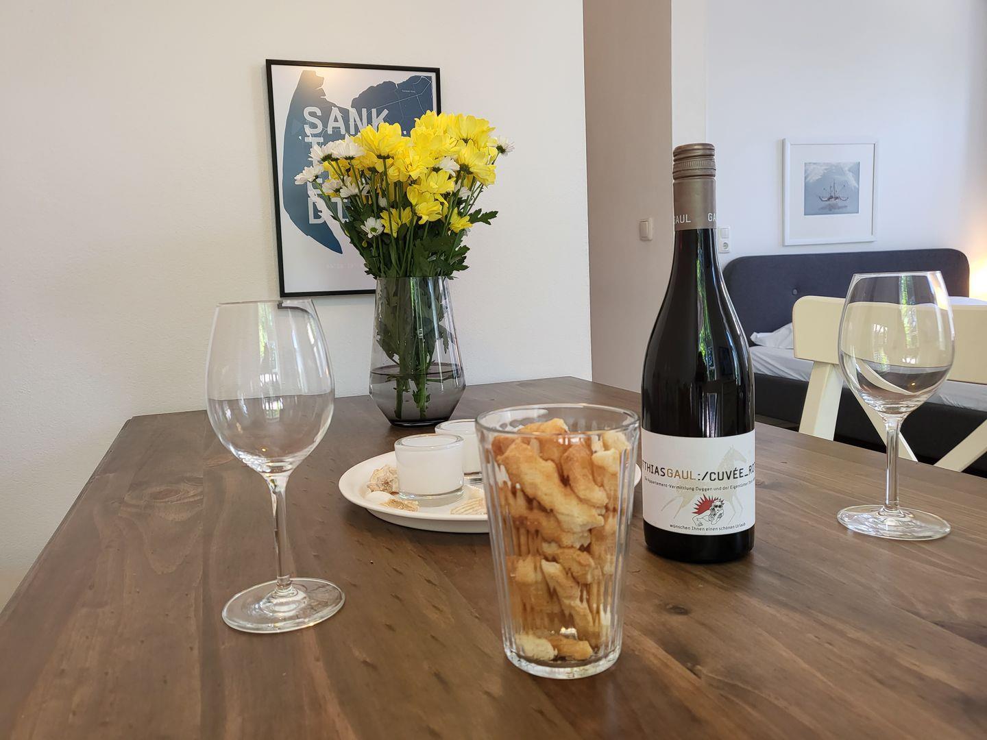 Zur Ausstattung gehört ein 160x200cm Doppelbett, zwei Sessel als Sitzecke zum Verweilen und ein Esstisch mit einer Bank und zwei Stühlen. Zur Ausstattung des modernen Wohn- und Schlafraumes gehören unter anderem ein Smart-TV und kostenfreies W-LAN. Die Küchenzeile ist offen im Wohnraum und bietet allen Komfort, den man von zu Hause gewohnt ist. Unter anderem stehen Geschirrspüler, Cerankochfeld, Backofen sowie Mikrowelle und Kühlschrank zur Verfügung, zusätzlich zur Kaffeefiltermaschine gibt es eine Nespresso Kapselmaschine. Ein kleiner Flur mit Garderobe trennt den Wohn-Schlafraum von dem Duschbad mit WC.