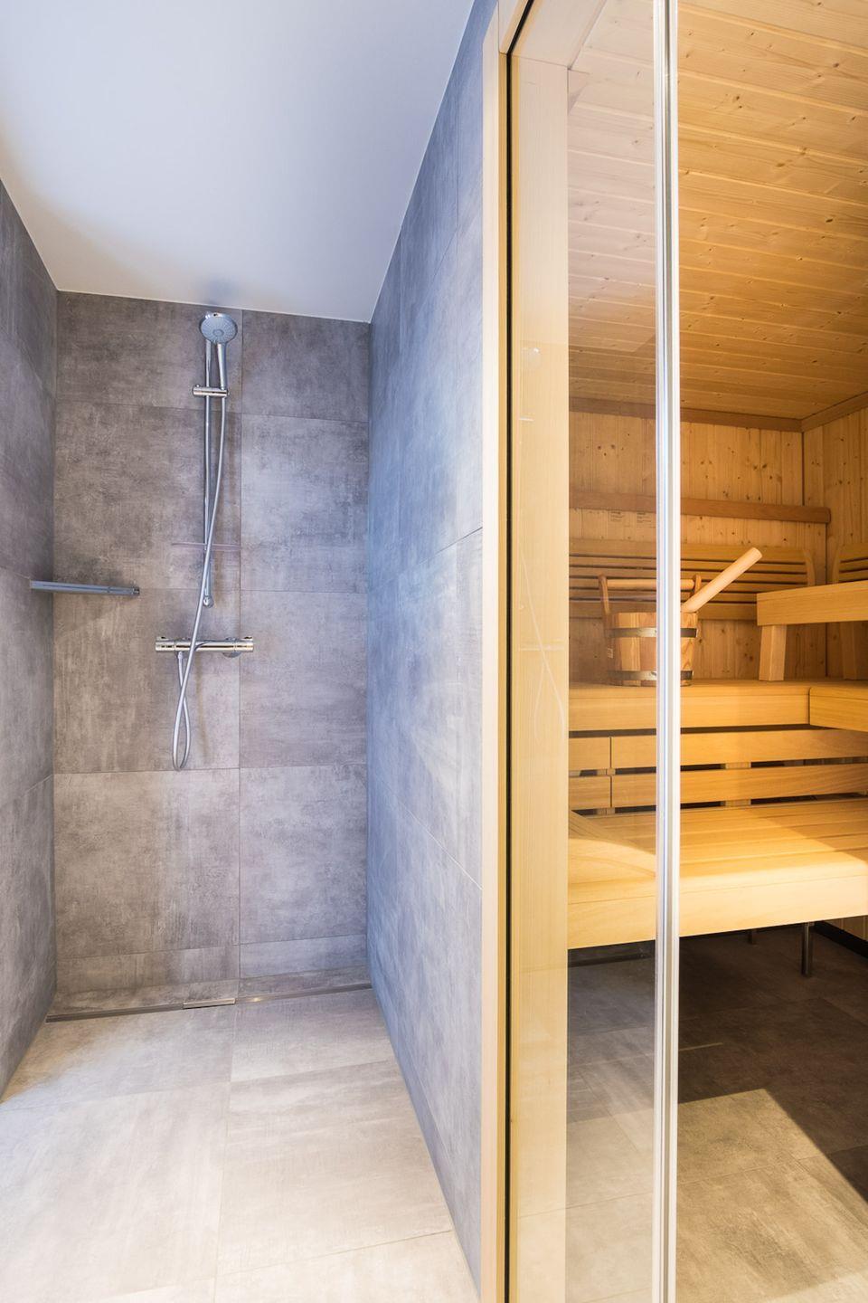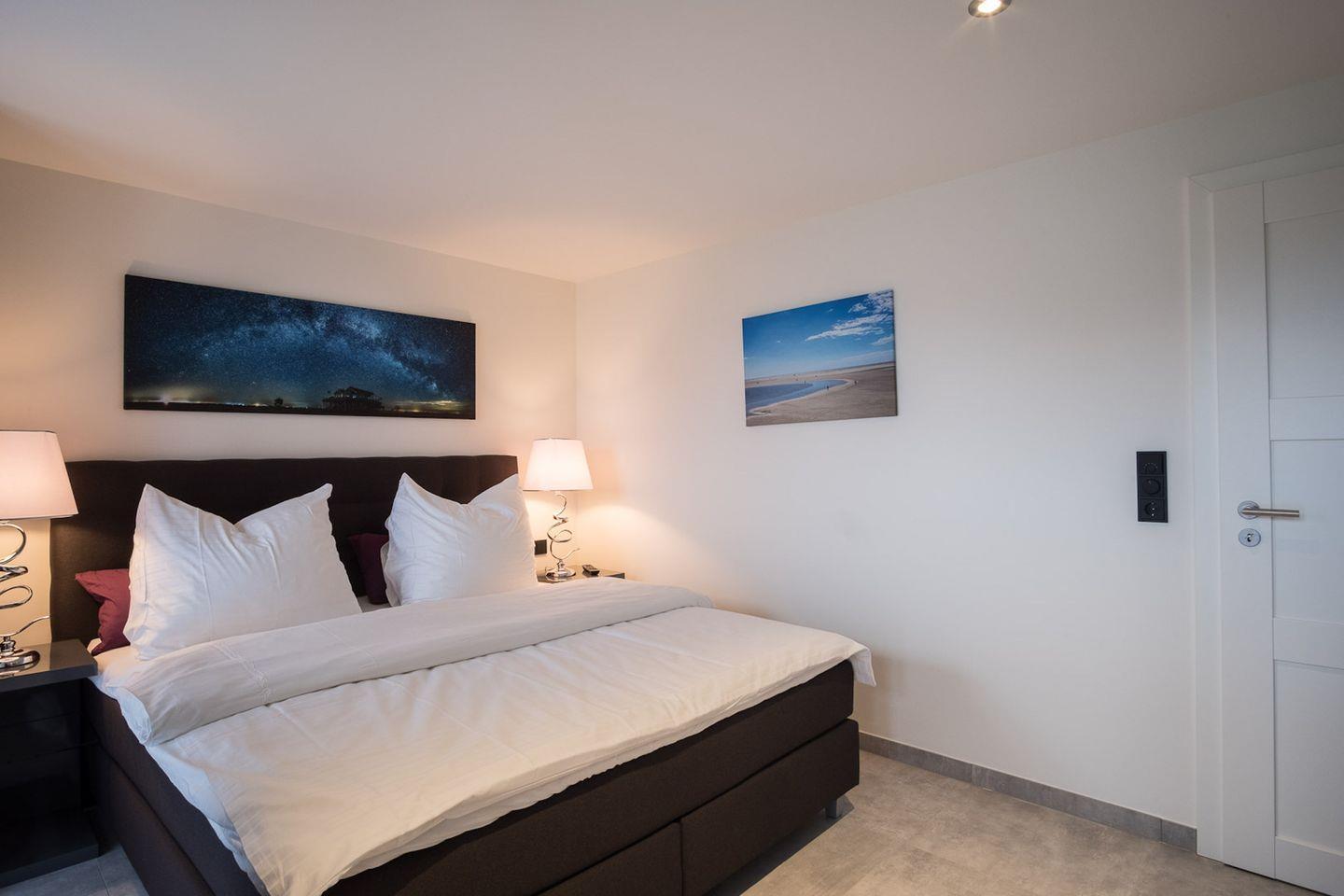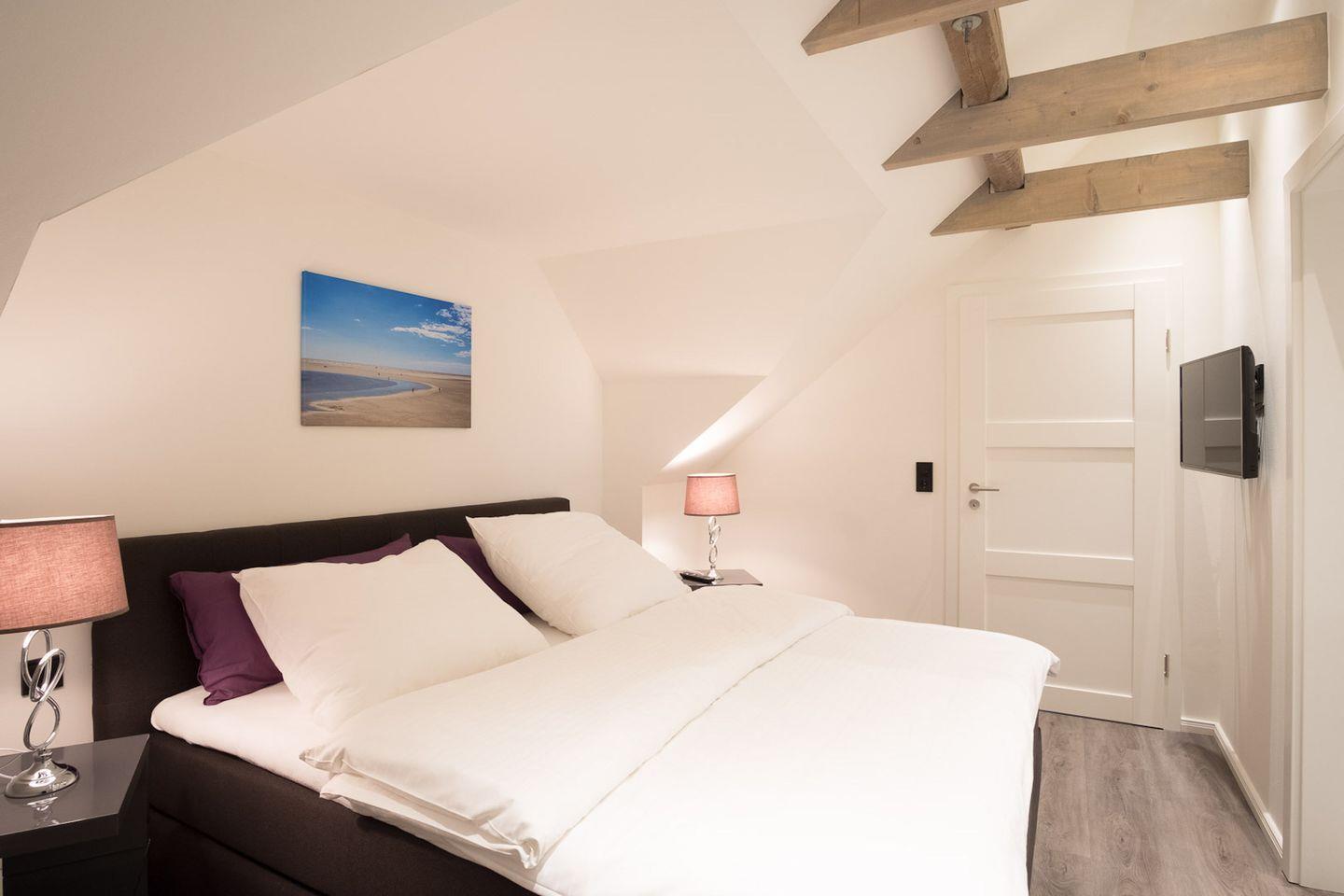 Im Erdgeschoss ist ebenso ein Doppelschlafzimmer mit TV, sowie ein gegenüberliegendes Duschbad mit WC und eine Sauna mit Zugang in den Garten.