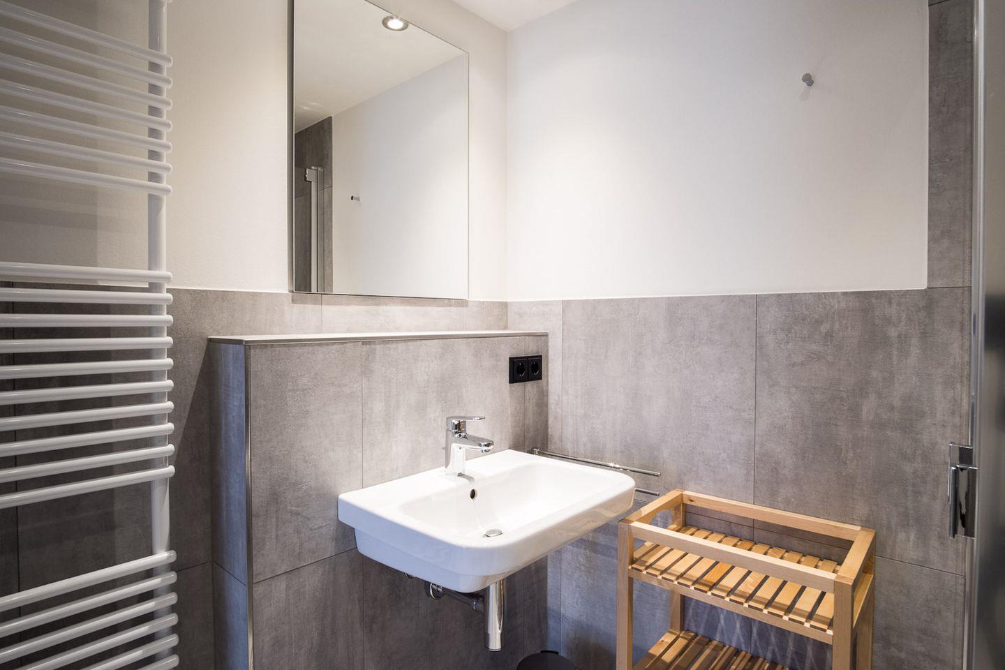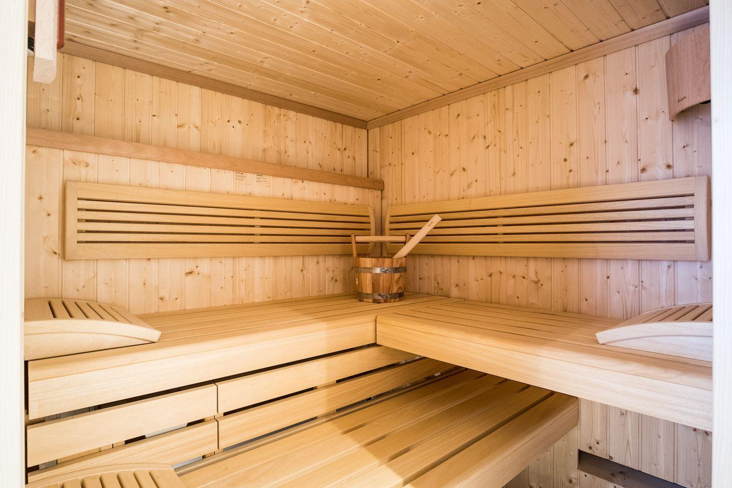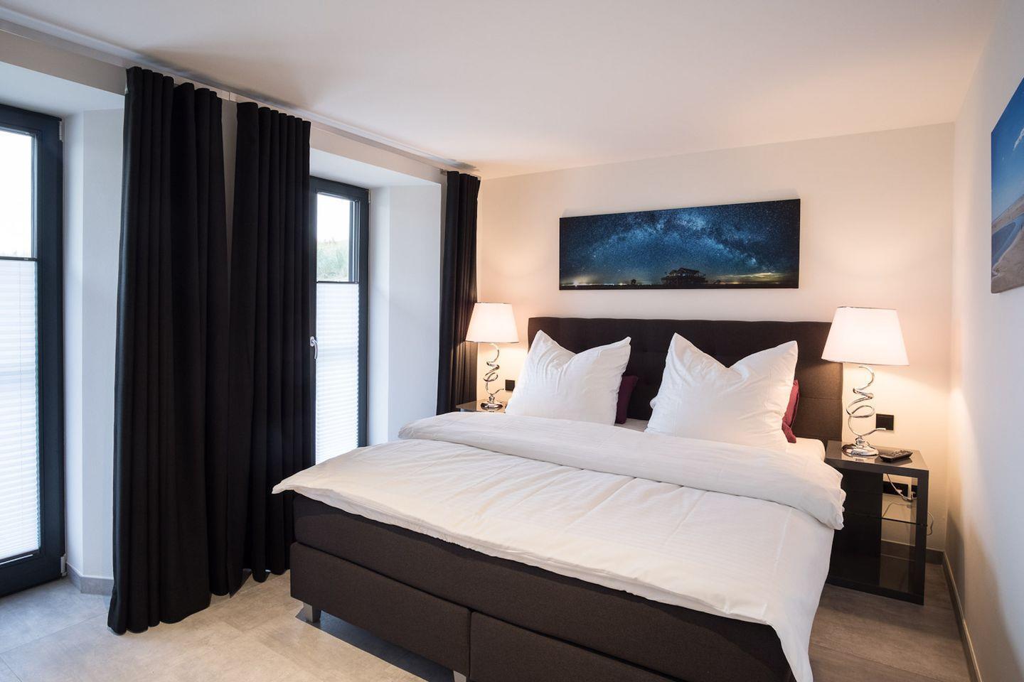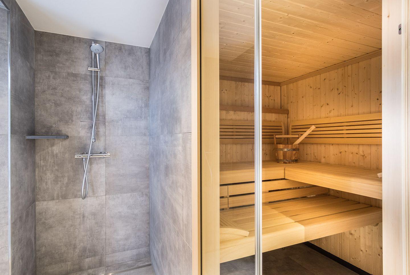 Im Erdgeschoss ist ebenso ein Doppelschlafzimmer mit TV, sowie ein gegenüberliegendes Duschbad mit WC und eine Sauna mit Zugang in den Garten.